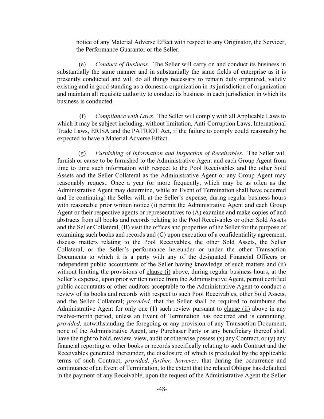 -48- notice of any Material Adverse Effect with respect to any Originator, the Servicer, the Performance Guarantor or the Seller. (e) Conduct of Business. The Seller will carry on and conduct its business in substantially the same manner and in substantially the same fields of enterprise as it is presently conducted and will do all things necessary to remain duly organized, validly existing and in good standing as a domestic organization in its jurisdiction of organization and maintain all requisite authority to conduct its business in each jurisdiction in which its business is conducted. (f) Compliance with Laws. The Seller will comply with all Applicable Laws to which it may be subject including, without limitation, Anti-Corruption Laws, International Trade Laws, ERISA and the PATRIOT Act, if the failure to comply could reasonably be expected to have a Material Adverse Effect. (g) Furnishing of Information and Inspection of Receivables. The Seller will furnish or cause to be furnished to the Administrative Agent and each Group Agent from time to time such information with respect to the Pool Receivables and the other Sold Assets and the Seller Collateral as the Administrative Agent or any Group Agent may reasonably request. Once a year (or more frequently, which may be as often as the Administrative Agent may determine, while an Event of Termination shall have occurred and be continuing) the Seller will, at the Seller’s expense, during regular business hours with reasonable prior written notice (i) permit the Administrative Agent and each Group Agent or their respective agents or representatives to (A) examine and make copies of and abstracts from all books and records relating to the Pool Receivables or other Sold Assets and the Seller Collateral, (B) visit the offices and properties of the Seller for the purpose of examining such books and records and (C) upon execution of a confidentiality agreement, discuss matters relating to the Pool Receivables, the other Sold Assets, the Seller Collateral, or the Seller’s performance hereunder or under the other Transaction Documents to which it is a party with any of the designated Financial Officers or independent public accountants of the Seller having knowledge of such matters and (ii) without limiting the provisions of clause (i) above, during regular business hours, at the Seller’s expense, upon prior written notice from the Administrative Agent, permit certified public accountants or other auditors acceptable to the Administrative Agent to conduct a review of its books and records with respect to such Pool Receivables, other Sold Assets, and the Seller Collateral; provided, that the Seller shall be required to reimburse the Administrative Agent for only one (1) such review pursuant to clause (ii) above in any twelve-month period, unless an Event of Termination has occurred and is continuing; provided, notwithstanding the foregoing or any provision of any Transaction Document, none of the Administrative Agent, any Purchaser Party or any beneficiary thereof shall have the right to hold, review, view, audit or otherwise possess (x) any Contract, or (y) any financial reporting or other books or records specifically relating to such Contract and the Receivables generated thereunder, the disclosure of which is precluded by the applicable terms of such Contract; provided, further, however, that during the occurrence and continuance of an Event of Termination, to the extent that the related Obligor has defaulted in the payment of any Receivable, upon the request of the Administrative Agent the Seller