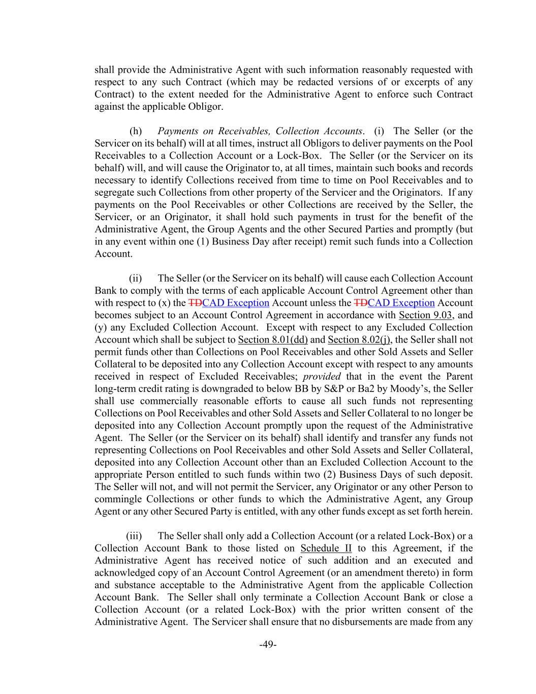 -49- shall provide the Administrative Agent with such information reasonably requested with respect to any such Contract (which may be redacted versions of or excerpts of any Contract) to the extent needed for the Administrative Agent to enforce such Contract against the applicable Obligor. (h) Payments on Receivables, Collection Accounts. (i) The Seller (or the Servicer on its behalf) will at all times, instruct all Obligors to deliver payments on the Pool Receivables to a Collection Account or a Lock-Box. The Seller (or the Servicer on its behalf) will, and will cause the Originator to, at all times, maintain such books and records necessary to identify Collections received from time to time on Pool Receivables and to segregate such Collections from other property of the Servicer and the Originators. If any payments on the Pool Receivables or other Collections are received by the Seller, the Servicer, or an Originator, it shall hold such payments in trust for the benefit of the Administrative Agent, the Group Agents and the other Secured Parties and promptly (but in any event within one (1) Business Day after receipt) remit such funds into a Collection Account. (ii) The Seller (or the Servicer on its behalf) will cause each Collection Account Bank to comply with the terms of each applicable Account Control Agreement other than with respect to (x) the TDCAD Exception Account unless the TDCAD Exception Account becomes subject to an Account Control Agreement in accordance with Section 9.03, and (y) any Excluded Collection Account. Except with respect to any Excluded Collection Account which shall be subject to Section 8.01(dd) and Section 8.02(j), the Seller shall not permit funds other than Collections on Pool Receivables and other Sold Assets and Seller Collateral to be deposited into any Collection Account except with respect to any amounts received in respect of Excluded Receivables; provided that in the event the Parent long-term credit rating is downgraded to below BB by S&P or Ba2 by Moody’s, the Seller shall use commercially reasonable efforts to cause all such funds not representing Collections on Pool Receivables and other Sold Assets and Seller Collateral to no longer be deposited into any Collection Account promptly upon the request of the Administrative Agent. The Seller (or the Servicer on its behalf) shall identify and transfer any funds not representing Collections on Pool Receivables and other Sold Assets and Seller Collateral, deposited into any Collection Account other than an Excluded Collection Account to the appropriate Person entitled to such funds within two (2) Business Days of such deposit. The Seller will not, and will not permit the Servicer, any Originator or any other Person to commingle Collections or other funds to which the Administrative Agent, any Group Agent or any other Secured Party is entitled, with any other funds except as set forth herein. (iii) The Seller shall only add a Collection Account (or a related Lock-Box) or a Collection Account Bank to those listed on Schedule II to this Agreement, if the Administrative Agent has received notice of such addition and an executed and acknowledged copy of an Account Control Agreement (or an amendment thereto) in form and substance acceptable to the Administrative Agent from the applicable Collection Account Bank. The Seller shall only terminate a Collection Account Bank or close a Collection Account (or a related Lock-Box) with the prior written consent of the Administrative Agent. The Servicer shall ensure that no disbursements are made from any