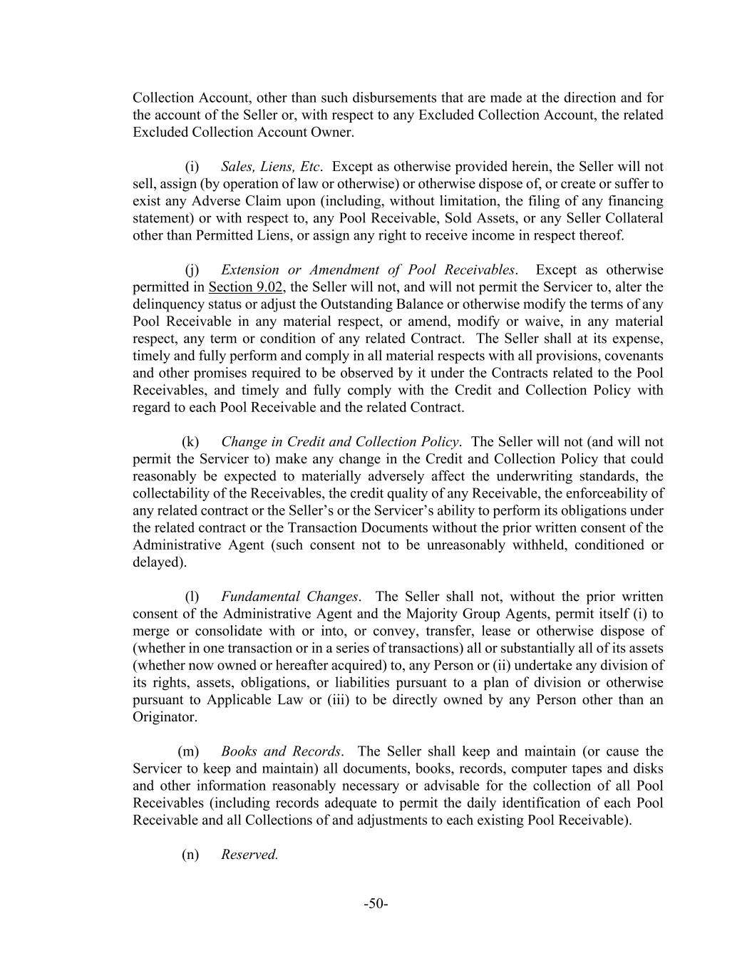 -50- Collection Account, other than such disbursements that are made at the direction and for the account of the Seller or, with respect to any Excluded Collection Account, the related Excluded Collection Account Owner. (i) Sales, Liens, Etc. Except as otherwise provided herein, the Seller will not sell, assign (by operation of law or otherwise) or otherwise dispose of, or create or suffer to exist any Adverse Claim upon (including, without limitation, the filing of any financing statement) or with respect to, any Pool Receivable, Sold Assets, or any Seller Collateral other than Permitted Liens, or assign any right to receive income in respect thereof. (j) Extension or Amendment of Pool Receivables. Except as otherwise permitted in Section 9.02, the Seller will not, and will not permit the Servicer to, alter the delinquency status or adjust the Outstanding Balance or otherwise modify the terms of any Pool Receivable in any material respect, or amend, modify or waive, in any material respect, any term or condition of any related Contract. The Seller shall at its expense, timely and fully perform and comply in all material respects with all provisions, covenants and other promises required to be observed by it under the Contracts related to the Pool Receivables, and timely and fully comply with the Credit and Collection Policy with regard to each Pool Receivable and the related Contract. (k) Change in Credit and Collection Policy. The Seller will not (and will not permit the Servicer to) make any change in the Credit and Collection Policy that could reasonably be expected to materially adversely affect the underwriting standards, the collectability of the Receivables, the credit quality of any Receivable, the enforceability of any related contract or the Seller’s or the Servicer’s ability to perform its obligations under the related contract or the Transaction Documents without the prior written consent of the Administrative Agent (such consent not to be unreasonably withheld, conditioned or delayed). (l) Fundamental Changes. The Seller shall not, without the prior written consent of the Administrative Agent and the Majority Group Agents, permit itself (i) to merge or consolidate with or into, or convey, transfer, lease or otherwise dispose of (whether in one transaction or in a series of transactions) all or substantially all of its assets (whether now owned or hereafter acquired) to, any Person or (ii) undertake any division of its rights, assets, obligations, or liabilities pursuant to a plan of division or otherwise pursuant to Applicable Law or (iii) to be directly owned by any Person other than an Originator. (m) Books and Records. The Seller shall keep and maintain (or cause the Servicer to keep and maintain) all documents, books, records, computer tapes and disks and other information reasonably necessary or advisable for the collection of all Pool Receivables (including records adequate to permit the daily identification of each Pool Receivable and all Collections of and adjustments to each existing Pool Receivable). (n) Reserved.