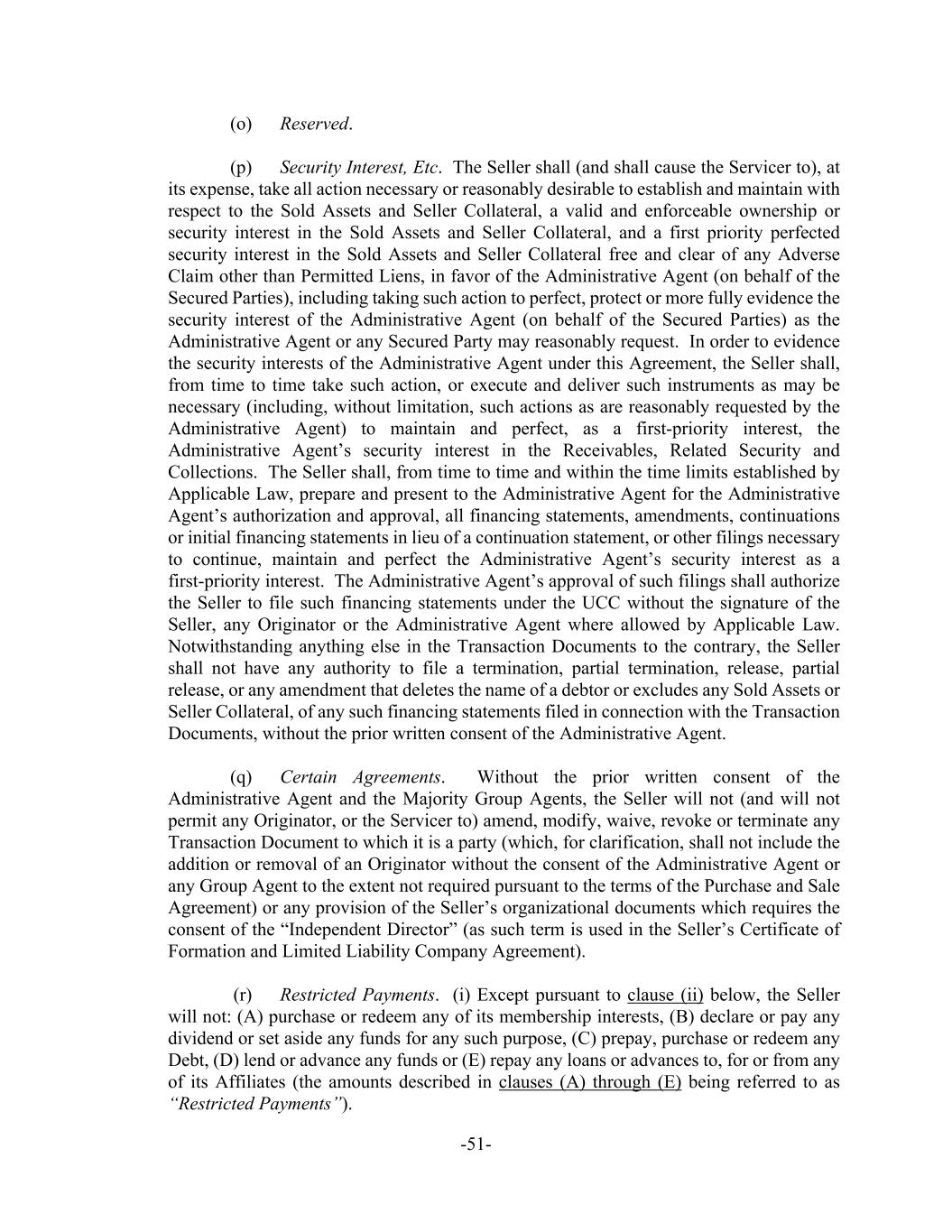 -51- (o) Reserved. (p) Security Interest, Etc. The Seller shall (and shall cause the Servicer to), at its expense, take all action necessary or reasonably desirable to establish and maintain with respect to the Sold Assets and Seller Collateral, a valid and enforceable ownership or security interest in the Sold Assets and Seller Collateral, and a first priority perfected security interest in the Sold Assets and Seller Collateral free and clear of any Adverse Claim other than Permitted Liens, in favor of the Administrative Agent (on behalf of the Secured Parties), including taking such action to perfect, protect or more fully evidence the security interest of the Administrative Agent (on behalf of the Secured Parties) as the Administrative Agent or any Secured Party may reasonably request. In order to evidence the security interests of the Administrative Agent under this Agreement, the Seller shall, from time to time take such action, or execute and deliver such instruments as may be necessary (including, without limitation, such actions as are reasonably requested by the Administrative Agent) to maintain and perfect, as a first-priority interest, the Administrative Agent’s security interest in the Receivables, Related Security and Collections. The Seller shall, from time to time and within the time limits established by Applicable Law, prepare and present to the Administrative Agent for the Administrative Agent’s authorization and approval, all financing statements, amendments, continuations or initial financing statements in lieu of a continuation statement, or other filings necessary to continue, maintain and perfect the Administrative Agent’s security interest as a first-priority interest. The Administrative Agent’s approval of such filings shall authorize the Seller to file such financing statements under the UCC without the signature of the Seller, any Originator or the Administrative Agent where allowed by Applicable Law. Notwithstanding anything else in the Transaction Documents to the contrary, the Seller shall not have any authority to file a termination, partial termination, release, partial release, or any amendment that deletes the name of a debtor or excludes any Sold Assets or Seller Collateral, of any such financing statements filed in connection with the Transaction Documents, without the prior written consent of the Administrative Agent. (q) Certain Agreements. Without the prior written consent of the Administrative Agent and the Majority Group Agents, the Seller will not (and will not permit any Originator, or the Servicer to) amend, modify, waive, revoke or terminate any Transaction Document to which it is a party (which, for clarification, shall not include the addition or removal of an Originator without the consent of the Administrative Agent or any Group Agent to the extent not required pursuant to the terms of the Purchase and Sale Agreement) or any provision of the Seller’s organizational documents which requires the consent of the “Independent Director” (as such term is used in the Seller’s Certificate of Formation and Limited Liability Company Agreement). (r) Restricted Payments. (i) Except pursuant to clause (ii) below, the Seller will not: (A) purchase or redeem any of its membership interests, (B) declare or pay any dividend or set aside any funds for any such purpose, (C) prepay, purchase or redeem any Debt, (D) lend or advance any funds or (E) repay any loans or advances to, for or from any of its Affiliates (the amounts described in clauses (A) through (E) being referred to as “Restricted Payments”).