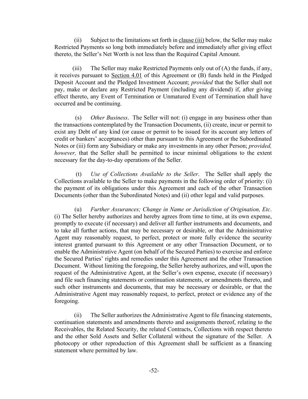 -52- (ii) Subject to the limitations set forth in clause (iii) below, the Seller may make Restricted Payments so long both immediately before and immediately after giving effect thereto, the Seller’s Net Worth is not less than the Required Capital Amount. (iii) The Seller may make Restricted Payments only out of (A) the funds, if any, it receives pursuant to Section 4.01 of this Agreement or (B) funds held in the Pledged Deposit Account and the Pledged Investment Account; provided that the Seller shall not pay, make or declare any Restricted Payment (including any dividend) if, after giving effect thereto, any Event of Termination or Unmatured Event of Termination shall have occurred and be continuing. (s) Other Business. The Seller will not: (i) engage in any business other than the transactions contemplated by the Transaction Documents, (ii) create, incur or permit to exist any Debt of any kind (or cause or permit to be issued for its account any letters of credit or bankers’ acceptances) other than pursuant to this Agreement or the Subordinated Notes or (iii) form any Subsidiary or make any investments in any other Person; provided, however, that the Seller shall be permitted to incur minimal obligations to the extent necessary for the day-to-day operations of the Seller. (t) Use of Collections Available to the Seller. The Seller shall apply the Collections available to the Seller to make payments in the following order of priority: (i) the payment of its obligations under this Agreement and each of the other Transaction Documents (other than the Subordinated Notes) and (ii) other legal and valid purposes. (u) Further Assurances; Change in Name or Jurisdiction of Origination, Etc. (i) The Seller hereby authorizes and hereby agrees from time to time, at its own expense, promptly to execute (if necessary) and deliver all further instruments and documents, and to take all further actions, that may be necessary or desirable, or that the Administrative Agent may reasonably request, to perfect, protect or more fully evidence the security interest granted pursuant to this Agreement or any other Transaction Document, or to enable the Administrative Agent (on behalf of the Secured Parties) to exercise and enforce the Secured Parties’ rights and remedies under this Agreement and the other Transaction Document. Without limiting the foregoing, the Seller hereby authorizes, and will, upon the request of the Administrative Agent, at the Seller’s own expense, execute (if necessary) and file such financing statements or continuation statements, or amendments thereto, and such other instruments and documents, that may be necessary or desirable, or that the Administrative Agent may reasonably request, to perfect, protect or evidence any of the foregoing. (ii) The Seller authorizes the Administrative Agent to file financing statements, continuation statements and amendments thereto and assignments thereof, relating to the Receivables, the Related Security, the related Contracts, Collections with respect thereto and the other Sold Assets and Seller Collateral without the signature of the Seller. A photocopy or other reproduction of this Agreement shall be sufficient as a financing statement where permitted by law.