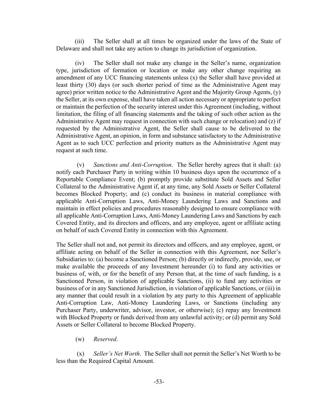 -53- (iii) The Seller shall at all times be organized under the laws of the State of Delaware and shall not take any action to change its jurisdiction of organization. (iv) The Seller shall not make any change in the Seller’s name, organization type, jurisdiction of formation or location or make any other change requiring an amendment of any UCC financing statements unless (x) the Seller shall have provided at least thirty (30) days (or such shorter period of time as the Administrative Agent may agree) prior written notice to the Administrative Agent and the Majority Group Agents, (y) the Seller, at its own expense, shall have taken all action necessary or appropriate to perfect or maintain the perfection of the security interest under this Agreement (including, without limitation, the filing of all financing statements and the taking of such other action as the Administrative Agent may request in connection with such change or relocation) and (z) if requested by the Administrative Agent, the Seller shall cause to be delivered to the Administrative Agent, an opinion, in form and substance satisfactory to the Administrative Agent as to such UCC perfection and priority matters as the Administrative Agent may request at such time. (v) Sanctions and Anti-Corruption. The Seller hereby agrees that it shall: (a) notify each Purchaser Party in writing within 10 business days upon the occurrence of a Reportable Compliance Event; (b) promptly provide substitute Sold Assets and Seller Collateral to the Administrative Agent if, at any time, any Sold Assets or Seller Collateral becomes Blocked Property; and (c) conduct its business in material compliance with applicable Anti-Corruption Laws, Anti-Money Laundering Laws and Sanctions and maintain in effect policies and procedures reasonably designed to ensure compliance with all applicable Anti-Corruption Laws, Anti-Money Laundering Laws and Sanctions by each Covered Entity, and its directors and officers, and any employee, agent or affiliate acting on behalf of such Covered Entity in connection with this Agreement. The Seller shall not and, not permit its directors and officers, and any employee, agent, or affiliate acting on behalf of the Seller in connection with this Agreement, nor Seller’s Subsidiaries to: (a) become a Sanctioned Person; (b) directly or indirectly, provide, use, or make available the proceeds of any Investment hereunder (i) to fund any activities or business of, with, or for the benefit of any Person that, at the time of such funding, is a Sanctioned Person, in violation of applicable Sanctions, (ii) to fund any activities or business of or in any Sanctioned Jurisdiction, in violation of applicable Sanctions, or (iii) in any manner that could result in a violation by any party to this Agreement of applicable Anti-Corruption Law, Anti-Money Laundering Laws, or Sanctions (including any Purchaser Party, underwriter, advisor, investor, or otherwise); (c) repay any Investment with Blocked Property or funds derived from any unlawful activity; or (d) permit any Sold Assets or Seller Collateral to become Blocked Property. (w) Reserved. (x) Seller’s Net Worth. The Seller shall not permit the Seller’s Net Worth to be less than the Required Capital Amount.