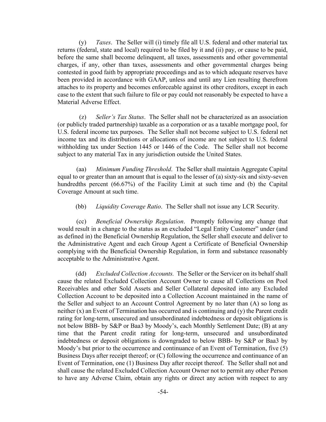 -54- (y) Taxes. The Seller will (i) timely file all U.S. federal and other material tax returns (federal, state and local) required to be filed by it and (ii) pay, or cause to be paid, before the same shall become delinquent, all taxes, assessments and other governmental charges, if any, other than taxes, assessments and other governmental charges being contested in good faith by appropriate proceedings and as to which adequate reserves have been provided in accordance with GAAP, unless and until any Lien resulting therefrom attaches to its property and becomes enforceable against its other creditors, except in each case to the extent that such failure to file or pay could not reasonably be expected to have a Material Adverse Effect. (z) Seller’s Tax Status. The Seller shall not be characterized as an association (or publicly traded partnership) taxable as a corporation or as a taxable mortgage pool, for U.S. federal income tax purposes. The Seller shall not become subject to U.S. federal net income tax and its distributions or allocations of income are not subject to U.S. federal withholding tax under Section 1445 or 1446 of the Code. The Seller shall not become subject to any material Tax in any jurisdiction outside the United States. (aa) Minimum Funding Threshold. The Seller shall maintain Aggregate Capital equal to or greater than an amount that is equal to the lesser of (a) sixty-six and sixty-seven hundredths percent (66.67%) of the Facility Limit at such time and (b) the Capital Coverage Amount at such time. (bb) Liquidity Coverage Ratio. The Seller shall not issue any LCR Security. (cc) Beneficial Ownership Regulation. Promptly following any change that would result in a change to the status as an excluded “Legal Entity Customer” under (and as defined in) the Beneficial Ownership Regulation, the Seller shall execute and deliver to the Administrative Agent and each Group Agent a Certificate of Beneficial Ownership complying with the Beneficial Ownership Regulation, in form and substance reasonably acceptable to the Administrative Agent. (dd) Excluded Collection Accounts. The Seller or the Servicer on its behalf shall cause the related Excluded Collection Account Owner to cause all Collections on Pool Receivables and other Sold Assets and Seller Collateral deposited into any Excluded Collection Account to be deposited into a Collection Account maintained in the name of the Seller and subject to an Account Control Agreement by no later than (A) so long as neither (x) an Event of Termination has occurred and is continuing and (y) the Parent credit rating for long-term, unsecured and unsubordinated indebtedness or deposit obligations is not below BBB- by S&P or Baa3 by Moody’s, each Monthly Settlement Date; (B) at any time that the Parent credit rating for long-term, unsecured and unsubordinated indebtedness or deposit obligations is downgraded to below BBB- by S&P or Baa3 by Moody’s but prior to the occurrence and continuance of an Event of Termination, five (5) Business Days after receipt thereof; or (C) following the occurrence and continuance of an Event of Termination, one (1) Business Day after receipt thereof. The Seller shall not and shall cause the related Excluded Collection Account Owner not to permit any other Person to have any Adverse Claim, obtain any rights or direct any action with respect to any