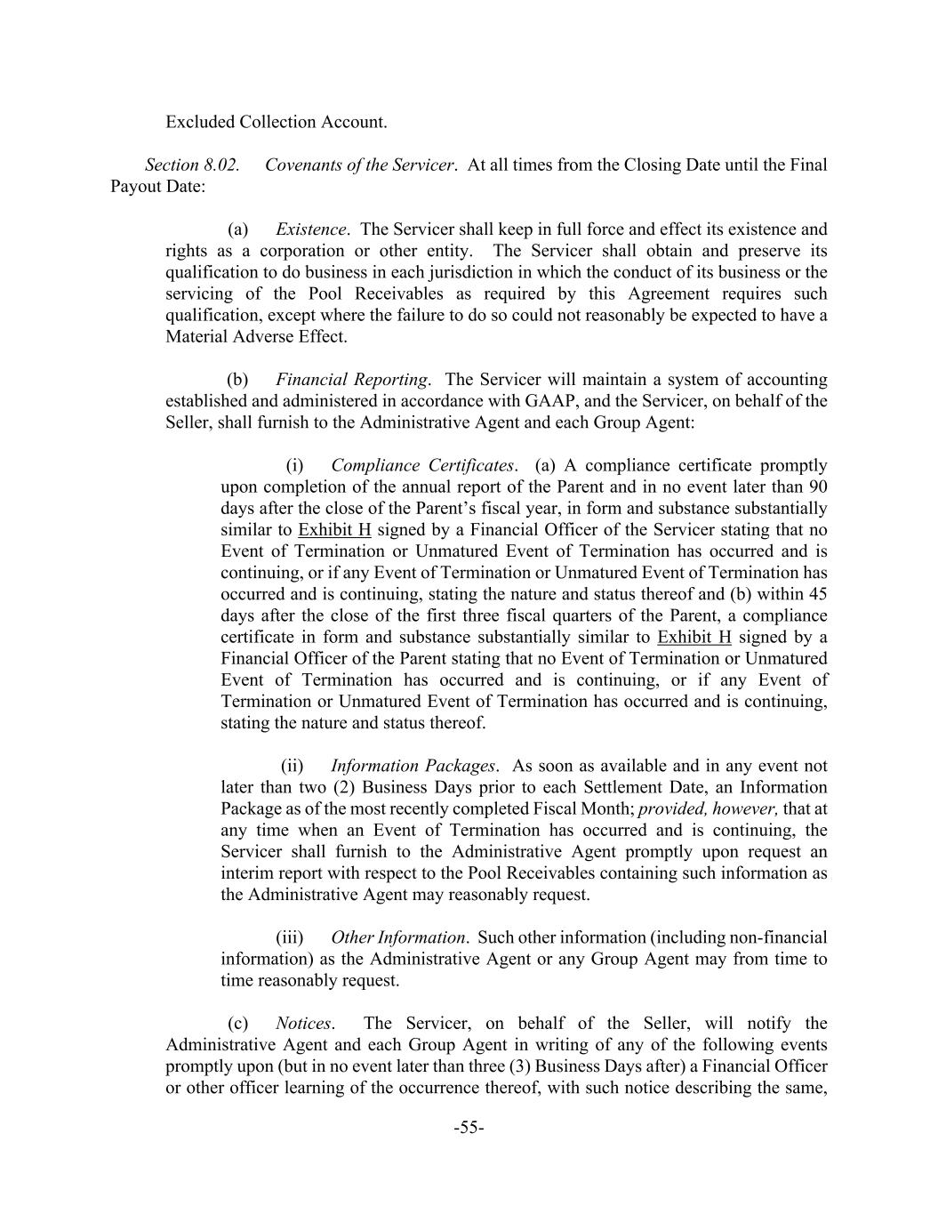 -55- Excluded Collection Account. Section 8.02. Covenants of the Servicer. At all times from the Closing Date until the Final Payout Date: (a) Existence. The Servicer shall keep in full force and effect its existence and rights as a corporation or other entity. The Servicer shall obtain and preserve its qualification to do business in each jurisdiction in which the conduct of its business or the servicing of the Pool Receivables as required by this Agreement requires such qualification, except where the failure to do so could not reasonably be expected to have a Material Adverse Effect. (b) Financial Reporting. The Servicer will maintain a system of accounting established and administered in accordance with GAAP, and the Servicer, on behalf of the Seller, shall furnish to the Administrative Agent and each Group Agent: (i) Compliance Certificates. (a) A compliance certificate promptly upon completion of the annual report of the Parent and in no event later than 90 days after the close of the Parent’s fiscal year, in form and substance substantially similar to Exhibit H signed by a Financial Officer of the Servicer stating that no Event of Termination or Unmatured Event of Termination has occurred and is continuing, or if any Event of Termination or Unmatured Event of Termination has occurred and is continuing, stating the nature and status thereof and (b) within 45 days after the close of the first three fiscal quarters of the Parent, a compliance certificate in form and substance substantially similar to Exhibit H signed by a Financial Officer of the Parent stating that no Event of Termination or Unmatured Event of Termination has occurred and is continuing, or if any Event of Termination or Unmatured Event of Termination has occurred and is continuing, stating the nature and status thereof. (ii) Information Packages. As soon as available and in any event not later than two (2) Business Days prior to each Settlement Date, an Information Package as of the most recently completed Fiscal Month; provided, however, that at any time when an Event of Termination has occurred and is continuing, the Servicer shall furnish to the Administrative Agent promptly upon request an interim report with respect to the Pool Receivables containing such information as the Administrative Agent may reasonably request. (iii) Other Information. Such other information (including non-financial information) as the Administrative Agent or any Group Agent may from time to time reasonably request. (c) Notices. The Servicer, on behalf of the Seller, will notify the Administrative Agent and each Group Agent in writing of any of the following events promptly upon (but in no event later than three (3) Business Days after) a Financial Officer or other officer learning of the occurrence thereof, with such notice describing the same,
