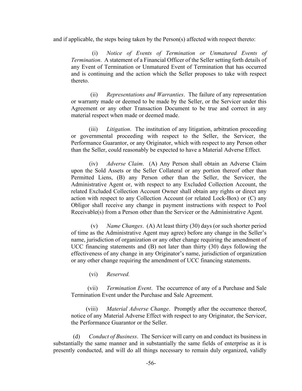 -56- and if applicable, the steps being taken by the Person(s) affected with respect thereto: (i) Notice of Events of Termination or Unmatured Events of Termination. A statement of a Financial Officer of the Seller setting forth details of any Event of Termination or Unmatured Event of Termination that has occurred and is continuing and the action which the Seller proposes to take with respect thereto. (ii) Representations and Warranties. The failure of any representation or warranty made or deemed to be made by the Seller, or the Servicer under this Agreement or any other Transaction Document to be true and correct in any material respect when made or deemed made. (iii) Litigation. The institution of any litigation, arbitration proceeding or governmental proceeding with respect to the Seller, the Servicer, the Performance Guarantor, or any Originator, which with respect to any Person other than the Seller, could reasonably be expected to have a Material Adverse Effect. (iv) Adverse Claim. (A) Any Person shall obtain an Adverse Claim upon the Sold Assets or the Seller Collateral or any portion thereof other than Permitted Liens, (B) any Person other than the Seller, the Servicer, the Administrative Agent or, with respect to any Excluded Collection Account, the related Excluded Collection Account Owner shall obtain any rights or direct any action with respect to any Collection Account (or related Lock-Box) or (C) any Obligor shall receive any change in payment instructions with respect to Pool Receivable(s) from a Person other than the Servicer or the Administrative Agent. (v) Name Changes. (A) At least thirty (30) days (or such shorter period of time as the Administrative Agent may agree) before any change in the Seller’s name, jurisdiction of organization or any other change requiring the amendment of UCC financing statements and (B) not later than thirty (30) days following the effectiveness of any change in any Originator’s name, jurisdiction of organization or any other change requiring the amendment of UCC financing statements. (vi) Reserved. (vii) Termination Event. The occurrence of any of a Purchase and Sale Termination Event under the Purchase and Sale Agreement. (viii) Material Adverse Change. Promptly after the occurrence thereof, notice of any Material Adverse Effect with respect to any Originator, the Servicer, the Performance Guarantor or the Seller. (d) Conduct of Business. The Servicer will carry on and conduct its business in substantially the same manner and in substantially the same fields of enterprise as it is presently conducted, and will do all things necessary to remain duly organized, validly