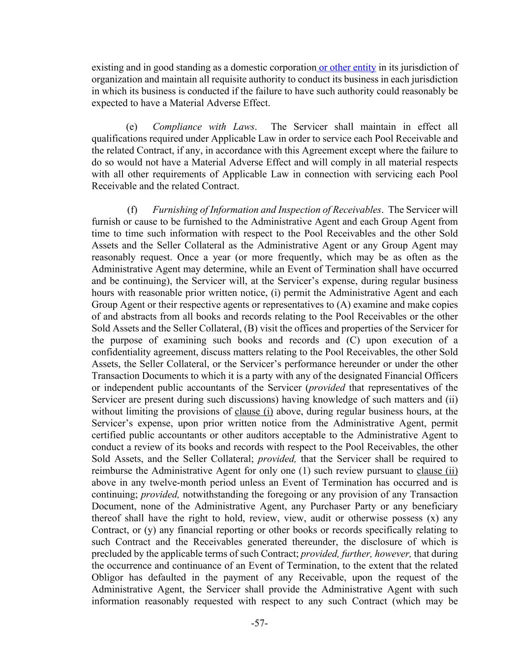 -57- existing and in good standing as a domestic corporation or other entity in its jurisdiction of organization and maintain all requisite authority to conduct its business in each jurisdiction in which its business is conducted if the failure to have such authority could reasonably be expected to have a Material Adverse Effect. (e) Compliance with Laws. The Servicer shall maintain in effect all qualifications required under Applicable Law in order to service each Pool Receivable and the related Contract, if any, in accordance with this Agreement except where the failure to do so would not have a Material Adverse Effect and will comply in all material respects with all other requirements of Applicable Law in connection with servicing each Pool Receivable and the related Contract. (f) Furnishing of Information and Inspection of Receivables. The Servicer will furnish or cause to be furnished to the Administrative Agent and each Group Agent from time to time such information with respect to the Pool Receivables and the other Sold Assets and the Seller Collateral as the Administrative Agent or any Group Agent may reasonably request. Once a year (or more frequently, which may be as often as the Administrative Agent may determine, while an Event of Termination shall have occurred and be continuing), the Servicer will, at the Servicer’s expense, during regular business hours with reasonable prior written notice, (i) permit the Administrative Agent and each Group Agent or their respective agents or representatives to (A) examine and make copies of and abstracts from all books and records relating to the Pool Receivables or the other Sold Assets and the Seller Collateral, (B) visit the offices and properties of the Servicer for the purpose of examining such books and records and (C) upon execution of a confidentiality agreement, discuss matters relating to the Pool Receivables, the other Sold Assets, the Seller Collateral, or the Servicer’s performance hereunder or under the other Transaction Documents to which it is a party with any of the designated Financial Officers or independent public accountants of the Servicer (provided that representatives of the Servicer are present during such discussions) having knowledge of such matters and (ii) without limiting the provisions of clause (i) above, during regular business hours, at the Servicer’s expense, upon prior written notice from the Administrative Agent, permit certified public accountants or other auditors acceptable to the Administrative Agent to conduct a review of its books and records with respect to the Pool Receivables, the other Sold Assets, and the Seller Collateral; provided, that the Servicer shall be required to reimburse the Administrative Agent for only one (1) such review pursuant to clause (ii) above in any twelve-month period unless an Event of Termination has occurred and is continuing; provided, notwithstanding the foregoing or any provision of any Transaction Document, none of the Administrative Agent, any Purchaser Party or any beneficiary thereof shall have the right to hold, review, view, audit or otherwise possess (x) any Contract, or (y) any financial reporting or other books or records specifically relating to such Contract and the Receivables generated thereunder, the disclosure of which is precluded by the applicable terms of such Contract; provided, further, however, that during the occurrence and continuance of an Event of Termination, to the extent that the related Obligor has defaulted in the payment of any Receivable, upon the request of the Administrative Agent, the Servicer shall provide the Administrative Agent with such information reasonably requested with respect to any such Contract (which may be