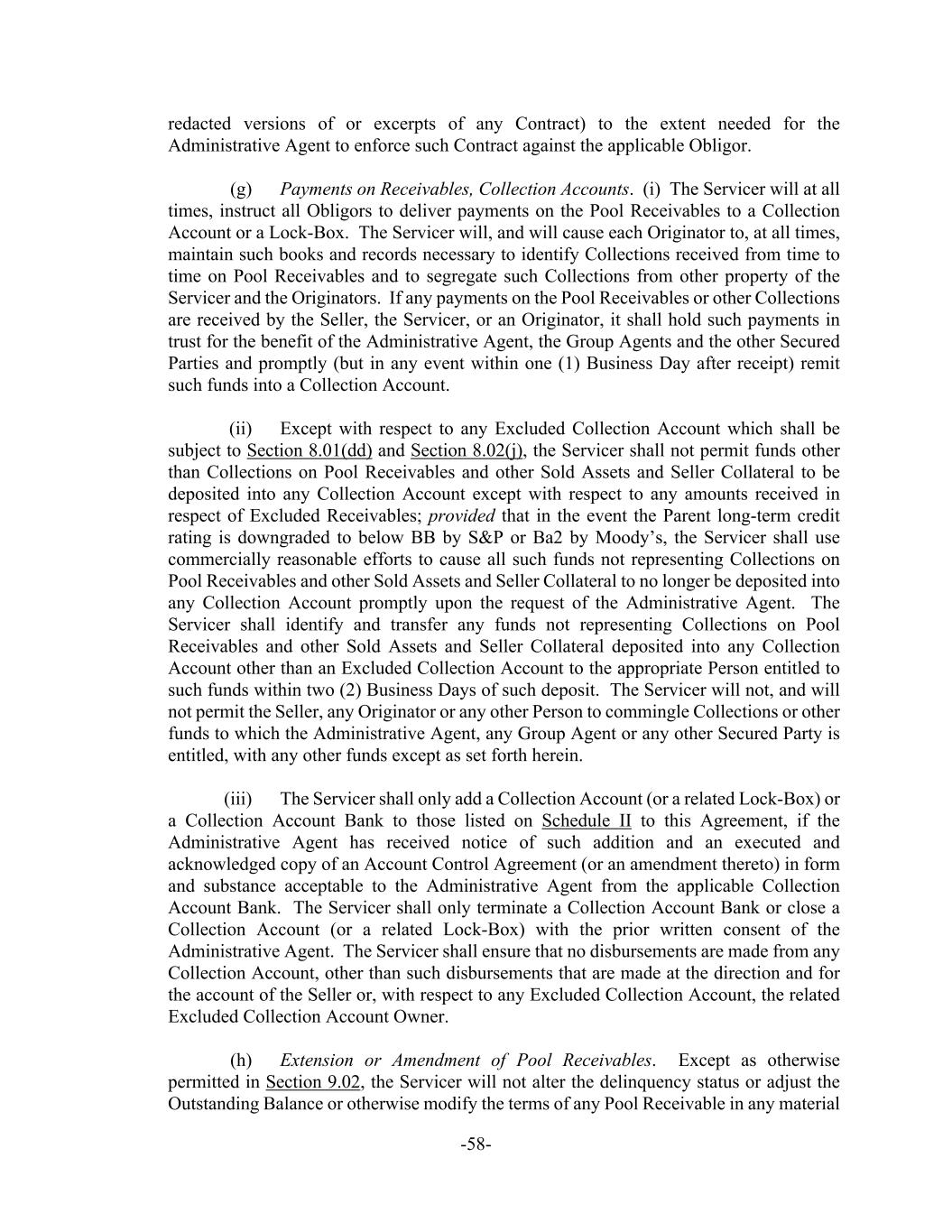-58- redacted versions of or excerpts of any Contract) to the extent needed for the Administrative Agent to enforce such Contract against the applicable Obligor. (g) Payments on Receivables, Collection Accounts. (i) The Servicer will at all times, instruct all Obligors to deliver payments on the Pool Receivables to a Collection Account or a Lock-Box. The Servicer will, and will cause each Originator to, at all times, maintain such books and records necessary to identify Collections received from time to time on Pool Receivables and to segregate such Collections from other property of the Servicer and the Originators. If any payments on the Pool Receivables or other Collections are received by the Seller, the Servicer, or an Originator, it shall hold such payments in trust for the benefit of the Administrative Agent, the Group Agents and the other Secured Parties and promptly (but in any event within one (1) Business Day after receipt) remit such funds into a Collection Account. (ii) Except with respect to any Excluded Collection Account which shall be subject to Section 8.01(dd) and Section 8.02(j), the Servicer shall not permit funds other than Collections on Pool Receivables and other Sold Assets and Seller Collateral to be deposited into any Collection Account except with respect to any amounts received in respect of Excluded Receivables; provided that in the event the Parent long-term credit rating is downgraded to below BB by S&P or Ba2 by Moody’s, the Servicer shall use commercially reasonable efforts to cause all such funds not representing Collections on Pool Receivables and other Sold Assets and Seller Collateral to no longer be deposited into any Collection Account promptly upon the request of the Administrative Agent. The Servicer shall identify and transfer any funds not representing Collections on Pool Receivables and other Sold Assets and Seller Collateral deposited into any Collection Account other than an Excluded Collection Account to the appropriate Person entitled to such funds within two (2) Business Days of such deposit. The Servicer will not, and will not permit the Seller, any Originator or any other Person to commingle Collections or other funds to which the Administrative Agent, any Group Agent or any other Secured Party is entitled, with any other funds except as set forth herein. (iii) The Servicer shall only add a Collection Account (or a related Lock-Box) or a Collection Account Bank to those listed on Schedule II to this Agreement, if the Administrative Agent has received notice of such addition and an executed and acknowledged copy of an Account Control Agreement (or an amendment thereto) in form and substance acceptable to the Administrative Agent from the applicable Collection Account Bank. The Servicer shall only terminate a Collection Account Bank or close a Collection Account (or a related Lock-Box) with the prior written consent of the Administrative Agent. The Servicer shall ensure that no disbursements are made from any Collection Account, other than such disbursements that are made at the direction and for the account of the Seller or, with respect to any Excluded Collection Account, the related Excluded Collection Account Owner. (h) Extension or Amendment of Pool Receivables. Except as otherwise permitted in Section 9.02, the Servicer will not alter the delinquency status or adjust the Outstanding Balance or otherwise modify the terms of any Pool Receivable in any material