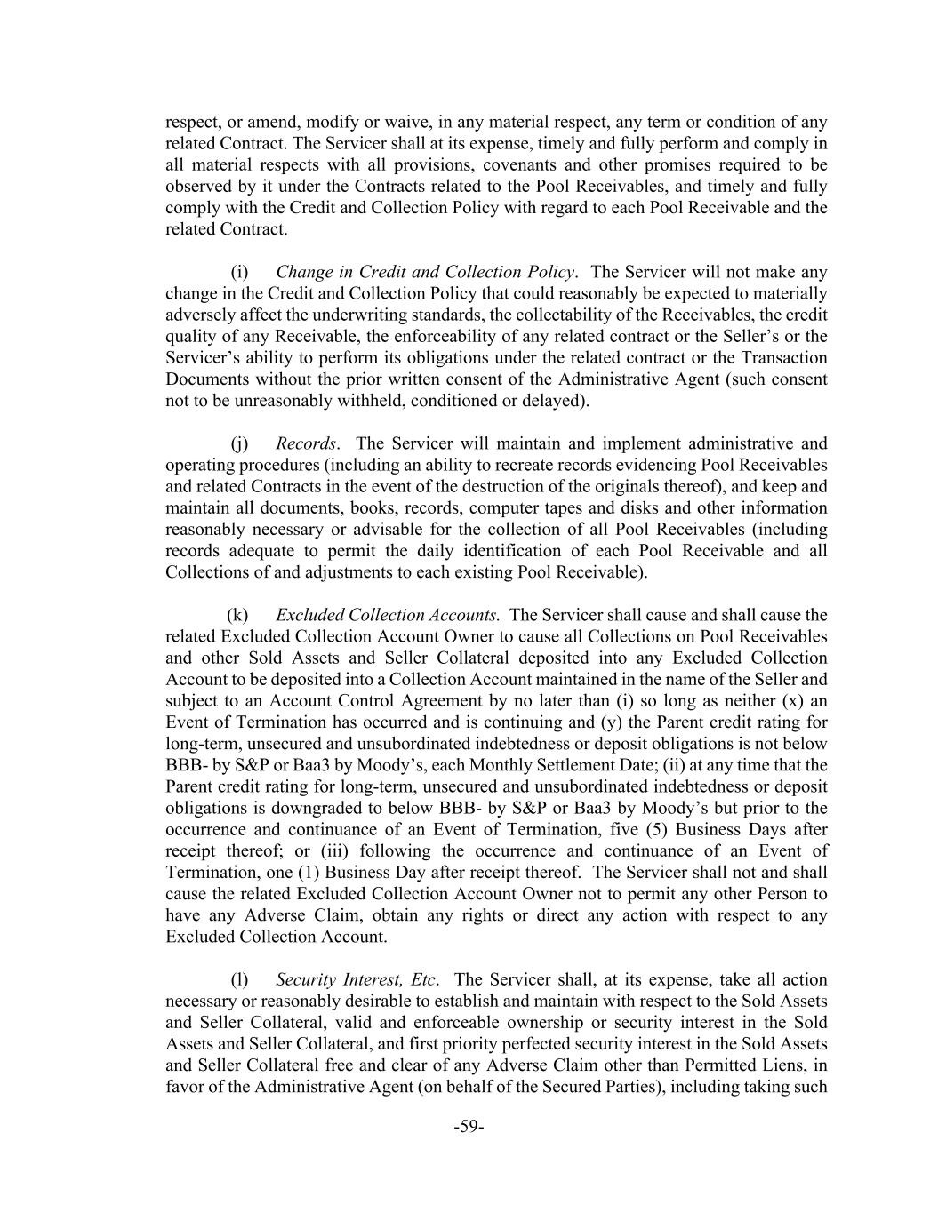 -59- respect, or amend, modify or waive, in any material respect, any term or condition of any related Contract. The Servicer shall at its expense, timely and fully perform and comply in all material respects with all provisions, covenants and other promises required to be observed by it under the Contracts related to the Pool Receivables, and timely and fully comply with the Credit and Collection Policy with regard to each Pool Receivable and the related Contract. (i) Change in Credit and Collection Policy. The Servicer will not make any change in the Credit and Collection Policy that could reasonably be expected to materially adversely affect the underwriting standards, the collectability of the Receivables, the credit quality of any Receivable, the enforceability of any related contract or the Seller’s or the Servicer’s ability to perform its obligations under the related contract or the Transaction Documents without the prior written consent of the Administrative Agent (such consent not to be unreasonably withheld, conditioned or delayed). (j) Records. The Servicer will maintain and implement administrative and operating procedures (including an ability to recreate records evidencing Pool Receivables and related Contracts in the event of the destruction of the originals thereof), and keep and maintain all documents, books, records, computer tapes and disks and other information reasonably necessary or advisable for the collection of all Pool Receivables (including records adequate to permit the daily identification of each Pool Receivable and all Collections of and adjustments to each existing Pool Receivable). (k) Excluded Collection Accounts. The Servicer shall cause and shall cause the related Excluded Collection Account Owner to cause all Collections on Pool Receivables and other Sold Assets and Seller Collateral deposited into any Excluded Collection Account to be deposited into a Collection Account maintained in the name of the Seller and subject to an Account Control Agreement by no later than (i) so long as neither (x) an Event of Termination has occurred and is continuing and (y) the Parent credit rating for long-term, unsecured and unsubordinated indebtedness or deposit obligations is not below BBB- by S&P or Baa3 by Moody’s, each Monthly Settlement Date; (ii) at any time that the Parent credit rating for long-term, unsecured and unsubordinated indebtedness or deposit obligations is downgraded to below BBB- by S&P or Baa3 by Moody’s but prior to the occurrence and continuance of an Event of Termination, five (5) Business Days after receipt thereof; or (iii) following the occurrence and continuance of an Event of Termination, one (1) Business Day after receipt thereof. The Servicer shall not and shall cause the related Excluded Collection Account Owner not to permit any other Person to have any Adverse Claim, obtain any rights or direct any action with respect to any Excluded Collection Account. (l) Security Interest, Etc. The Servicer shall, at its expense, take all action necessary or reasonably desirable to establish and maintain with respect to the Sold Assets and Seller Collateral, valid and enforceable ownership or security interest in the Sold Assets and Seller Collateral, and first priority perfected security interest in the Sold Assets and Seller Collateral free and clear of any Adverse Claim other than Permitted Liens, in favor of the Administrative Agent (on behalf of the Secured Parties), including taking such
