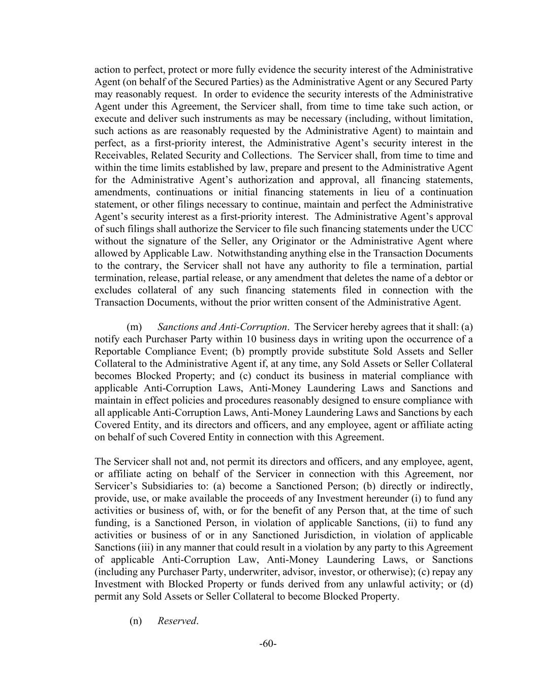 -60- action to perfect, protect or more fully evidence the security interest of the Administrative Agent (on behalf of the Secured Parties) as the Administrative Agent or any Secured Party may reasonably request. In order to evidence the security interests of the Administrative Agent under this Agreement, the Servicer shall, from time to time take such action, or execute and deliver such instruments as may be necessary (including, without limitation, such actions as are reasonably requested by the Administrative Agent) to maintain and perfect, as a first-priority interest, the Administrative Agent’s security interest in the Receivables, Related Security and Collections. The Servicer shall, from time to time and within the time limits established by law, prepare and present to the Administrative Agent for the Administrative Agent’s authorization and approval, all financing statements, amendments, continuations or initial financing statements in lieu of a continuation statement, or other filings necessary to continue, maintain and perfect the Administrative Agent’s security interest as a first-priority interest. The Administrative Agent’s approval of such filings shall authorize the Servicer to file such financing statements under the UCC without the signature of the Seller, any Originator or the Administrative Agent where allowed by Applicable Law. Notwithstanding anything else in the Transaction Documents to the contrary, the Servicer shall not have any authority to file a termination, partial termination, release, partial release, or any amendment that deletes the name of a debtor or excludes collateral of any such financing statements filed in connection with the Transaction Documents, without the prior written consent of the Administrative Agent. (m) Sanctions and Anti-Corruption. The Servicer hereby agrees that it shall: (a) notify each Purchaser Party within 10 business days in writing upon the occurrence of a Reportable Compliance Event; (b) promptly provide substitute Sold Assets and Seller Collateral to the Administrative Agent if, at any time, any Sold Assets or Seller Collateral becomes Blocked Property; and (c) conduct its business in material compliance with applicable Anti-Corruption Laws, Anti-Money Laundering Laws and Sanctions and maintain in effect policies and procedures reasonably designed to ensure compliance with all applicable Anti-Corruption Laws, Anti-Money Laundering Laws and Sanctions by each Covered Entity, and its directors and officers, and any employee, agent or affiliate acting on behalf of such Covered Entity in connection with this Agreement. The Servicer shall not and, not permit its directors and officers, and any employee, agent, or affiliate acting on behalf of the Servicer in connection with this Agreement, nor Servicer’s Subsidiaries to: (a) become a Sanctioned Person; (b) directly or indirectly, provide, use, or make available the proceeds of any Investment hereunder (i) to fund any activities or business of, with, or for the benefit of any Person that, at the time of such funding, is a Sanctioned Person, in violation of applicable Sanctions, (ii) to fund any activities or business of or in any Sanctioned Jurisdiction, in violation of applicable Sanctions (iii) in any manner that could result in a violation by any party to this Agreement of applicable Anti-Corruption Law, Anti-Money Laundering Laws, or Sanctions (including any Purchaser Party, underwriter, advisor, investor, or otherwise); (c) repay any Investment with Blocked Property or funds derived from any unlawful activity; or (d) permit any Sold Assets or Seller Collateral to become Blocked Property. (n) Reserved.