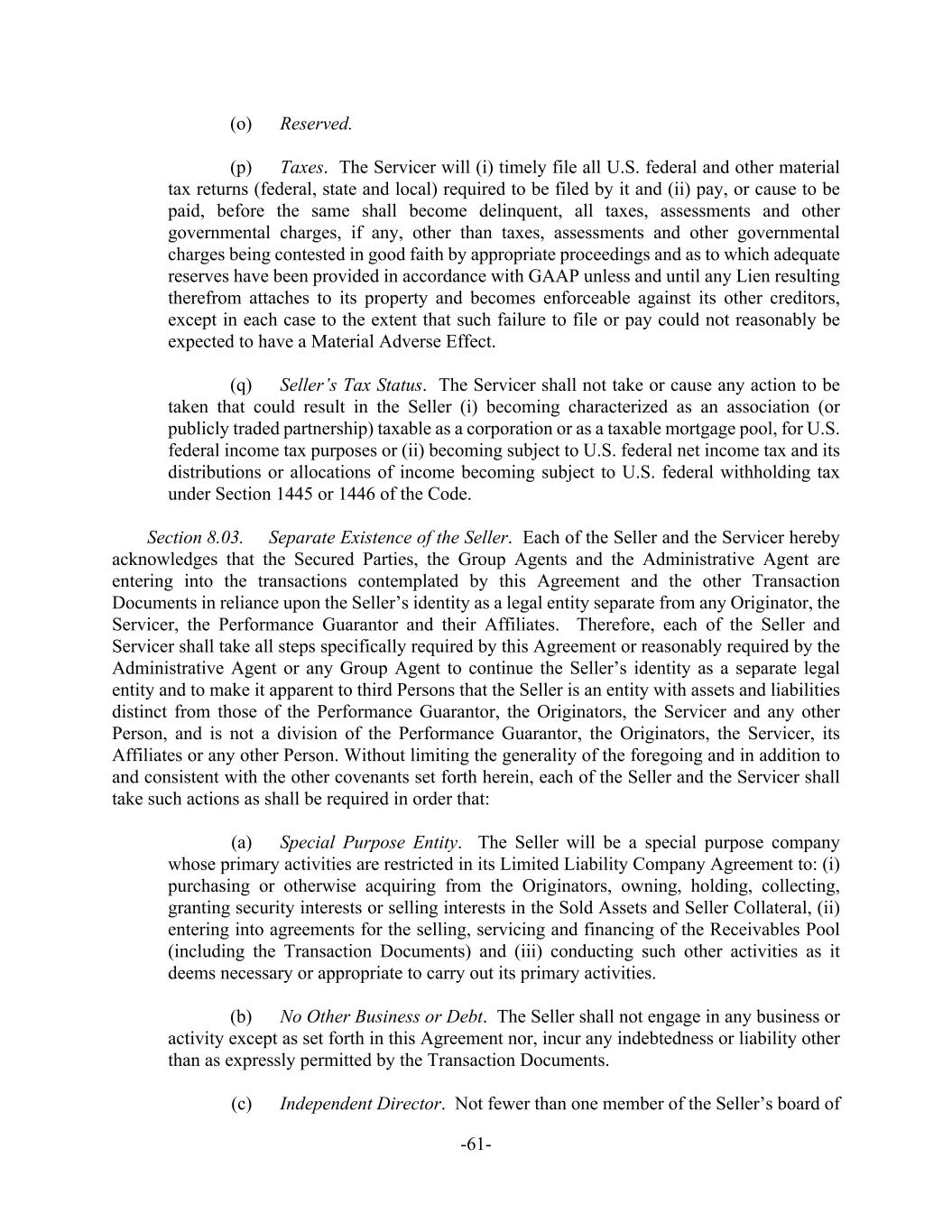-61- (o) Reserved. (p) Taxes. The Servicer will (i) timely file all U.S. federal and other material tax returns (federal, state and local) required to be filed by it and (ii) pay, or cause to be paid, before the same shall become delinquent, all taxes, assessments and other governmental charges, if any, other than taxes, assessments and other governmental charges being contested in good faith by appropriate proceedings and as to which adequate reserves have been provided in accordance with GAAP unless and until any Lien resulting therefrom attaches to its property and becomes enforceable against its other creditors, except in each case to the extent that such failure to file or pay could not reasonably be expected to have a Material Adverse Effect. (q) Seller’s Tax Status. The Servicer shall not take or cause any action to be taken that could result in the Seller (i) becoming characterized as an association (or publicly traded partnership) taxable as a corporation or as a taxable mortgage pool, for U.S. federal income tax purposes or (ii) becoming subject to U.S. federal net income tax and its distributions or allocations of income becoming subject to U.S. federal withholding tax under Section 1445 or 1446 of the Code. Section 8.03. Separate Existence of the Seller. Each of the Seller and the Servicer hereby acknowledges that the Secured Parties, the Group Agents and the Administrative Agent are entering into the transactions contemplated by this Agreement and the other Transaction Documents in reliance upon the Seller’s identity as a legal entity separate from any Originator, the Servicer, the Performance Guarantor and their Affiliates. Therefore, each of the Seller and Servicer shall take all steps specifically required by this Agreement or reasonably required by the Administrative Agent or any Group Agent to continue the Seller’s identity as a separate legal entity and to make it apparent to third Persons that the Seller is an entity with assets and liabilities distinct from those of the Performance Guarantor, the Originators, the Servicer and any other Person, and is not a division of the Performance Guarantor, the Originators, the Servicer, its Affiliates or any other Person. Without limiting the generality of the foregoing and in addition to and consistent with the other covenants set forth herein, each of the Seller and the Servicer shall take such actions as shall be required in order that: (a) Special Purpose Entity. The Seller will be a special purpose company whose primary activities are restricted in its Limited Liability Company Agreement to: (i) purchasing or otherwise acquiring from the Originators, owning, holding, collecting, granting security interests or selling interests in the Sold Assets and Seller Collateral, (ii) entering into agreements for the selling, servicing and financing of the Receivables Pool (including the Transaction Documents) and (iii) conducting such other activities as it deems necessary or appropriate to carry out its primary activities. (b) No Other Business or Debt. The Seller shall not engage in any business or activity except as set forth in this Agreement nor, incur any indebtedness or liability other than as expressly permitted by the Transaction Documents. (c) Independent Director. Not fewer than one member of the Seller’s board of