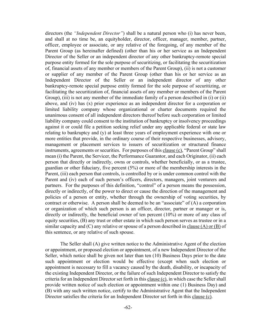 -62- directors (the “Independent Director”) shall be a natural person who (i) has never been, and shall at no time be, an equityholder, director, officer, manager, member, partner, officer, employee or associate, or any relative of the foregoing, of any member of the Parent Group (as hereinafter defined) (other than his or her service as an Independent Director of the Seller or an independent director of any other bankruptcy-remote special purpose entity formed for the sole purpose of securitizing, or facilitating the securitization of, financial assets of any member or members of the Parent Group), (ii) is not a customer or supplier of any member of the Parent Group (other than his or her service as an Independent Director of the Seller or an independent director of any other bankruptcy-remote special purpose entity formed for the sole purpose of securitizing, or facilitating the securitization of, financial assets of any member or members of the Parent Group), (iii) is not any member of the immediate family of a person described in (i) or (ii) above, and (iv) has (x) prior experience as an independent director for a corporation or limited liability company whose organizational or charter documents required the unanimous consent of all independent directors thereof before such corporation or limited liability company could consent to the institution of bankruptcy or insolvency proceedings against it or could file a petition seeking relief under any applicable federal or state law relating to bankruptcy and (y) at least three years of employment experience with one or more entities that provide, in the ordinary course of their respective businesses, advisory, management or placement services to issuers of securitization or structured finance instruments, agreements or securities. For purposes of this clause (c), “Parent Group” shall mean (i) the Parent, the Servicer, the Performance Guarantor, and each Originator, (ii) each person that directly or indirectly, owns or controls, whether beneficially, or as a trustee, guardian or other fiduciary, five percent (5%) or more of the membership interests in the Parent, (iii) each person that controls, is controlled by or is under common control with the Parent and (iv) each of such person’s officers, directors, managers, joint venturers and partners. For the purposes of this definition, “control” of a person means the possession, directly or indirectly, of the power to direct or cause the direction of the management and policies of a person or entity, whether through the ownership of voting securities, by contract or otherwise. A person shall be deemed to be an “associate” of (A) a corporation or organization of which such person is an officer, director, partner or manager or is, directly or indirectly, the beneficial owner of ten percent (10%) or more of any class of equity securities, (B) any trust or other estate in which such person serves as trustee or in a similar capacity and (C) any relative or spouse of a person described in clause (A) or (B) of this sentence, or any relative of such spouse. The Seller shall (A) give written notice to the Administrative Agent of the election or appointment, or proposed election or appointment, of a new Independent Director of the Seller, which notice shall be given not later than ten (10) Business Days prior to the date such appointment or election would be effective (except when such election or appointment is necessary to fill a vacancy caused by the death, disability, or incapacity of the existing Independent Director, or the failure of such Independent Director to satisfy the criteria for an Independent Director set forth in this clause (c), in which case the Seller shall provide written notice of such election or appointment within one (1) Business Day) and (B) with any such written notice, certify to the Administrative Agent that the Independent Director satisfies the criteria for an Independent Director set forth in this clause (c).