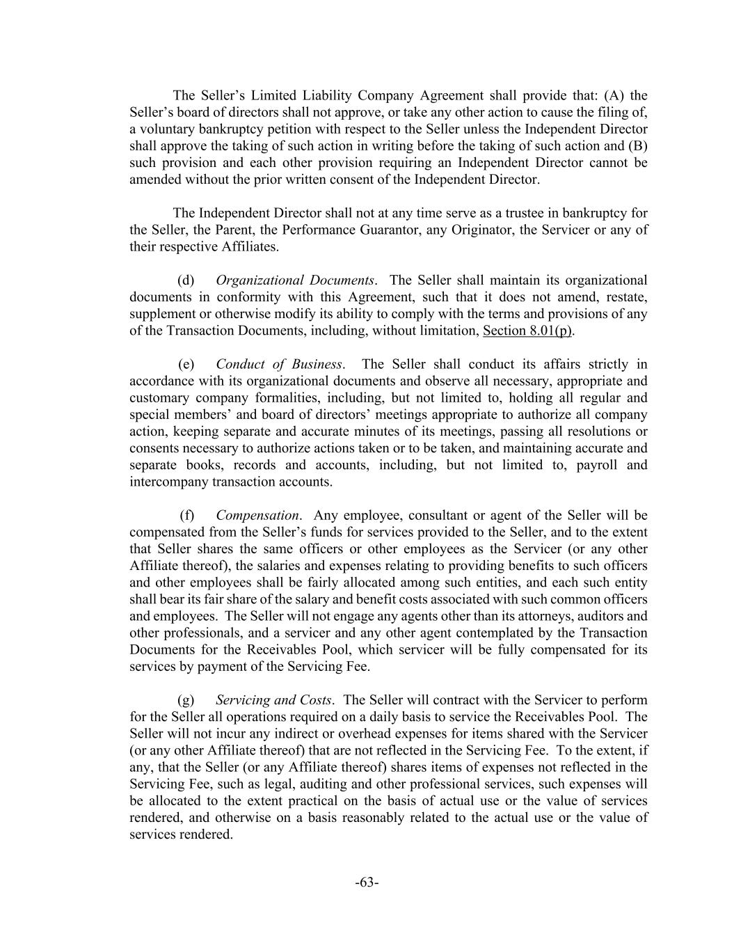 -63- The Seller’s Limited Liability Company Agreement shall provide that: (A) the Seller’s board of directors shall not approve, or take any other action to cause the filing of, a voluntary bankruptcy petition with respect to the Seller unless the Independent Director shall approve the taking of such action in writing before the taking of such action and (B) such provision and each other provision requiring an Independent Director cannot be amended without the prior written consent of the Independent Director. The Independent Director shall not at any time serve as a trustee in bankruptcy for the Seller, the Parent, the Performance Guarantor, any Originator, the Servicer or any of their respective Affiliates. (d) Organizational Documents. The Seller shall maintain its organizational documents in conformity with this Agreement, such that it does not amend, restate, supplement or otherwise modify its ability to comply with the terms and provisions of any of the Transaction Documents, including, without limitation, Section 8.01(p). (e) Conduct of Business. The Seller shall conduct its affairs strictly in accordance with its organizational documents and observe all necessary, appropriate and customary company formalities, including, but not limited to, holding all regular and special members’ and board of directors’ meetings appropriate to authorize all company action, keeping separate and accurate minutes of its meetings, passing all resolutions or consents necessary to authorize actions taken or to be taken, and maintaining accurate and separate books, records and accounts, including, but not limited to, payroll and intercompany transaction accounts. (f) Compensation. Any employee, consultant or agent of the Seller will be compensated from the Seller’s funds for services provided to the Seller, and to the extent that Seller shares the same officers or other employees as the Servicer (or any other Affiliate thereof), the salaries and expenses relating to providing benefits to such officers and other employees shall be fairly allocated among such entities, and each such entity shall bear its fair share of the salary and benefit costs associated with such common officers and employees. The Seller will not engage any agents other than its attorneys, auditors and other professionals, and a servicer and any other agent contemplated by the Transaction Documents for the Receivables Pool, which servicer will be fully compensated for its services by payment of the Servicing Fee. (g) Servicing and Costs. The Seller will contract with the Servicer to perform for the Seller all operations required on a daily basis to service the Receivables Pool. The Seller will not incur any indirect or overhead expenses for items shared with the Servicer (or any other Affiliate thereof) that are not reflected in the Servicing Fee. To the extent, if any, that the Seller (or any Affiliate thereof) shares items of expenses not reflected in the Servicing Fee, such as legal, auditing and other professional services, such expenses will be allocated to the extent practical on the basis of actual use or the value of services rendered, and otherwise on a basis reasonably related to the actual use or the value of services rendered.