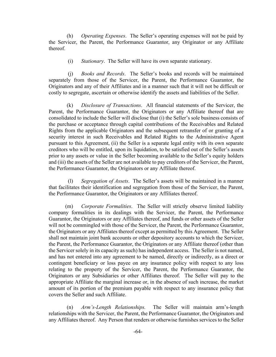 -64- (h) Operating Expenses. The Seller’s operating expenses will not be paid by the Servicer, the Parent, the Performance Guarantor, any Originator or any Affiliate thereof. (i) Stationary. The Seller will have its own separate stationary. (j) Books and Records. The Seller’s books and records will be maintained separately from those of the Servicer, the Parent, the Performance Guarantor, the Originators and any of their Affiliates and in a manner such that it will not be difficult or costly to segregate, ascertain or otherwise identify the assets and liabilities of the Seller. (k) Disclosure of Transactions. All financial statements of the Servicer, the Parent, the Performance Guarantor, the Originators or any Affiliate thereof that are consolidated to include the Seller will disclose that (i) the Seller’s sole business consists of the purchase or acceptance through capital contributions of the Receivables and Related Rights from the applicable Originators and the subsequent retransfer of or granting of a security interest in such Receivables and Related Rights to the Administrative Agent pursuant to this Agreement, (ii) the Seller is a separate legal entity with its own separate creditors who will be entitled, upon its liquidation, to be satisfied out of the Seller’s assets prior to any assets or value in the Seller becoming available to the Seller’s equity holders and (iii) the assets of the Seller are not available to pay creditors of the Servicer, the Parent, the Performance Guarantor, the Originators or any Affiliate thereof. (l) Segregation of Assets. The Seller’s assets will be maintained in a manner that facilitates their identification and segregation from those of the Servicer, the Parent, the Performance Guarantor, the Originators or any Affiliates thereof. (m) Corporate Formalities. The Seller will strictly observe limited liability company formalities in its dealings with the Servicer, the Parent, the Performance Guarantor, the Originators or any Affiliates thereof, and funds or other assets of the Seller will not be commingled with those of the Servicer, the Parent, the Performance Guarantor, the Originators or any Affiliates thereof except as permitted by this Agreement. The Seller shall not maintain joint bank accounts or other depository accounts to which the Servicer, the Parent, the Performance Guarantor, the Originators or any Affiliate thereof (other than the Servicer solely in its capacity as such) has independent access. The Seller is not named, and has not entered into any agreement to be named, directly or indirectly, as a direct or contingent beneficiary or loss payee on any insurance policy with respect to any loss relating to the property of the Servicer, the Parent, the Performance Guarantor, the Originators or any Subsidiaries or other Affiliates thereof. The Seller will pay to the appropriate Affiliate the marginal increase or, in the absence of such increase, the market amount of its portion of the premium payable with respect to any insurance policy that covers the Seller and such Affiliate. (n) Arm’s-Length Relationships. The Seller will maintain arm’s-length relationships with the Servicer, the Parent, the Performance Guarantor, the Originators and any Affiliates thereof. Any Person that renders or otherwise furnishes services to the Seller
