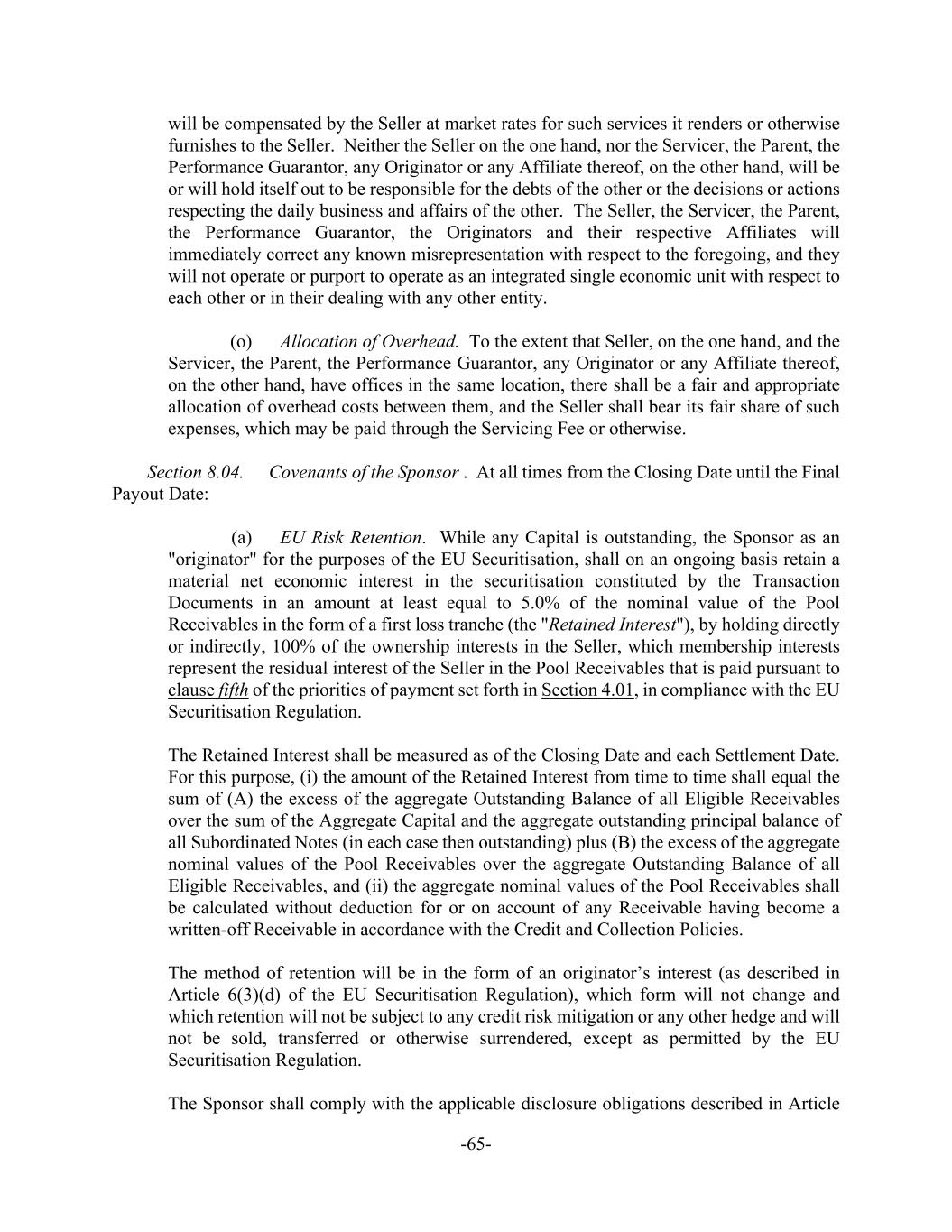 -65- will be compensated by the Seller at market rates for such services it renders or otherwise furnishes to the Seller. Neither the Seller on the one hand, nor the Servicer, the Parent, the Performance Guarantor, any Originator or any Affiliate thereof, on the other hand, will be or will hold itself out to be responsible for the debts of the other or the decisions or actions respecting the daily business and affairs of the other. The Seller, the Servicer, the Parent, the Performance Guarantor, the Originators and their respective Affiliates will immediately correct any known misrepresentation with respect to the foregoing, and they will not operate or purport to operate as an integrated single economic unit with respect to each other or in their dealing with any other entity. (o) Allocation of Overhead. To the extent that Seller, on the one hand, and the Servicer, the Parent, the Performance Guarantor, any Originator or any Affiliate thereof, on the other hand, have offices in the same location, there shall be a fair and appropriate allocation of overhead costs between them, and the Seller shall bear its fair share of such expenses, which may be paid through the Servicing Fee or otherwise. Section 8.04. Covenants of the Sponsor . At all times from the Closing Date until the Final Payout Date: (a) EU Risk Retention. While any Capital is outstanding, the Sponsor as an "originator" for the purposes of the EU Securitisation, shall on an ongoing basis retain a material net economic interest in the securitisation constituted by the Transaction Documents in an amount at least equal to 5.0% of the nominal value of the Pool Receivables in the form of a first loss tranche (the "Retained Interest"), by holding directly or indirectly, 100% of the ownership interests in the Seller, which membership interests represent the residual interest of the Seller in the Pool Receivables that is paid pursuant to clause fifth of the priorities of payment set forth in Section 4.01, in compliance with the EU Securitisation Regulation. The Retained Interest shall be measured as of the Closing Date and each Settlement Date. For this purpose, (i) the amount of the Retained Interest from time to time shall equal the sum of (A) the excess of the aggregate Outstanding Balance of all Eligible Receivables over the sum of the Aggregate Capital and the aggregate outstanding principal balance of all Subordinated Notes (in each case then outstanding) plus (B) the excess of the aggregate nominal values of the Pool Receivables over the aggregate Outstanding Balance of all Eligible Receivables, and (ii) the aggregate nominal values of the Pool Receivables shall be calculated without deduction for or on account of any Receivable having become a written-off Receivable in accordance with the Credit and Collection Policies. The method of retention will be in the form of an originator’s interest (as described in Article 6(3)(d) of the EU Securitisation Regulation), which form will not change and which retention will not be subject to any credit risk mitigation or any other hedge and will not be sold, transferred or otherwise surrendered, except as permitted by the EU Securitisation Regulation. The Sponsor shall comply with the applicable disclosure obligations described in Article