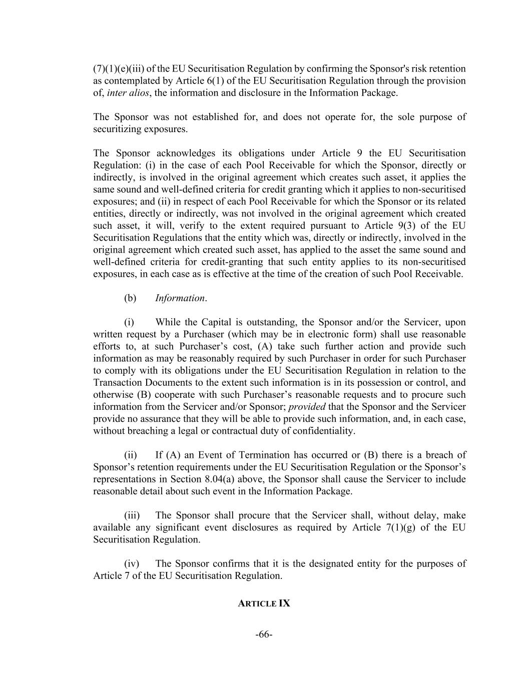 -66- (7)(1)(e)(iii) of the EU Securitisation Regulation by confirming the Sponsor's risk retention as contemplated by Article 6(1) of the EU Securitisation Regulation through the provision of, inter alios, the information and disclosure in the Information Package. The Sponsor was not established for, and does not operate for, the sole purpose of securitizing exposures. The Sponsor acknowledges its obligations under Article 9 the EU Securitisation Regulation: (i) in the case of each Pool Receivable for which the Sponsor, directly or indirectly, is involved in the original agreement which creates such asset, it applies the same sound and well-defined criteria for credit granting which it applies to non-securitised exposures; and (ii) in respect of each Pool Receivable for which the Sponsor or its related entities, directly or indirectly, was not involved in the original agreement which created such asset, it will, verify to the extent required pursuant to Article 9(3) of the EU Securitisation Regulations that the entity which was, directly or indirectly, involved in the original agreement which created such asset, has applied to the asset the same sound and well-defined criteria for credit-granting that such entity applies to its non-securitised exposures, in each case as is effective at the time of the creation of such Pool Receivable. (b) Information. (i) While the Capital is outstanding, the Sponsor and/or the Servicer, upon written request by a Purchaser (which may be in electronic form) shall use reasonable efforts to, at such Purchaser’s cost, (A) take such further action and provide such information as may be reasonably required by such Purchaser in order for such Purchaser to comply with its obligations under the EU Securitisation Regulation in relation to the Transaction Documents to the extent such information is in its possession or control, and otherwise (B) cooperate with such Purchaser’s reasonable requests and to procure such information from the Servicer and/or Sponsor; provided that the Sponsor and the Servicer provide no assurance that they will be able to provide such information, and, in each case, without breaching a legal or contractual duty of confidentiality. (ii) If (A) an Event of Termination has occurred or (B) there is a breach of Sponsor’s retention requirements under the EU Securitisation Regulation or the Sponsor’s representations in Section 8.04(a) above, the Sponsor shall cause the Servicer to include reasonable detail about such event in the Information Package. (iii) The Sponsor shall procure that the Servicer shall, without delay, make available any significant event disclosures as required by Article 7(1)(g) of the EU Securitisation Regulation. (iv) The Sponsor confirms that it is the designated entity for the purposes of Article 7 of the EU Securitisation Regulation. ARTICLE IX