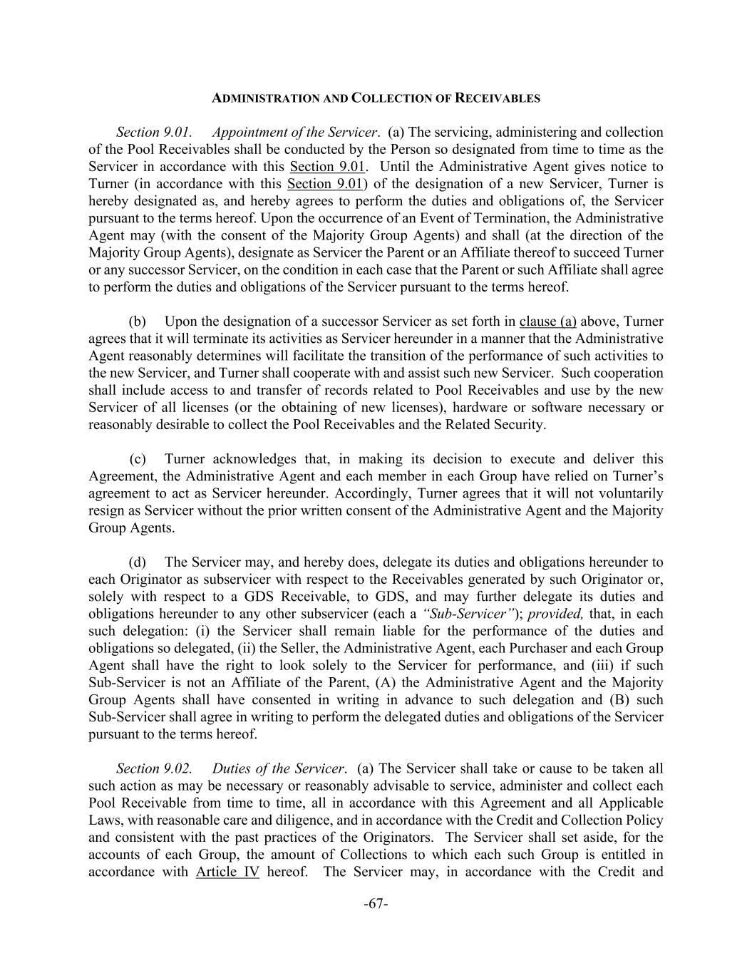 -67- ADMINISTRATION AND COLLECTION OF RECEIVABLES Section 9.01. Appointment of the Servicer. (a) The servicing, administering and collection of the Pool Receivables shall be conducted by the Person so designated from time to time as the Servicer in accordance with this Section 9.01. Until the Administrative Agent gives notice to Turner (in accordance with this Section 9.01) of the designation of a new Servicer, Turner is hereby designated as, and hereby agrees to perform the duties and obligations of, the Servicer pursuant to the terms hereof. Upon the occurrence of an Event of Termination, the Administrative Agent may (with the consent of the Majority Group Agents) and shall (at the direction of the Majority Group Agents), designate as Servicer the Parent or an Affiliate thereof to succeed Turner or any successor Servicer, on the condition in each case that the Parent or such Affiliate shall agree to perform the duties and obligations of the Servicer pursuant to the terms hereof. (b) Upon the designation of a successor Servicer as set forth in clause (a) above, Turner agrees that it will terminate its activities as Servicer hereunder in a manner that the Administrative Agent reasonably determines will facilitate the transition of the performance of such activities to the new Servicer, and Turner shall cooperate with and assist such new Servicer. Such cooperation shall include access to and transfer of records related to Pool Receivables and use by the new Servicer of all licenses (or the obtaining of new licenses), hardware or software necessary or reasonably desirable to collect the Pool Receivables and the Related Security. (c) Turner acknowledges that, in making its decision to execute and deliver this Agreement, the Administrative Agent and each member in each Group have relied on Turner’s agreement to act as Servicer hereunder. Accordingly, Turner agrees that it will not voluntarily resign as Servicer without the prior written consent of the Administrative Agent and the Majority Group Agents. (d) The Servicer may, and hereby does, delegate its duties and obligations hereunder to each Originator as subservicer with respect to the Receivables generated by such Originator or, solely with respect to a GDS Receivable, to GDS, and may further delegate its duties and obligations hereunder to any other subservicer (each a “Sub-Servicer”); provided, that, in each such delegation: (i) the Servicer shall remain liable for the performance of the duties and obligations so delegated, (ii) the Seller, the Administrative Agent, each Purchaser and each Group Agent shall have the right to look solely to the Servicer for performance, and (iii) if such Sub-Servicer is not an Affiliate of the Parent, (A) the Administrative Agent and the Majority Group Agents shall have consented in writing in advance to such delegation and (B) such Sub-Servicer shall agree in writing to perform the delegated duties and obligations of the Servicer pursuant to the terms hereof. Section 9.02. Duties of the Servicer. (a) The Servicer shall take or cause to be taken all such action as may be necessary or reasonably advisable to service, administer and collect each Pool Receivable from time to time, all in accordance with this Agreement and all Applicable Laws, with reasonable care and diligence, and in accordance with the Credit and Collection Policy and consistent with the past practices of the Originators. The Servicer shall set aside, for the accounts of each Group, the amount of Collections to which each such Group is entitled in accordance with Article IV hereof. The Servicer may, in accordance with the Credit and