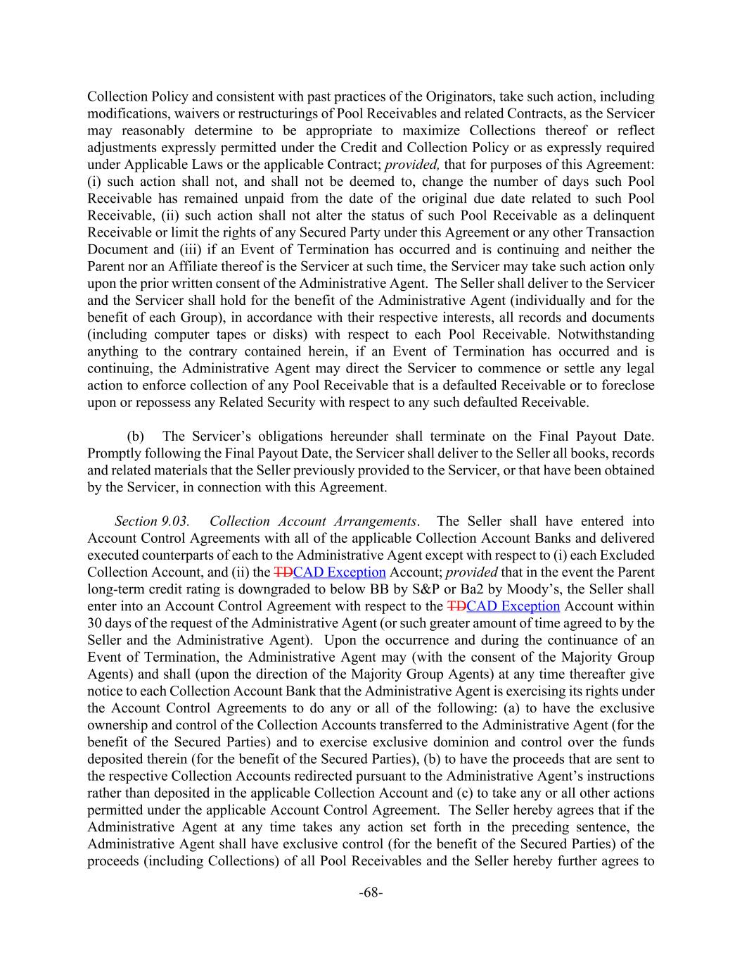 -68- Collection Policy and consistent with past practices of the Originators, take such action, including modifications, waivers or restructurings of Pool Receivables and related Contracts, as the Servicer may reasonably determine to be appropriate to maximize Collections thereof or reflect adjustments expressly permitted under the Credit and Collection Policy or as expressly required under Applicable Laws or the applicable Contract; provided, that for purposes of this Agreement: (i) such action shall not, and shall not be deemed to, change the number of days such Pool Receivable has remained unpaid from the date of the original due date related to such Pool Receivable, (ii) such action shall not alter the status of such Pool Receivable as a delinquent Receivable or limit the rights of any Secured Party under this Agreement or any other Transaction Document and (iii) if an Event of Termination has occurred and is continuing and neither the Parent nor an Affiliate thereof is the Servicer at such time, the Servicer may take such action only upon the prior written consent of the Administrative Agent. The Seller shall deliver to the Servicer and the Servicer shall hold for the benefit of the Administrative Agent (individually and for the benefit of each Group), in accordance with their respective interests, all records and documents (including computer tapes or disks) with respect to each Pool Receivable. Notwithstanding anything to the contrary contained herein, if an Event of Termination has occurred and is continuing, the Administrative Agent may direct the Servicer to commence or settle any legal action to enforce collection of any Pool Receivable that is a defaulted Receivable or to foreclose upon or repossess any Related Security with respect to any such defaulted Receivable. (b) The Servicer’s obligations hereunder shall terminate on the Final Payout Date. Promptly following the Final Payout Date, the Servicer shall deliver to the Seller all books, records and related materials that the Seller previously provided to the Servicer, or that have been obtained by the Servicer, in connection with this Agreement. Section 9.03. Collection Account Arrangements. The Seller shall have entered into Account Control Agreements with all of the applicable Collection Account Banks and delivered executed counterparts of each to the Administrative Agent except with respect to (i) each Excluded Collection Account, and (ii) the TDCAD Exception Account; provided that in the event the Parent long-term credit rating is downgraded to below BB by S&P or Ba2 by Moody’s, the Seller shall enter into an Account Control Agreement with respect to the TDCAD Exception Account within 30 days of the request of the Administrative Agent (or such greater amount of time agreed to by the Seller and the Administrative Agent). Upon the occurrence and during the continuance of an Event of Termination, the Administrative Agent may (with the consent of the Majority Group Agents) and shall (upon the direction of the Majority Group Agents) at any time thereafter give notice to each Collection Account Bank that the Administrative Agent is exercising its rights under the Account Control Agreements to do any or all of the following: (a) to have the exclusive ownership and control of the Collection Accounts transferred to the Administrative Agent (for the benefit of the Secured Parties) and to exercise exclusive dominion and control over the funds deposited therein (for the benefit of the Secured Parties), (b) to have the proceeds that are sent to the respective Collection Accounts redirected pursuant to the Administrative Agent’s instructions rather than deposited in the applicable Collection Account and (c) to take any or all other actions permitted under the applicable Account Control Agreement. The Seller hereby agrees that if the Administrative Agent at any time takes any action set forth in the preceding sentence, the Administrative Agent shall have exclusive control (for the benefit of the Secured Parties) of the proceeds (including Collections) of all Pool Receivables and the Seller hereby further agrees to