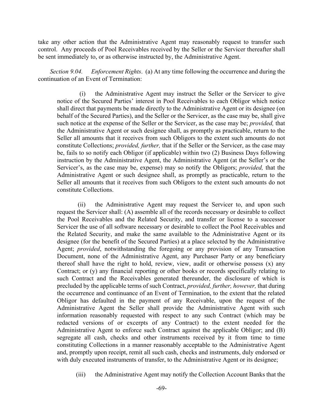 -69- take any other action that the Administrative Agent may reasonably request to transfer such control. Any proceeds of Pool Receivables received by the Seller or the Servicer thereafter shall be sent immediately to, or as otherwise instructed by, the Administrative Agent. Section 9.04. Enforcement Rights. (a) At any time following the occurrence and during the continuation of an Event of Termination: (i) the Administrative Agent may instruct the Seller or the Servicer to give notice of the Secured Parties’ interest in Pool Receivables to each Obligor which notice shall direct that payments be made directly to the Administrative Agent or its designee (on behalf of the Secured Parties), and the Seller or the Servicer, as the case may be, shall give such notice at the expense of the Seller or the Servicer, as the case may be; provided, that the Administrative Agent or such designee shall, as promptly as practicable, return to the Seller all amounts that it receives from such Obligors to the extent such amounts do not constitute Collections; provided, further, that if the Seller or the Servicer, as the case may be, fails to so notify each Obligor (if applicable) within two (2) Business Days following instruction by the Administrative Agent, the Administrative Agent (at the Seller’s or the Servicer’s, as the case may be, expense) may so notify the Obligors; provided, that the Administrative Agent or such designee shall, as promptly as practicable, return to the Seller all amounts that it receives from such Obligors to the extent such amounts do not constitute Collections. (ii) the Administrative Agent may request the Servicer to, and upon such request the Servicer shall: (A) assemble all of the records necessary or desirable to collect the Pool Receivables and the Related Security, and transfer or license to a successor Servicer the use of all software necessary or desirable to collect the Pool Receivables and the Related Security, and make the same available to the Administrative Agent or its designee (for the benefit of the Secured Parties) at a place selected by the Administrative Agent; provided, notwithstanding the foregoing or any provision of any Transaction Document, none of the Administrative Agent, any Purchaser Party or any beneficiary thereof shall have the right to hold, review, view, audit or otherwise possess (x) any Contract; or (y) any financial reporting or other books or records specifically relating to such Contract and the Receivables generated thereunder, the disclosure of which is precluded by the applicable terms of such Contract, provided, further, however, that during the occurrence and continuance of an Event of Termination, to the extent that the related Obligor has defaulted in the payment of any Receivable, upon the request of the Administrative Agent the Seller shall provide the Administrative Agent with such information reasonably requested with respect to any such Contract (which may be redacted versions of or excerpts of any Contract) to the extent needed for the Administrative Agent to enforce such Contract against the applicable Obligor; and (B) segregate all cash, checks and other instruments received by it from time to time constituting Collections in a manner reasonably acceptable to the Administrative Agent and, promptly upon receipt, remit all such cash, checks and instruments, duly endorsed or with duly executed instruments of transfer, to the Administrative Agent or its designee; (iii) the Administrative Agent may notify the Collection Account Banks that the