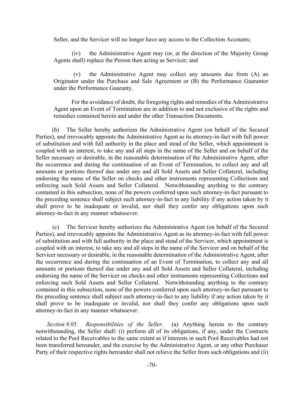 -70- Seller, and the Servicer will no longer have any access to the Collection Accounts; (iv) the Administrative Agent may (or, at the direction of the Majority Group Agents shall) replace the Person then acting as Servicer; and (v) the Administrative Agent may collect any amounts due from (A) an Originator under the Purchase and Sale Agreement or (B) the Performance Guarantor under the Performance Guaranty. For the avoidance of doubt, the foregoing rights and remedies of the Administrative Agent upon an Event of Termination are in addition to and not exclusive of the rights and remedies contained herein and under the other Transaction Documents. (b) The Seller hereby authorizes the Administrative Agent (on behalf of the Secured Parties), and irrevocably appoints the Administrative Agent as its attorney-in-fact with full power of substitution and with full authority in the place and stead of the Seller, which appointment is coupled with an interest, to take any and all steps in the name of the Seller and on behalf of the Seller necessary or desirable, in the reasonable determination of the Administrative Agent, after the occurrence and during the continuation of an Event of Termination, to collect any and all amounts or portions thereof due under any and all Sold Assets and Seller Collateral, including endorsing the name of the Seller on checks and other instruments representing Collections and enforcing such Sold Assets and Seller Collateral. Notwithstanding anything to the contrary contained in this subsection, none of the powers conferred upon such attorney-in-fact pursuant to the preceding sentence shall subject such attorney-in-fact to any liability if any action taken by it shall prove to be inadequate or invalid, nor shall they confer any obligations upon such attorney-in-fact in any manner whatsoever. (c) The Servicer hereby authorizes the Administrative Agent (on behalf of the Secured Parties), and irrevocably appoints the Administrative Agent as its attorney-in-fact with full power of substitution and with full authority in the place and stead of the Servicer, which appointment is coupled with an interest, to take any and all steps in the name of the Servicer and on behalf of the Servicer necessary or desirable, in the reasonable determination of the Administrative Agent, after the occurrence and during the continuation of an Event of Termination, to collect any and all amounts or portions thereof due under any and all Sold Assets and Seller Collateral, including endorsing the name of the Servicer on checks and other instruments representing Collections and enforcing such Sold Assets and Seller Collateral. Notwithstanding anything to the contrary contained in this subsection, none of the powers conferred upon such attorney-in-fact pursuant to the preceding sentence shall subject such attorney-in-fact to any liability if any action taken by it shall prove to be inadequate or invalid, nor shall they confer any obligations upon such attorney-in-fact in any manner whatsoever. Section 9.05. Responsibilities of the Seller. (a) Anything herein to the contrary notwithstanding, the Seller shall: (i) perform all of its obligations, if any, under the Contracts related to the Pool Receivables to the same extent as if interests in such Pool Receivables had not been transferred hereunder, and the exercise by the Administrative Agent, or any other Purchaser Party of their respective rights hereunder shall not relieve the Seller from such obligations and (ii)