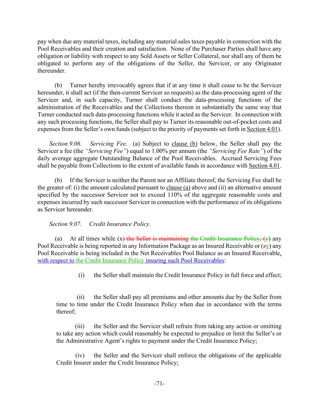 -71- pay when due any material taxes, including any material sales taxes payable in connection with the Pool Receivables and their creation and satisfaction. None of the Purchaser Parties shall have any obligation or liability with respect to any Sold Assets or Seller Collateral, nor shall any of them be obligated to perform any of the obligations of the Seller, the Servicer, or any Originator thereunder. (b) Turner hereby irrevocably agrees that if at any time it shall cease to be the Servicer hereunder, it shall act (if the then-current Servicer so requests) as the data-processing agent of the Servicer and, in such capacity, Turner shall conduct the data-processing functions of the administration of the Receivables and the Collections thereon in substantially the same way that Turner conducted such data-processing functions while it acted as the Servicer. In connection with any such processing functions, the Seller shall pay to Turner its reasonable out-of-pocket costs and expenses from the Seller’s own funds (subject to the priority of payments set forth in Section 4.01). Section 9.06. Servicing Fee. (a) Subject to clause (b) below, the Seller shall pay the Servicer a fee (the “Servicing Fee”) equal to 1.00% per annum (the “Servicing Fee Rate”) of the daily average aggregate Outstanding Balance of the Pool Receivables. Accrued Servicing Fees shall be payable from Collections to the extent of available funds in accordance with Section 4.01. (b) If the Servicer is neither the Parent nor an Affiliate thereof, the Servicing Fee shall be the greater of: (i) the amount calculated pursuant to clause (a) above and (ii) an alternative amount specified by the successor Servicer not to exceed 110% of the aggregate reasonable costs and expenses incurred by such successor Servicer in connection with the performance of its obligations as Servicer hereunder. Section 9.07. Credit Insurance Policy. (a) At all times while (x) the Seller is maintaining the Credit Insurance Policy, (y) any Pool Receivable is being reported in any Information Package as an Insured Receivable or (zy) any Pool Receivable is being included in the Net Receivables Pool Balance as an Insured Receivable, with respect to the Credit Insurance Policy insuring such Pool Receivables: (i) the Seller shall maintain the Credit Insurance Policy in full force and effect; (ii) the Seller shall pay all premiums and other amounts due by the Seller from time to time under the Credit Insurance Policy when due in accordance with the terms thereof; (iii) the Seller and the Servicer shall refrain from taking any action or omitting to take any action which could reasonably be expected to prejudice or limit the Seller’s or the Administrative Agent’s rights to payment under the Credit Insurance Policy; (iv) the Seller and the Servicer shall enforce the obligations of the applicable Credit Insurer under the Credit Insurance Policy;