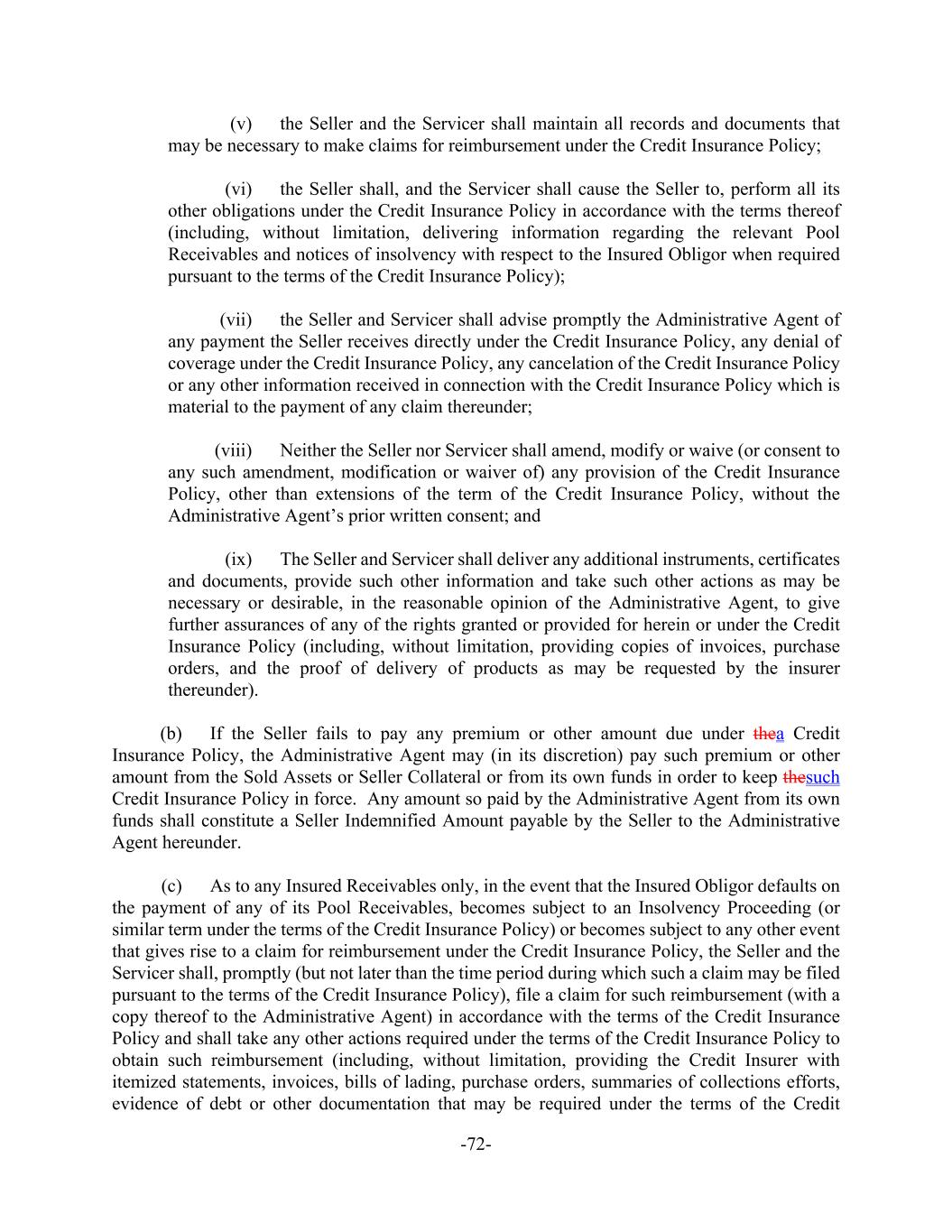 -72- (v) the Seller and the Servicer shall maintain all records and documents that may be necessary to make claims for reimbursement under the Credit Insurance Policy; (vi) the Seller shall, and the Servicer shall cause the Seller to, perform all its other obligations under the Credit Insurance Policy in accordance with the terms thereof (including, without limitation, delivering information regarding the relevant Pool Receivables and notices of insolvency with respect to the Insured Obligor when required pursuant to the terms of the Credit Insurance Policy); (vii) the Seller and Servicer shall advise promptly the Administrative Agent of any payment the Seller receives directly under the Credit Insurance Policy, any denial of coverage under the Credit Insurance Policy, any cancelation of the Credit Insurance Policy or any other information received in connection with the Credit Insurance Policy which is material to the payment of any claim thereunder; (viii) Neither the Seller nor Servicer shall amend, modify or waive (or consent to any such amendment, modification or waiver of) any provision of the Credit Insurance Policy, other than extensions of the term of the Credit Insurance Policy, without the Administrative Agent’s prior written consent; and (ix) The Seller and Servicer shall deliver any additional instruments, certificates and documents, provide such other information and take such other actions as may be necessary or desirable, in the reasonable opinion of the Administrative Agent, to give further assurances of any of the rights granted or provided for herein or under the Credit Insurance Policy (including, without limitation, providing copies of invoices, purchase orders, and the proof of delivery of products as may be requested by the insurer thereunder). (b) If the Seller fails to pay any premium or other amount due under thea Credit Insurance Policy, the Administrative Agent may (in its discretion) pay such premium or other amount from the Sold Assets or Seller Collateral or from its own funds in order to keep thesuch Credit Insurance Policy in force. Any amount so paid by the Administrative Agent from its own funds shall constitute a Seller Indemnified Amount payable by the Seller to the Administrative Agent hereunder. (c) As to any Insured Receivables only, in the event that the Insured Obligor defaults on the payment of any of its Pool Receivables, becomes subject to an Insolvency Proceeding (or similar term under the terms of the Credit Insurance Policy) or becomes subject to any other event that gives rise to a claim for reimbursement under the Credit Insurance Policy, the Seller and the Servicer shall, promptly (but not later than the time period during which such a claim may be filed pursuant to the terms of the Credit Insurance Policy), file a claim for such reimbursement (with a copy thereof to the Administrative Agent) in accordance with the terms of the Credit Insurance Policy and shall take any other actions required under the terms of the Credit Insurance Policy to obtain such reimbursement (including, without limitation, providing the Credit Insurer with itemized statements, invoices, bills of lading, purchase orders, summaries of collections efforts, evidence of debt or other documentation that may be required under the terms of the Credit