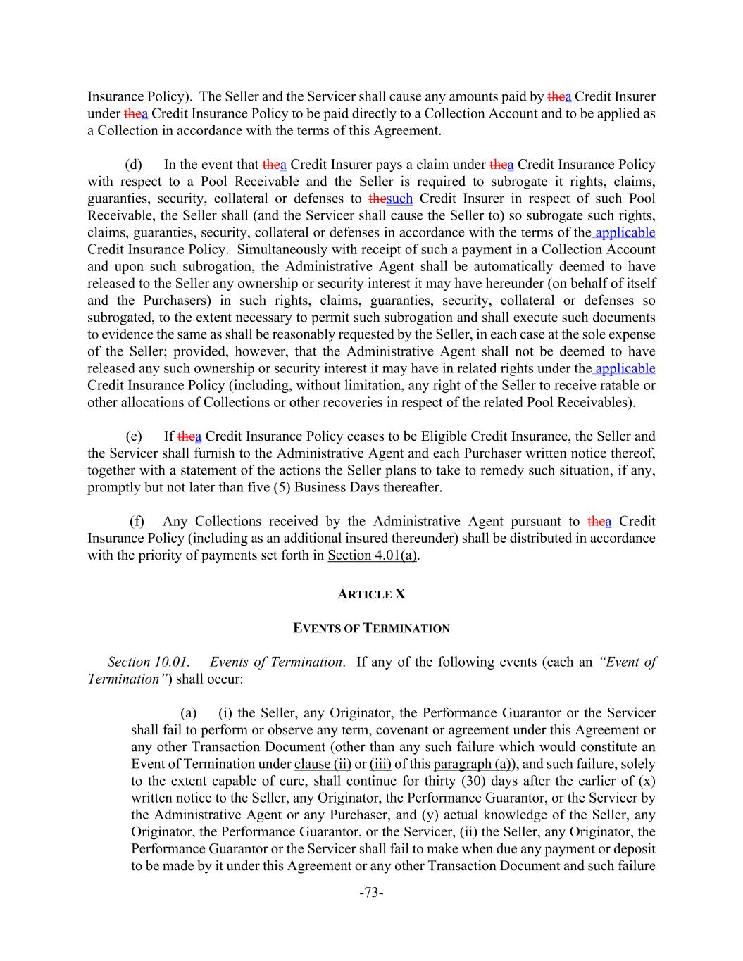 -73- Insurance Policy). The Seller and the Servicer shall cause any amounts paid by thea Credit Insurer under thea Credit Insurance Policy to be paid directly to a Collection Account and to be applied as a Collection in accordance with the terms of this Agreement. (d) In the event that thea Credit Insurer pays a claim under thea Credit Insurance Policy with respect to a Pool Receivable and the Seller is required to subrogate it rights, claims, guaranties, security, collateral or defenses to thesuch Credit Insurer in respect of such Pool Receivable, the Seller shall (and the Servicer shall cause the Seller to) so subrogate such rights, claims, guaranties, security, collateral or defenses in accordance with the terms of the applicable Credit Insurance Policy. Simultaneously with receipt of such a payment in a Collection Account and upon such subrogation, the Administrative Agent shall be automatically deemed to have released to the Seller any ownership or security interest it may have hereunder (on behalf of itself and the Purchasers) in such rights, claims, guaranties, security, collateral or defenses so subrogated, to the extent necessary to permit such subrogation and shall execute such documents to evidence the same as shall be reasonably requested by the Seller, in each case at the sole expense of the Seller; provided, however, that the Administrative Agent shall not be deemed to have released any such ownership or security interest it may have in related rights under the applicable Credit Insurance Policy (including, without limitation, any right of the Seller to receive ratable or other allocations of Collections or other recoveries in respect of the related Pool Receivables). (e) If thea Credit Insurance Policy ceases to be Eligible Credit Insurance, the Seller and the Servicer shall furnish to the Administrative Agent and each Purchaser written notice thereof, together with a statement of the actions the Seller plans to take to remedy such situation, if any, promptly but not later than five (5) Business Days thereafter. (f) Any Collections received by the Administrative Agent pursuant to thea Credit Insurance Policy (including as an additional insured thereunder) shall be distributed in accordance with the priority of payments set forth in Section 4.01(a). ARTICLE X EVENTS OF TERMINATION Section 10.01. Events of Termination. If any of the following events (each an “Event of Termination”) shall occur: (a) (i) the Seller, any Originator, the Performance Guarantor or the Servicer shall fail to perform or observe any term, covenant or agreement under this Agreement or any other Transaction Document (other than any such failure which would constitute an Event of Termination under clause (ii) or (iii) of this paragraph (a)), and such failure, solely to the extent capable of cure, shall continue for thirty (30) days after the earlier of (x) written notice to the Seller, any Originator, the Performance Guarantor, or the Servicer by the Administrative Agent or any Purchaser, and (y) actual knowledge of the Seller, any Originator, the Performance Guarantor, or the Servicer, (ii) the Seller, any Originator, the Performance Guarantor or the Servicer shall fail to make when due any payment or deposit to be made by it under this Agreement or any other Transaction Document and such failure