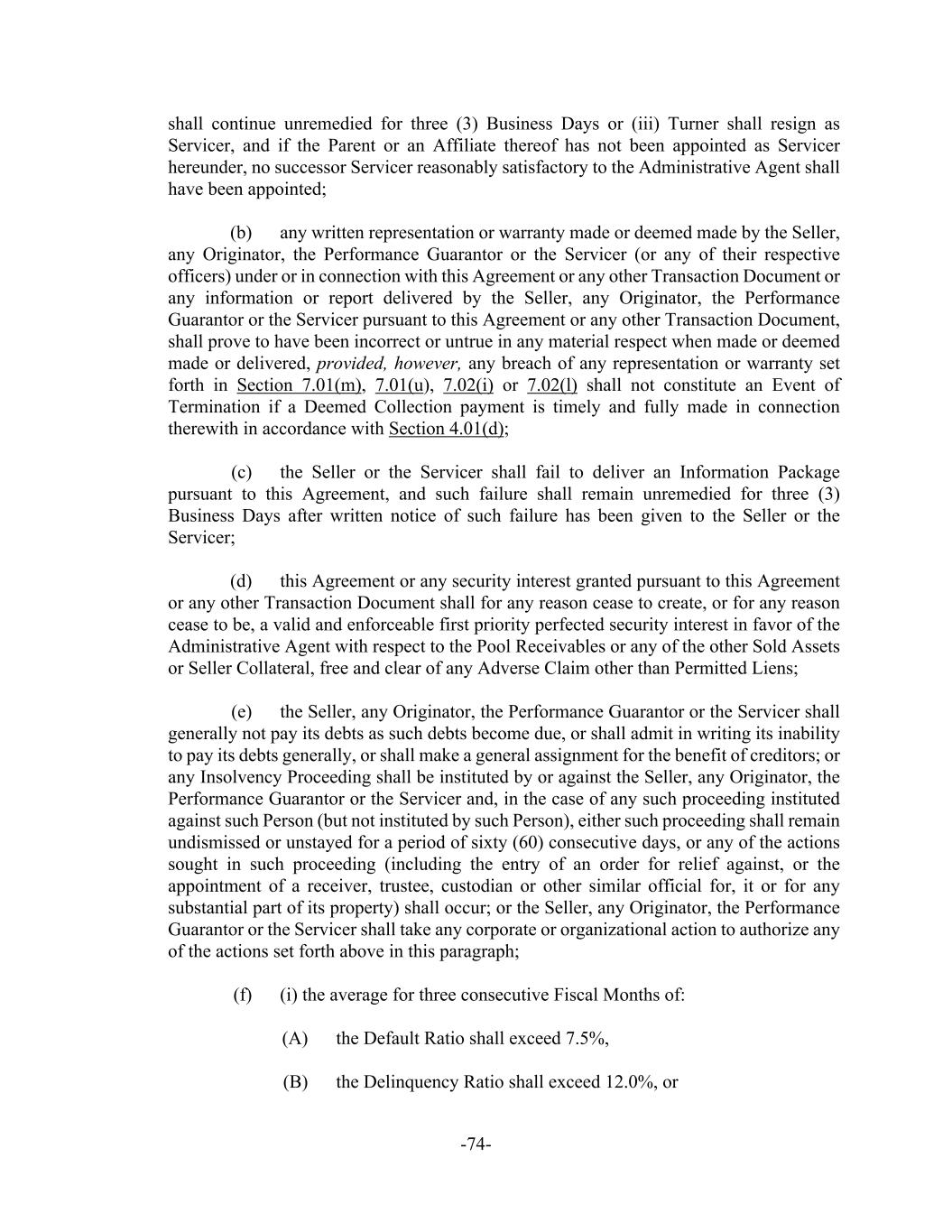 -74- shall continue unremedied for three (3) Business Days or (iii) Turner shall resign as Servicer, and if the Parent or an Affiliate thereof has not been appointed as Servicer hereunder, no successor Servicer reasonably satisfactory to the Administrative Agent shall have been appointed; (b) any written representation or warranty made or deemed made by the Seller, any Originator, the Performance Guarantor or the Servicer (or any of their respective officers) under or in connection with this Agreement or any other Transaction Document or any information or report delivered by the Seller, any Originator, the Performance Guarantor or the Servicer pursuant to this Agreement or any other Transaction Document, shall prove to have been incorrect or untrue in any material respect when made or deemed made or delivered, provided, however, any breach of any representation or warranty set forth in Section 7.01(m), 7.01(u), 7.02(i) or 7.02(l) shall not constitute an Event of Termination if a Deemed Collection payment is timely and fully made in connection therewith in accordance with Section 4.01(d); (c) the Seller or the Servicer shall fail to deliver an Information Package pursuant to this Agreement, and such failure shall remain unremedied for three (3) Business Days after written notice of such failure has been given to the Seller or the Servicer; (d) this Agreement or any security interest granted pursuant to this Agreement or any other Transaction Document shall for any reason cease to create, or for any reason cease to be, a valid and enforceable first priority perfected security interest in favor of the Administrative Agent with respect to the Pool Receivables or any of the other Sold Assets or Seller Collateral, free and clear of any Adverse Claim other than Permitted Liens; (e) the Seller, any Originator, the Performance Guarantor or the Servicer shall generally not pay its debts as such debts become due, or shall admit in writing its inability to pay its debts generally, or shall make a general assignment for the benefit of creditors; or any Insolvency Proceeding shall be instituted by or against the Seller, any Originator, the Performance Guarantor or the Servicer and, in the case of any such proceeding instituted against such Person (but not instituted by such Person), either such proceeding shall remain undismissed or unstayed for a period of sixty (60) consecutive days, or any of the actions sought in such proceeding (including the entry of an order for relief against, or the appointment of a receiver, trustee, custodian or other similar official for, it or for any substantial part of its property) shall occur; or the Seller, any Originator, the Performance Guarantor or the Servicer shall take any corporate or organizational action to authorize any of the actions set forth above in this paragraph; (f) (i) the average for three consecutive Fiscal Months of: (A) the Default Ratio shall exceed 7.5%, (B) the Delinquency Ratio shall exceed 12.0%, or
