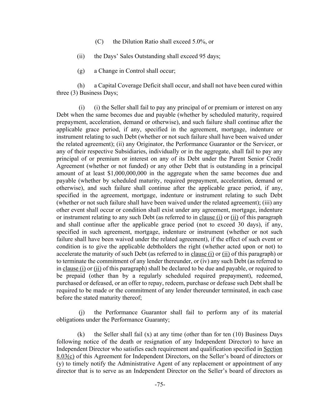 -75- (C) the Dilution Ratio shall exceed 5.0%, or (ii) the Days’ Sales Outstanding shall exceed 95 days; (g) a Change in Control shall occur; (h) a Capital Coverage Deficit shall occur, and shall not have been cured within three (3) Business Days; (i) (i) the Seller shall fail to pay any principal of or premium or interest on any Debt when the same becomes due and payable (whether by scheduled maturity, required prepayment, acceleration, demand or otherwise), and such failure shall continue after the applicable grace period, if any, specified in the agreement, mortgage, indenture or instrument relating to such Debt (whether or not such failure shall have been waived under the related agreement); (ii) any Originator, the Performance Guarantor or the Servicer, or any of their respective Subsidiaries, individually or in the aggregate, shall fail to pay any principal of or premium or interest on any of its Debt under the Parent Senior Credit Agreement (whether or not funded) or any other Debt that is outstanding in a principal amount of at least $1,000,000,000 in the aggregate when the same becomes due and payable (whether by scheduled maturity, required prepayment, acceleration, demand or otherwise), and such failure shall continue after the applicable grace period, if any, specified in the agreement, mortgage, indenture or instrument relating to such Debt (whether or not such failure shall have been waived under the related agreement); (iii) any other event shall occur or condition shall exist under any agreement, mortgage, indenture or instrument relating to any such Debt (as referred to in clause (i) or (ii) of this paragraph and shall continue after the applicable grace period (not to exceed 30 days), if any, specified in such agreement, mortgage, indenture or instrument (whether or not such failure shall have been waived under the related agreement), if the effect of such event or condition is to give the applicable debtholders the right (whether acted upon or not) to accelerate the maturity of such Debt (as referred to in clause (i) or (ii) of this paragraph) or to terminate the commitment of any lender thereunder, or (iv) any such Debt (as referred to in clause (i) or (ii) of this paragraph) shall be declared to be due and payable, or required to be prepaid (other than by a regularly scheduled required prepayment), redeemed, purchased or defeased, or an offer to repay, redeem, purchase or defease such Debt shall be required to be made or the commitment of any lender thereunder terminated, in each case before the stated maturity thereof; (j) the Performance Guarantor shall fail to perform any of its material obligations under the Performance Guaranty; (k) the Seller shall fail (x) at any time (other than for ten (10) Business Days following notice of the death or resignation of any Independent Director) to have an Independent Director who satisfies each requirement and qualification specified in Section 8.03(c) of this Agreement for Independent Directors, on the Seller’s board of directors or (y) to timely notify the Administrative Agent of any replacement or appointment of any director that is to serve as an Independent Director on the Seller’s board of directors as
