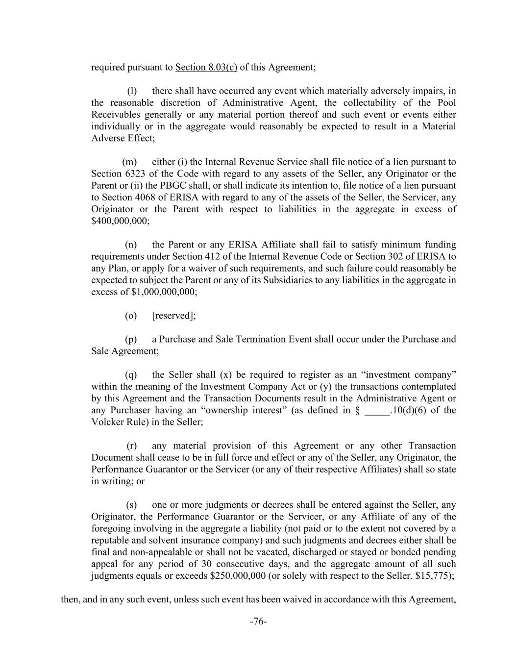 -76- required pursuant to Section 8.03(c) of this Agreement; (l) there shall have occurred any event which materially adversely impairs, in the reasonable discretion of Administrative Agent, the collectability of the Pool Receivables generally or any material portion thereof and such event or events either individually or in the aggregate would reasonably be expected to result in a Material Adverse Effect; (m) either (i) the Internal Revenue Service shall file notice of a lien pursuant to Section 6323 of the Code with regard to any assets of the Seller, any Originator or the Parent or (ii) the PBGC shall, or shall indicate its intention to, file notice of a lien pursuant to Section 4068 of ERISA with regard to any of the assets of the Seller, the Servicer, any Originator or the Parent with respect to liabilities in the aggregate in excess of $400,000,000; (n) the Parent or any ERISA Affiliate shall fail to satisfy minimum funding requirements under Section 412 of the Internal Revenue Code or Section 302 of ERISA to any Plan, or apply for a waiver of such requirements, and such failure could reasonably be expected to subject the Parent or any of its Subsidiaries to any liabilities in the aggregate in excess of $1,000,000,000; (o) [reserved]; (p) a Purchase and Sale Termination Event shall occur under the Purchase and Sale Agreement; (q) the Seller shall (x) be required to register as an “investment company” within the meaning of the Investment Company Act or (y) the transactions contemplated by this Agreement and the Transaction Documents result in the Administrative Agent or any Purchaser having an “ownership interest” (as defined in § _____.10(d)(6) of the Volcker Rule) in the Seller; (r) any material provision of this Agreement or any other Transaction Document shall cease to be in full force and effect or any of the Seller, any Originator, the Performance Guarantor or the Servicer (or any of their respective Affiliates) shall so state in writing; or (s) one or more judgments or decrees shall be entered against the Seller, any Originator, the Performance Guarantor or the Servicer, or any Affiliate of any of the foregoing involving in the aggregate a liability (not paid or to the extent not covered by a reputable and solvent insurance company) and such judgments and decrees either shall be final and non-appealable or shall not be vacated, discharged or stayed or bonded pending appeal for any period of 30 consecutive days, and the aggregate amount of all such judgments equals or exceeds $250,000,000 (or solely with respect to the Seller, $15,775); then, and in any such event, unless such event has been waived in accordance with this Agreement,