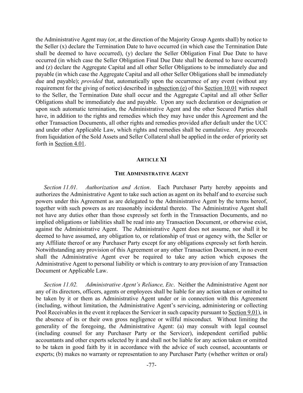 -77- the Administrative Agent may (or, at the direction of the Majority Group Agents shall) by notice to the Seller (x) declare the Termination Date to have occurred (in which case the Termination Date shall be deemed to have occurred), (y) declare the Seller Obligation Final Due Date to have occurred (in which case the Seller Obligation Final Due Date shall be deemed to have occurred) and (z) declare the Aggregate Capital and all other Seller Obligations to be immediately due and payable (in which case the Aggregate Capital and all other Seller Obligations shall be immediately due and payable); provided that, automatically upon the occurrence of any event (without any requirement for the giving of notice) described in subsection (e) of this Section 10.01 with respect to the Seller, the Termination Date shall occur and the Aggregate Capital and all other Seller Obligations shall be immediately due and payable. Upon any such declaration or designation or upon such automatic termination, the Administrative Agent and the other Secured Parties shall have, in addition to the rights and remedies which they may have under this Agreement and the other Transaction Documents, all other rights and remedies provided after default under the UCC and under other Applicable Law, which rights and remedies shall be cumulative. Any proceeds from liquidation of the Sold Assets and Seller Collateral shall be applied in the order of priority set forth in Section 4.01. ARTICLE XI THE ADMINISTRATIVE AGENT Section 11.01. Authorization and Action. Each Purchaser Party hereby appoints and authorizes the Administrative Agent to take such action as agent on its behalf and to exercise such powers under this Agreement as are delegated to the Administrative Agent by the terms hereof, together with such powers as are reasonably incidental thereto. The Administrative Agent shall not have any duties other than those expressly set forth in the Transaction Documents, and no implied obligations or liabilities shall be read into any Transaction Document, or otherwise exist, against the Administrative Agent. The Administrative Agent does not assume, nor shall it be deemed to have assumed, any obligation to, or relationship of trust or agency with, the Seller or any Affiliate thereof or any Purchaser Party except for any obligations expressly set forth herein. Notwithstanding any provision of this Agreement or any other Transaction Document, in no event shall the Administrative Agent ever be required to take any action which exposes the Administrative Agent to personal liability or which is contrary to any provision of any Transaction Document or Applicable Law. Section 11.02. Administrative Agent’s Reliance, Etc. Neither the Administrative Agent nor any of its directors, officers, agents or employees shall be liable for any action taken or omitted to be taken by it or them as Administrative Agent under or in connection with this Agreement (including, without limitation, the Administrative Agent’s servicing, administering or collecting Pool Receivables in the event it replaces the Servicer in such capacity pursuant to Section 9.01), in the absence of its or their own gross negligence or willful misconduct. Without limiting the generality of the foregoing, the Administrative Agent: (a) may consult with legal counsel (including counsel for any Purchaser Party or the Servicer), independent certified public accountants and other experts selected by it and shall not be liable for any action taken or omitted to be taken in good faith by it in accordance with the advice of such counsel, accountants or experts; (b) makes no warranty or representation to any Purchaser Party (whether written or oral)