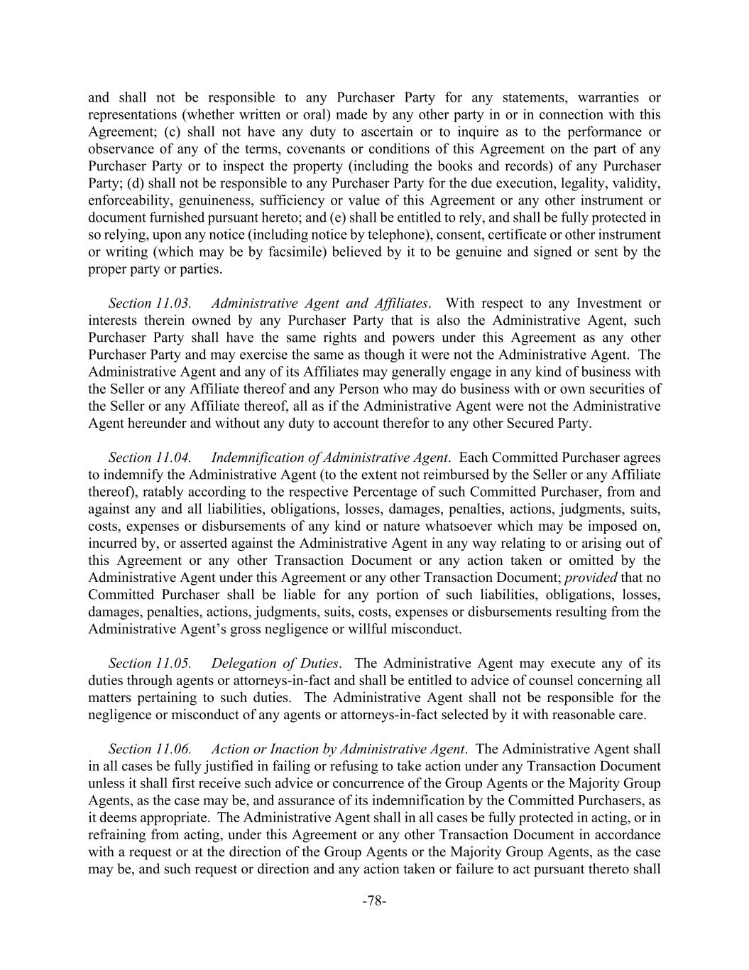 -78- and shall not be responsible to any Purchaser Party for any statements, warranties or representations (whether written or oral) made by any other party in or in connection with this Agreement; (c) shall not have any duty to ascertain or to inquire as to the performance or observance of any of the terms, covenants or conditions of this Agreement on the part of any Purchaser Party or to inspect the property (including the books and records) of any Purchaser Party; (d) shall not be responsible to any Purchaser Party for the due execution, legality, validity, enforceability, genuineness, sufficiency or value of this Agreement or any other instrument or document furnished pursuant hereto; and (e) shall be entitled to rely, and shall be fully protected in so relying, upon any notice (including notice by telephone), consent, certificate or other instrument or writing (which may be by facsimile) believed by it to be genuine and signed or sent by the proper party or parties. Section 11.03. Administrative Agent and Affiliates. With respect to any Investment or interests therein owned by any Purchaser Party that is also the Administrative Agent, such Purchaser Party shall have the same rights and powers under this Agreement as any other Purchaser Party and may exercise the same as though it were not the Administrative Agent. The Administrative Agent and any of its Affiliates may generally engage in any kind of business with the Seller or any Affiliate thereof and any Person who may do business with or own securities of the Seller or any Affiliate thereof, all as if the Administrative Agent were not the Administrative Agent hereunder and without any duty to account therefor to any other Secured Party. Section 11.04. Indemnification of Administrative Agent. Each Committed Purchaser agrees to indemnify the Administrative Agent (to the extent not reimbursed by the Seller or any Affiliate thereof), ratably according to the respective Percentage of such Committed Purchaser, from and against any and all liabilities, obligations, losses, damages, penalties, actions, judgments, suits, costs, expenses or disbursements of any kind or nature whatsoever which may be imposed on, incurred by, or asserted against the Administrative Agent in any way relating to or arising out of this Agreement or any other Transaction Document or any action taken or omitted by the Administrative Agent under this Agreement or any other Transaction Document; provided that no Committed Purchaser shall be liable for any portion of such liabilities, obligations, losses, damages, penalties, actions, judgments, suits, costs, expenses or disbursements resulting from the Administrative Agent’s gross negligence or willful misconduct. Section 11.05. Delegation of Duties. The Administrative Agent may execute any of its duties through agents or attorneys-in-fact and shall be entitled to advice of counsel concerning all matters pertaining to such duties. The Administrative Agent shall not be responsible for the negligence or misconduct of any agents or attorneys-in-fact selected by it with reasonable care. Section 11.06. Action or Inaction by Administrative Agent. The Administrative Agent shall in all cases be fully justified in failing or refusing to take action under any Transaction Document unless it shall first receive such advice or concurrence of the Group Agents or the Majority Group Agents, as the case may be, and assurance of its indemnification by the Committed Purchasers, as it deems appropriate. The Administrative Agent shall in all cases be fully protected in acting, or in refraining from acting, under this Agreement or any other Transaction Document in accordance with a request or at the direction of the Group Agents or the Majority Group Agents, as the case may be, and such request or direction and any action taken or failure to act pursuant thereto shall