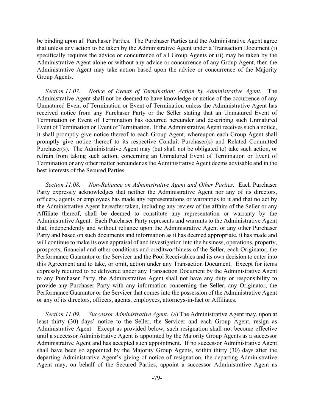 -79- be binding upon all Purchaser Parties. The Purchaser Parties and the Administrative Agent agree that unless any action to be taken by the Administrative Agent under a Transaction Document (i) specifically requires the advice or concurrence of all Group Agents or (ii) may be taken by the Administrative Agent alone or without any advice or concurrence of any Group Agent, then the Administrative Agent may take action based upon the advice or concurrence of the Majority Group Agents. Section 11.07. Notice of Events of Termination; Action by Administrative Agent. The Administrative Agent shall not be deemed to have knowledge or notice of the occurrence of any Unmatured Event of Termination or Event of Termination unless the Administrative Agent has received notice from any Purchaser Party or the Seller stating that an Unmatured Event of Termination or Event of Termination has occurred hereunder and describing such Unmatured Event of Termination or Event of Termination. If the Administrative Agent receives such a notice, it shall promptly give notice thereof to each Group Agent, whereupon each Group Agent shall promptly give notice thereof to its respective Conduit Purchaser(s) and Related Committed Purchaser(s). The Administrative Agent may (but shall not be obligated to) take such action, or refrain from taking such action, concerning an Unmatured Event of Termination or Event of Termination or any other matter hereunder as the Administrative Agent deems advisable and in the best interests of the Secured Parties. Section 11.08. Non-Reliance on Administrative Agent and Other Parties. Each Purchaser Party expressly acknowledges that neither the Administrative Agent nor any of its directors, officers, agents or employees has made any representations or warranties to it and that no act by the Administrative Agent hereafter taken, including any review of the affairs of the Seller or any Affiliate thereof, shall be deemed to constitute any representation or warranty by the Administrative Agent. Each Purchaser Party represents and warrants to the Administrative Agent that, independently and without reliance upon the Administrative Agent or any other Purchaser Party and based on such documents and information as it has deemed appropriate, it has made and will continue to make its own appraisal of and investigation into the business, operations, property, prospects, financial and other conditions and creditworthiness of the Seller, each Originator, the Performance Guarantor or the Servicer and the Pool Receivables and its own decision to enter into this Agreement and to take, or omit, action under any Transaction Document. Except for items expressly required to be delivered under any Transaction Document by the Administrative Agent to any Purchaser Party, the Administrative Agent shall not have any duty or responsibility to provide any Purchaser Party with any information concerning the Seller, any Originator, the Performance Guarantor or the Servicer that comes into the possession of the Administrative Agent or any of its directors, officers, agents, employees, attorneys-in-fact or Affiliates. Section 11.09. Successor Administrative Agent. (a) The Administrative Agent may, upon at least thirty (30) days’ notice to the Seller, the Servicer and each Group Agent, resign as Administrative Agent. Except as provided below, such resignation shall not become effective until a successor Administrative Agent is appointed by the Majority Group Agents as a successor Administrative Agent and has accepted such appointment. If no successor Administrative Agent shall have been so appointed by the Majority Group Agents, within thirty (30) days after the departing Administrative Agent’s giving of notice of resignation, the departing Administrative Agent may, on behalf of the Secured Parties, appoint a successor Administrative Agent as