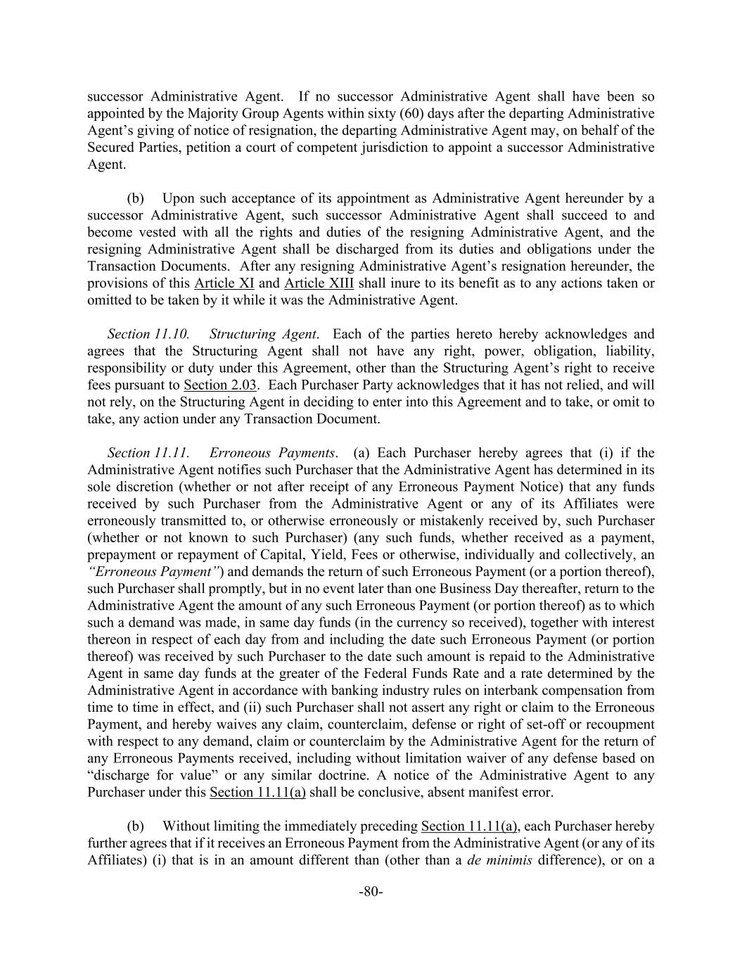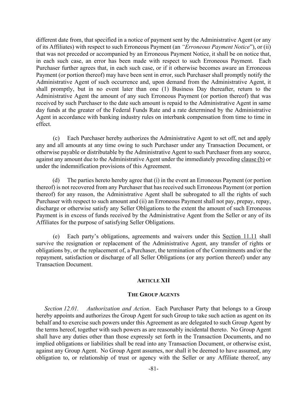 -81- different date from, that specified in a notice of payment sent by the Administrative Agent (or any of its Affiliates) with respect to such Erroneous Payment (an “Erroneous Payment Notice”), or (ii) that was not preceded or accompanied by an Erroneous Payment Notice, it shall be on notice that, in each such case, an error has been made with respect to such Erroneous Payment. Each Purchaser further agrees that, in each such case, or if it otherwise becomes aware an Erroneous Payment (or portion thereof) may have been sent in error, such Purchaser shall promptly notify the Administrative Agent of such occurrence and, upon demand from the Administrative Agent, it shall promptly, but in no event later than one (1) Business Day thereafter, return to the Administrative Agent the amount of any such Erroneous Payment (or portion thereof) that was received by such Purchaser to the date such amount is repaid to the Administrative Agent in same day funds at the greater of the Federal Funds Rate and a rate determined by the Administrative Agent in accordance with banking industry rules on interbank compensation from time to time in effect. (c) Each Purchaser hereby authorizes the Administrative Agent to set off, net and apply any and all amounts at any time owing to such Purchaser under any Transaction Document, or otherwise payable or distributable by the Administrative Agent to such Purchaser from any source, against any amount due to the Administrative Agent under the immediately preceding clause (b) or under the indemnification provisions of this Agreement. (d) The parties hereto hereby agree that (i) in the event an Erroneous Payment (or portion thereof) is not recovered from any Purchaser that has received such Erroneous Payment (or portion thereof) for any reason, the Administrative Agent shall be subrogated to all the rights of such Purchaser with respect to such amount and (ii) an Erroneous Payment shall not pay, prepay, repay, discharge or otherwise satisfy any Seller Obligations to the extent the amount of such Erroneous Payment is in excess of funds received by the Administrative Agent from the Seller or any of its Affiliates for the purpose of satisfying Seller Obligations. (e) Each party’s obligations, agreements and waivers under this Section 11.11 shall survive the resignation or replacement of the Administrative Agent, any transfer of rights or obligations by, or the replacement of, a Purchaser, the termination of the Commitments and/or the repayment, satisfaction or discharge of all Seller Obligations (or any portion thereof) under any Transaction Document. ARTICLE XII THE GROUP AGENTS Section 12.01. Authorization and Action. Each Purchaser Party that belongs to a Group hereby appoints and authorizes the Group Agent for such Group to take such action as agent on its behalf and to exercise such powers under this Agreement as are delegated to such Group Agent by the terms hereof, together with such powers as are reasonably incidental thereto. No Group Agent shall have any duties other than those expressly set forth in the Transaction Documents, and no implied obligations or liabilities shall be read into any Transaction Document, or otherwise exist, against any Group Agent. No Group Agent assumes, nor shall it be deemed to have assumed, any obligation to, or relationship of trust or agency with the Seller or any Affiliate thereof, any