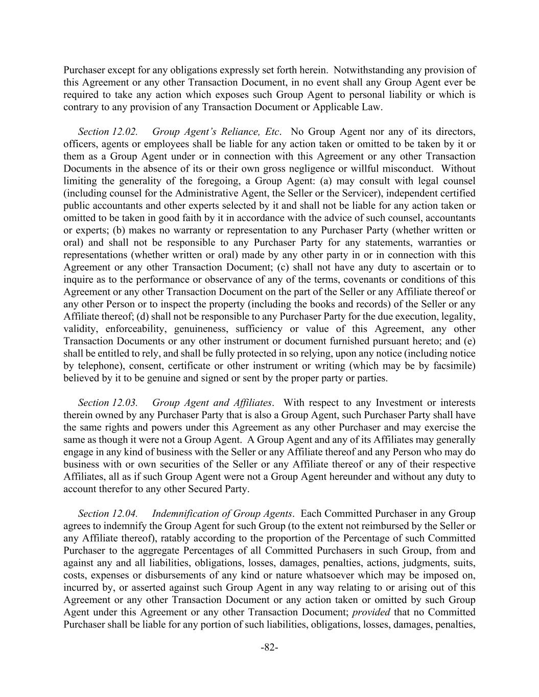 -82- Purchaser except for any obligations expressly set forth herein. Notwithstanding any provision of this Agreement or any other Transaction Document, in no event shall any Group Agent ever be required to take any action which exposes such Group Agent to personal liability or which is contrary to any provision of any Transaction Document or Applicable Law. Section 12.02. Group Agent’s Reliance, Etc. No Group Agent nor any of its directors, officers, agents or employees shall be liable for any action taken or omitted to be taken by it or them as a Group Agent under or in connection with this Agreement or any other Transaction Documents in the absence of its or their own gross negligence or willful misconduct. Without limiting the generality of the foregoing, a Group Agent: (a) may consult with legal counsel (including counsel for the Administrative Agent, the Seller or the Servicer), independent certified public accountants and other experts selected by it and shall not be liable for any action taken or omitted to be taken in good faith by it in accordance with the advice of such counsel, accountants or experts; (b) makes no warranty or representation to any Purchaser Party (whether written or oral) and shall not be responsible to any Purchaser Party for any statements, warranties or representations (whether written or oral) made by any other party in or in connection with this Agreement or any other Transaction Document; (c) shall not have any duty to ascertain or to inquire as to the performance or observance of any of the terms, covenants or conditions of this Agreement or any other Transaction Document on the part of the Seller or any Affiliate thereof or any other Person or to inspect the property (including the books and records) of the Seller or any Affiliate thereof; (d) shall not be responsible to any Purchaser Party for the due execution, legality, validity, enforceability, genuineness, sufficiency or value of this Agreement, any other Transaction Documents or any other instrument or document furnished pursuant hereto; and (e) shall be entitled to rely, and shall be fully protected in so relying, upon any notice (including notice by telephone), consent, certificate or other instrument or writing (which may be by facsimile) believed by it to be genuine and signed or sent by the proper party or parties. Section 12.03. Group Agent and Affiliates. With respect to any Investment or interests therein owned by any Purchaser Party that is also a Group Agent, such Purchaser Party shall have the same rights and powers under this Agreement as any other Purchaser and may exercise the same as though it were not a Group Agent. A Group Agent and any of its Affiliates may generally engage in any kind of business with the Seller or any Affiliate thereof and any Person who may do business with or own securities of the Seller or any Affiliate thereof or any of their respective Affiliates, all as if such Group Agent were not a Group Agent hereunder and without any duty to account therefor to any other Secured Party. Section 12.04. Indemnification of Group Agents. Each Committed Purchaser in any Group agrees to indemnify the Group Agent for such Group (to the extent not reimbursed by the Seller or any Affiliate thereof), ratably according to the proportion of the Percentage of such Committed Purchaser to the aggregate Percentages of all Committed Purchasers in such Group, from and against any and all liabilities, obligations, losses, damages, penalties, actions, judgments, suits, costs, expenses or disbursements of any kind or nature whatsoever which may be imposed on, incurred by, or asserted against such Group Agent in any way relating to or arising out of this Agreement or any other Transaction Document or any action taken or omitted by such Group Agent under this Agreement or any other Transaction Document; provided that no Committed Purchaser shall be liable for any portion of such liabilities, obligations, losses, damages, penalties,