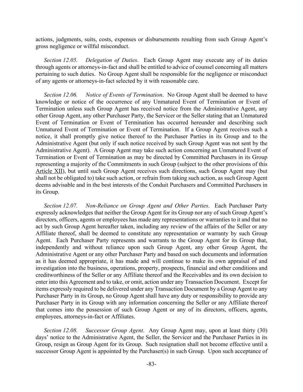 -83- actions, judgments, suits, costs, expenses or disbursements resulting from such Group Agent’s gross negligence or willful misconduct. Section 12.05. Delegation of Duties. Each Group Agent may execute any of its duties through agents or attorneys-in-fact and shall be entitled to advice of counsel concerning all matters pertaining to such duties. No Group Agent shall be responsible for the negligence or misconduct of any agents or attorneys-in-fact selected by it with reasonable care. Section 12.06. Notice of Events of Termination. No Group Agent shall be deemed to have knowledge or notice of the occurrence of any Unmatured Event of Termination or Event of Termination unless such Group Agent has received notice from the Administrative Agent, any other Group Agent, any other Purchaser Party, the Servicer or the Seller stating that an Unmatured Event of Termination or Event of Termination has occurred hereunder and describing such Unmatured Event of Termination or Event of Termination. If a Group Agent receives such a notice, it shall promptly give notice thereof to the Purchaser Parties in its Group and to the Administrative Agent (but only if such notice received by such Group Agent was not sent by the Administrative Agent). A Group Agent may take such action concerning an Unmatured Event of Termination or Event of Termination as may be directed by Committed Purchasers in its Group representing a majority of the Commitments in such Group (subject to the other provisions of this Article XII), but until such Group Agent receives such directions, such Group Agent may (but shall not be obligated to) take such action, or refrain from taking such action, as such Group Agent deems advisable and in the best interests of the Conduit Purchasers and Committed Purchasers in its Group. Section 12.07. Non-Reliance on Group Agent and Other Parties. Each Purchaser Party expressly acknowledges that neither the Group Agent for its Group nor any of such Group Agent’s directors, officers, agents or employees has made any representations or warranties to it and that no act by such Group Agent hereafter taken, including any review of the affairs of the Seller or any Affiliate thereof, shall be deemed to constitute any representation or warranty by such Group Agent. Each Purchaser Party represents and warrants to the Group Agent for its Group that, independently and without reliance upon such Group Agent, any other Group Agent, the Administrative Agent or any other Purchaser Party and based on such documents and information as it has deemed appropriate, it has made and will continue to make its own appraisal of and investigation into the business, operations, property, prospects, financial and other conditions and creditworthiness of the Seller or any Affiliate thereof and the Receivables and its own decision to enter into this Agreement and to take, or omit, action under any Transaction Document. Except for items expressly required to be delivered under any Transaction Document by a Group Agent to any Purchaser Party in its Group, no Group Agent shall have any duty or responsibility to provide any Purchaser Party in its Group with any information concerning the Seller or any Affiliate thereof that comes into the possession of such Group Agent or any of its directors, officers, agents, employees, attorneys-in-fact or Affiliates. Section 12.08. Successor Group Agent. Any Group Agent may, upon at least thirty (30) days’ notice to the Administrative Agent, the Seller, the Servicer and the Purchaser Parties in its Group, resign as Group Agent for its Group. Such resignation shall not become effective until a successor Group Agent is appointed by the Purchaser(s) in such Group. Upon such acceptance of