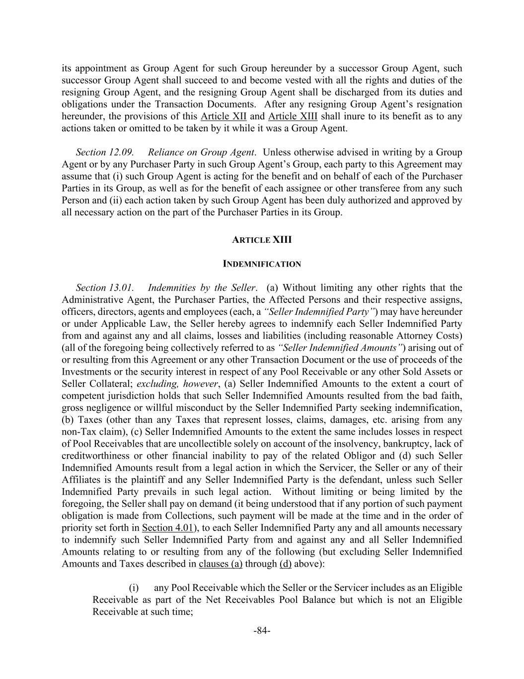 -84- its appointment as Group Agent for such Group hereunder by a successor Group Agent, such successor Group Agent shall succeed to and become vested with all the rights and duties of the resigning Group Agent, and the resigning Group Agent shall be discharged from its duties and obligations under the Transaction Documents. After any resigning Group Agent’s resignation hereunder, the provisions of this Article XII and Article XIII shall inure to its benefit as to any actions taken or omitted to be taken by it while it was a Group Agent. Section 12.09. Reliance on Group Agent. Unless otherwise advised in writing by a Group Agent or by any Purchaser Party in such Group Agent’s Group, each party to this Agreement may assume that (i) such Group Agent is acting for the benefit and on behalf of each of the Purchaser Parties in its Group, as well as for the benefit of each assignee or other transferee from any such Person and (ii) each action taken by such Group Agent has been duly authorized and approved by all necessary action on the part of the Purchaser Parties in its Group. ARTICLE XIII INDEMNIFICATION Section 13.01. Indemnities by the Seller. (a) Without limiting any other rights that the Administrative Agent, the Purchaser Parties, the Affected Persons and their respective assigns, officers, directors, agents and employees (each, a “Seller Indemnified Party”) may have hereunder or under Applicable Law, the Seller hereby agrees to indemnify each Seller Indemnified Party from and against any and all claims, losses and liabilities (including reasonable Attorney Costs) (all of the foregoing being collectively referred to as “Seller Indemnified Amounts”) arising out of or resulting from this Agreement or any other Transaction Document or the use of proceeds of the Investments or the security interest in respect of any Pool Receivable or any other Sold Assets or Seller Collateral; excluding, however, (a) Seller Indemnified Amounts to the extent a court of competent jurisdiction holds that such Seller Indemnified Amounts resulted from the bad faith, gross negligence or willful misconduct by the Seller Indemnified Party seeking indemnification, (b) Taxes (other than any Taxes that represent losses, claims, damages, etc. arising from any non-Tax claim), (c) Seller Indemnified Amounts to the extent the same includes losses in respect of Pool Receivables that are uncollectible solely on account of the insolvency, bankruptcy, lack of creditworthiness or other financial inability to pay of the related Obligor and (d) such Seller Indemnified Amounts result from a legal action in which the Servicer, the Seller or any of their Affiliates is the plaintiff and any Seller Indemnified Party is the defendant, unless such Seller Indemnified Party prevails in such legal action. Without limiting or being limited by the foregoing, the Seller shall pay on demand (it being understood that if any portion of such payment obligation is made from Collections, such payment will be made at the time and in the order of priority set forth in Section 4.01), to each Seller Indemnified Party any and all amounts necessary to indemnify such Seller Indemnified Party from and against any and all Seller Indemnified Amounts relating to or resulting from any of the following (but excluding Seller Indemnified Amounts and Taxes described in clauses (a) through (d) above): (i) any Pool Receivable which the Seller or the Servicer includes as an Eligible Receivable as part of the Net Receivables Pool Balance but which is not an Eligible Receivable at such time;