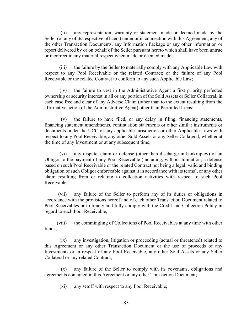 -85- (ii) any representation, warranty or statement made or deemed made by the Seller (or any of its respective officers) under or in connection with this Agreement, any of the other Transaction Documents, any Information Package or any other information or report delivered by or on behalf of the Seller pursuant hereto which shall have been untrue or incorrect in any material respect when made or deemed made; (iii) the failure by the Seller to materially comply with any Applicable Law with respect to any Pool Receivable or the related Contract; or the failure of any Pool Receivable or the related Contract to conform to any such Applicable Law; (iv) the failure to vest in the Administrative Agent a first priority perfected ownership or security interest in all or any portion of the Sold Assets or Seller Collateral, in each case free and clear of any Adverse Claim (other than to the extent resulting from the affirmative action of the Administrative Agent) other than Permitted Liens; (v) the failure to have filed, or any delay in filing, financing statements, financing statement amendments, continuation statements or other similar instruments or documents under the UCC of any applicable jurisdiction or other Applicable Laws with respect to any Pool Receivable, any other Sold Assets or any Seller Collateral, whether at the time of any Investment or at any subsequent time; (vi) any dispute, claim or defense (other than discharge in bankruptcy) of an Obligor to the payment of any Pool Receivable (including, without limitation, a defense based on such Pool Receivable or the related Contract not being a legal, valid and binding obligation of such Obligor enforceable against it in accordance with its terms), or any other claim resulting from or relating to collection activities with respect to such Pool Receivable; (vii) any failure of the Seller to perform any of its duties or obligations in accordance with the provisions hereof and of each other Transaction Document related to Pool Receivables or to timely and fully comply with the Credit and Collection Policy in regard to each Pool Receivable; (viii) the commingling of Collections of Pool Receivables at any time with other funds; (ix) any investigation, litigation or proceeding (actual or threatened) related to this Agreement or any other Transaction Document or the use of proceeds of any Investments or in respect of any Pool Receivable, any other Sold Assets or any Seller Collateral or any related Contract; (x) any failure of the Seller to comply with its covenants, obligations and agreements contained in this Agreement or any other Transaction Document; (xi) any setoff with respect to any Pool Receivable;