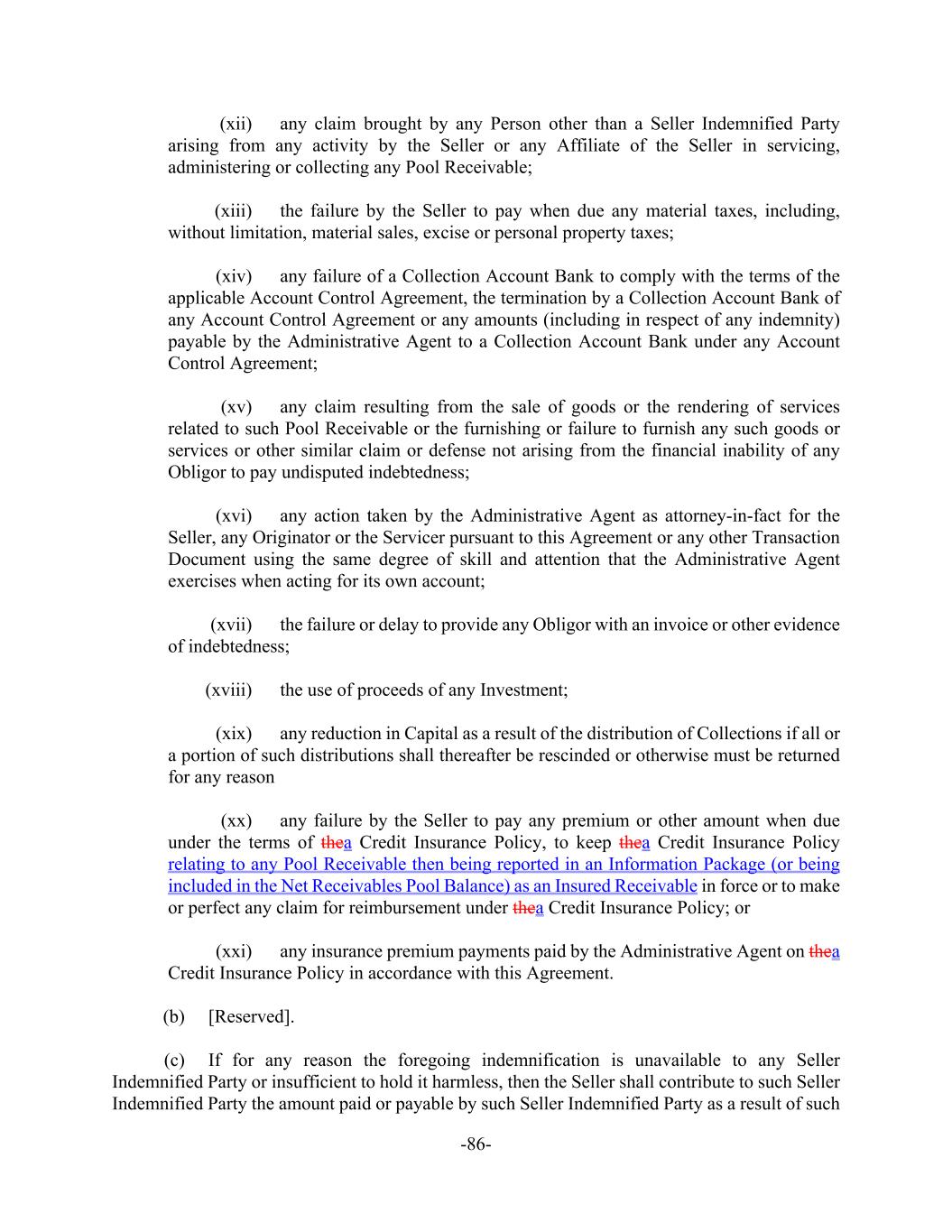 -86- (xii) any claim brought by any Person other than a Seller Indemnified Party arising from any activity by the Seller or any Affiliate of the Seller in servicing, administering or collecting any Pool Receivable; (xiii) the failure by the Seller to pay when due any material taxes, including, without limitation, material sales, excise or personal property taxes; (xiv) any failure of a Collection Account Bank to comply with the terms of the applicable Account Control Agreement, the termination by a Collection Account Bank of any Account Control Agreement or any amounts (including in respect of any indemnity) payable by the Administrative Agent to a Collection Account Bank under any Account Control Agreement; (xv) any claim resulting from the sale of goods or the rendering of services related to such Pool Receivable or the furnishing or failure to furnish any such goods or services or other similar claim or defense not arising from the financial inability of any Obligor to pay undisputed indebtedness; (xvi) any action taken by the Administrative Agent as attorney-in-fact for the Seller, any Originator or the Servicer pursuant to this Agreement or any other Transaction Document using the same degree of skill and attention that the Administrative Agent exercises when acting for its own account; (xvii) the failure or delay to provide any Obligor with an invoice or other evidence of indebtedness; (xviii) the use of proceeds of any Investment; (xix) any reduction in Capital as a result of the distribution of Collections if all or a portion of such distributions shall thereafter be rescinded or otherwise must be returned for any reason (xx) any failure by the Seller to pay any premium or other amount when due under the terms of thea Credit Insurance Policy, to keep thea Credit Insurance Policy relating to any Pool Receivable then being reported in an Information Package (or being included in the Net Receivables Pool Balance) as an Insured Receivable in force or to make or perfect any claim for reimbursement under thea Credit Insurance Policy; or (xxi) any insurance premium payments paid by the Administrative Agent on thea Credit Insurance Policy in accordance with this Agreement. (b) [Reserved]. (c) If for any reason the foregoing indemnification is unavailable to any Seller Indemnified Party or insufficient to hold it harmless, then the Seller shall contribute to such Seller Indemnified Party the amount paid or payable by such Seller Indemnified Party as a result of such