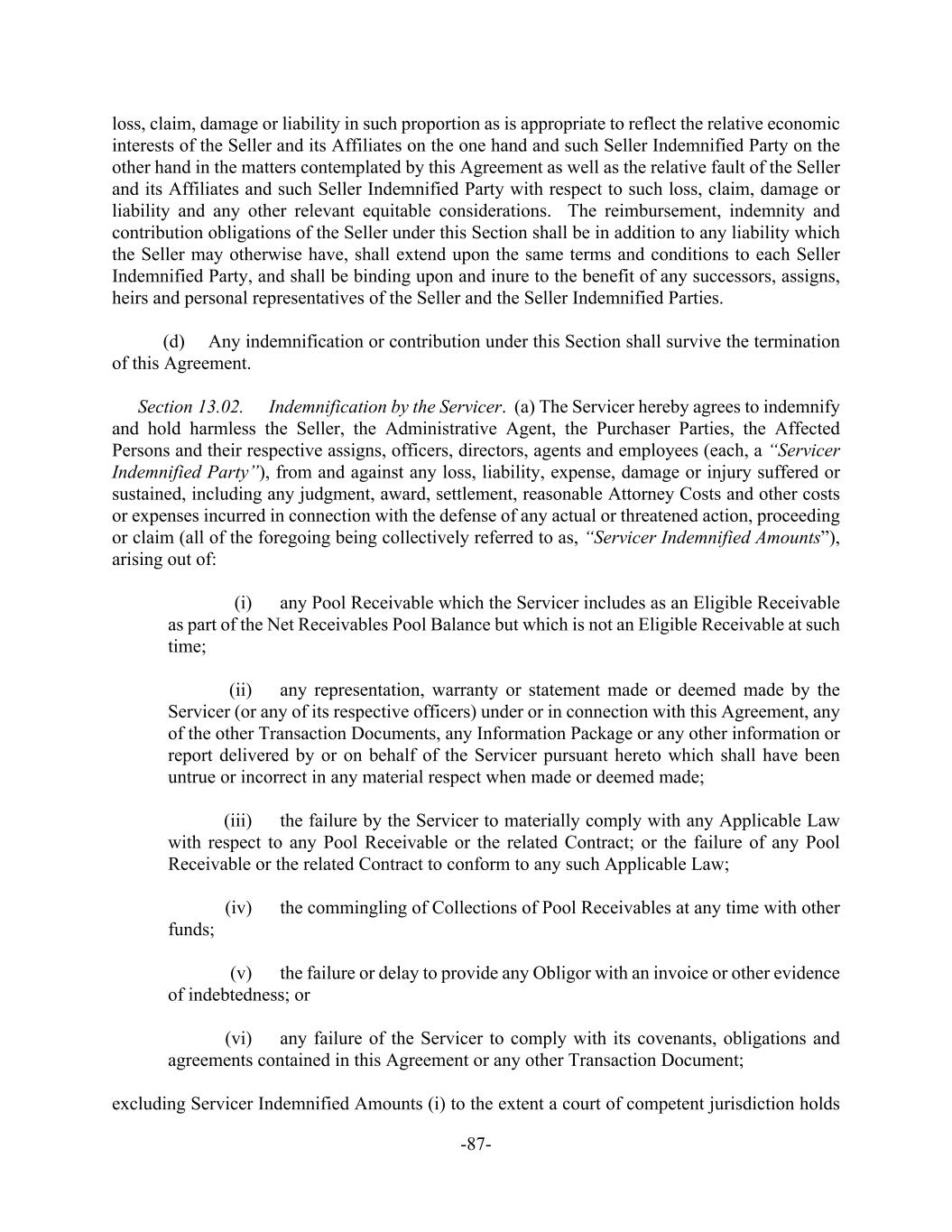 -87- loss, claim, damage or liability in such proportion as is appropriate to reflect the relative economic interests of the Seller and its Affiliates on the one hand and such Seller Indemnified Party on the other hand in the matters contemplated by this Agreement as well as the relative fault of the Seller and its Affiliates and such Seller Indemnified Party with respect to such loss, claim, damage or liability and any other relevant equitable considerations. The reimbursement, indemnity and contribution obligations of the Seller under this Section shall be in addition to any liability which the Seller may otherwise have, shall extend upon the same terms and conditions to each Seller Indemnified Party, and shall be binding upon and inure to the benefit of any successors, assigns, heirs and personal representatives of the Seller and the Seller Indemnified Parties. (d) Any indemnification or contribution under this Section shall survive the termination of this Agreement. Section 13.02. Indemnification by the Servicer. (a) The Servicer hereby agrees to indemnify and hold harmless the Seller, the Administrative Agent, the Purchaser Parties, the Affected Persons and their respective assigns, officers, directors, agents and employees (each, a “Servicer Indemnified Party”), from and against any loss, liability, expense, damage or injury suffered or sustained, including any judgment, award, settlement, reasonable Attorney Costs and other costs or expenses incurred in connection with the defense of any actual or threatened action, proceeding or claim (all of the foregoing being collectively referred to as, “Servicer Indemnified Amounts”), arising out of: (i) any Pool Receivable which the Servicer includes as an Eligible Receivable as part of the Net Receivables Pool Balance but which is not an Eligible Receivable at such time; (ii) any representation, warranty or statement made or deemed made by the Servicer (or any of its respective officers) under or in connection with this Agreement, any of the other Transaction Documents, any Information Package or any other information or report delivered by or on behalf of the Servicer pursuant hereto which shall have been untrue or incorrect in any material respect when made or deemed made; (iii) the failure by the Servicer to materially comply with any Applicable Law with respect to any Pool Receivable or the related Contract; or the failure of any Pool Receivable or the related Contract to conform to any such Applicable Law; (iv) the commingling of Collections of Pool Receivables at any time with other funds; (v) the failure or delay to provide any Obligor with an invoice or other evidence of indebtedness; or (vi) any failure of the Servicer to comply with its covenants, obligations and agreements contained in this Agreement or any other Transaction Document; excluding Servicer Indemnified Amounts (i) to the extent a court of competent jurisdiction holds