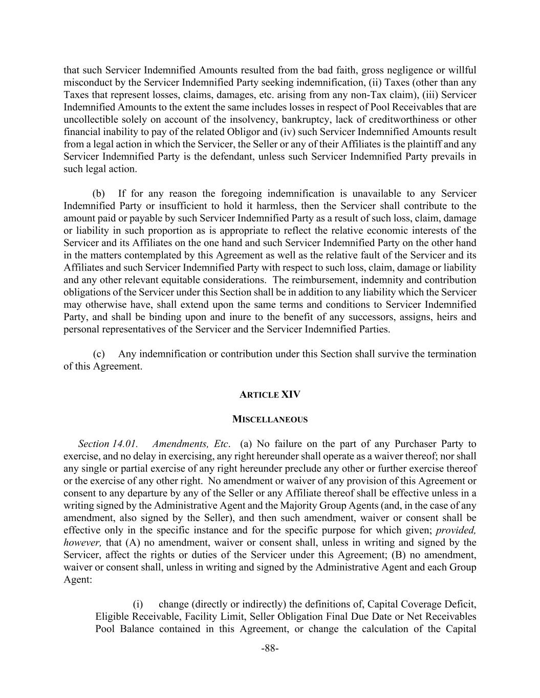 -88- that such Servicer Indemnified Amounts resulted from the bad faith, gross negligence or willful misconduct by the Servicer Indemnified Party seeking indemnification, (ii) Taxes (other than any Taxes that represent losses, claims, damages, etc. arising from any non-Tax claim), (iii) Servicer Indemnified Amounts to the extent the same includes losses in respect of Pool Receivables that are uncollectible solely on account of the insolvency, bankruptcy, lack of creditworthiness or other financial inability to pay of the related Obligor and (iv) such Servicer Indemnified Amounts result from a legal action in which the Servicer, the Seller or any of their Affiliates is the plaintiff and any Servicer Indemnified Party is the defendant, unless such Servicer Indemnified Party prevails in such legal action. (b) If for any reason the foregoing indemnification is unavailable to any Servicer Indemnified Party or insufficient to hold it harmless, then the Servicer shall contribute to the amount paid or payable by such Servicer Indemnified Party as a result of such loss, claim, damage or liability in such proportion as is appropriate to reflect the relative economic interests of the Servicer and its Affiliates on the one hand and such Servicer Indemnified Party on the other hand in the matters contemplated by this Agreement as well as the relative fault of the Servicer and its Affiliates and such Servicer Indemnified Party with respect to such loss, claim, damage or liability and any other relevant equitable considerations. The reimbursement, indemnity and contribution obligations of the Servicer under this Section shall be in addition to any liability which the Servicer may otherwise have, shall extend upon the same terms and conditions to Servicer Indemnified Party, and shall be binding upon and inure to the benefit of any successors, assigns, heirs and personal representatives of the Servicer and the Servicer Indemnified Parties. (c) Any indemnification or contribution under this Section shall survive the termination of this Agreement. ARTICLE XIV MISCELLANEOUS Section 14.01. Amendments, Etc. (a) No failure on the part of any Purchaser Party to exercise, and no delay in exercising, any right hereunder shall operate as a waiver thereof; nor shall any single or partial exercise of any right hereunder preclude any other or further exercise thereof or the exercise of any other right. No amendment or waiver of any provision of this Agreement or consent to any departure by any of the Seller or any Affiliate thereof shall be effective unless in a writing signed by the Administrative Agent and the Majority Group Agents (and, in the case of any amendment, also signed by the Seller), and then such amendment, waiver or consent shall be effective only in the specific instance and for the specific purpose for which given; provided, however, that (A) no amendment, waiver or consent shall, unless in writing and signed by the Servicer, affect the rights or duties of the Servicer under this Agreement; (B) no amendment, waiver or consent shall, unless in writing and signed by the Administrative Agent and each Group Agent: (i) change (directly or indirectly) the definitions of, Capital Coverage Deficit, Eligible Receivable, Facility Limit, Seller Obligation Final Due Date or Net Receivables Pool Balance contained in this Agreement, or change the calculation of the Capital