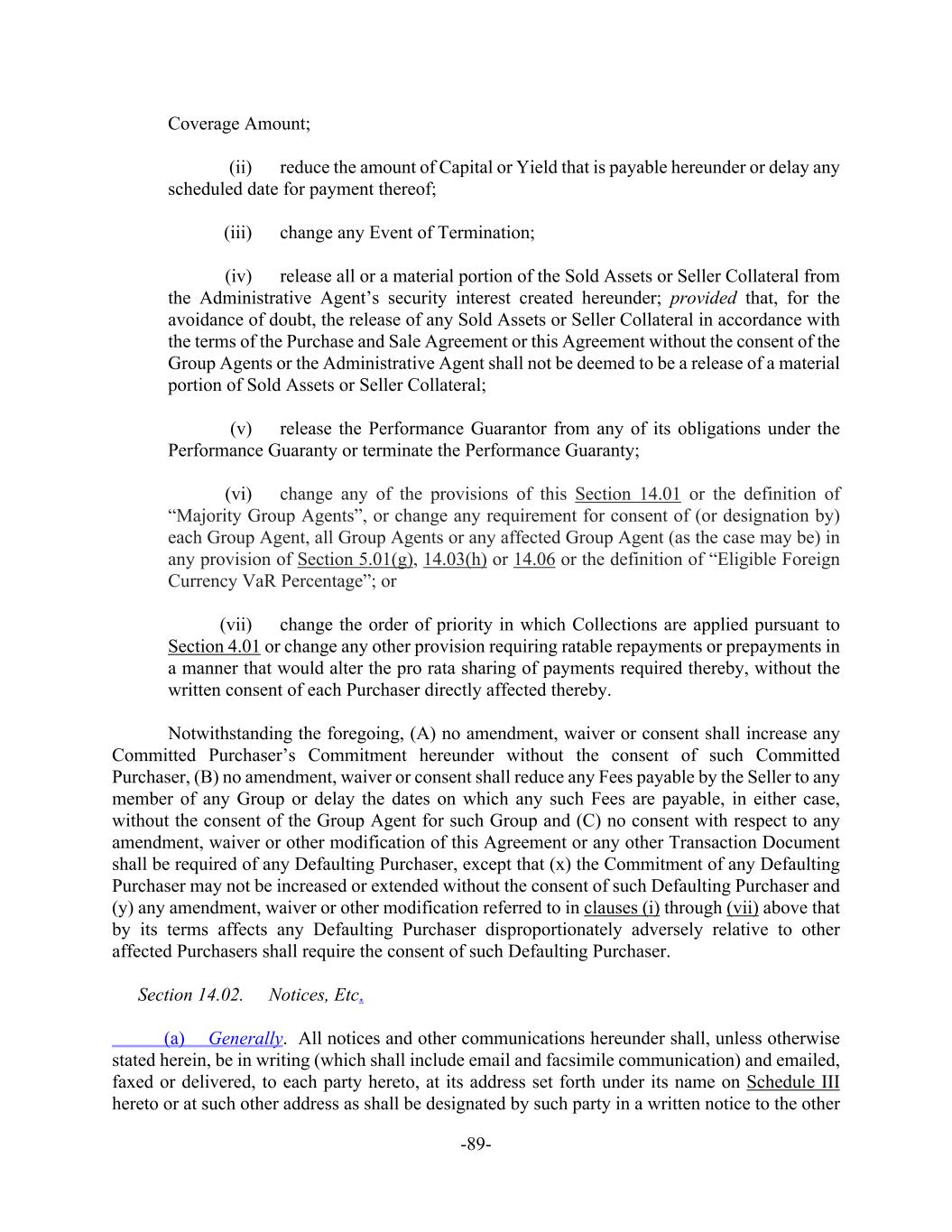 -89- Coverage Amount; (ii) reduce the amount of Capital or Yield that is payable hereunder or delay any scheduled date for payment thereof; (iii) change any Event of Termination; (iv) release all or a material portion of the Sold Assets or Seller Collateral from the Administrative Agent’s security interest created hereunder; provided that, for the avoidance of doubt, the release of any Sold Assets or Seller Collateral in accordance with the terms of the Purchase and Sale Agreement or this Agreement without the consent of the Group Agents or the Administrative Agent shall not be deemed to be a release of a material portion of Sold Assets or Seller Collateral; (v) release the Performance Guarantor from any of its obligations under the Performance Guaranty or terminate the Performance Guaranty; (vi) change any of the provisions of this Section 14.01 or the definition of “Majority Group Agents”, or change any requirement for consent of (or designation by) each Group Agent, all Group Agents or any affected Group Agent (as the case may be) in any provision of Section 5.01(g), 14.03(h) or 14.06 or the definition of “Eligible Foreign Currency VaR Percentage”; or (vii) change the order of priority in which Collections are applied pursuant to Section 4.01 or change any other provision requiring ratable repayments or prepayments in a manner that would alter the pro rata sharing of payments required thereby, without the written consent of each Purchaser directly affected thereby. Notwithstanding the foregoing, (A) no amendment, waiver or consent shall increase any Committed Purchaser’s Commitment hereunder without the consent of such Committed Purchaser, (B) no amendment, waiver or consent shall reduce any Fees payable by the Seller to any member of any Group or delay the dates on which any such Fees are payable, in either case, without the consent of the Group Agent for such Group and (C) no consent with respect to any amendment, waiver or other modification of this Agreement or any other Transaction Document shall be required of any Defaulting Purchaser, except that (x) the Commitment of any Defaulting Purchaser may not be increased or extended without the consent of such Defaulting Purchaser and (y) any amendment, waiver or other modification referred to in clauses (i) through (vii) above that by its terms affects any Defaulting Purchaser disproportionately adversely relative to other affected Purchasers shall require the consent of such Defaulting Purchaser. Section 14.02. Notices, Etc. (a) Generally. All notices and other communications hereunder shall, unless otherwise stated herein, be in writing (which shall include email and facsimile communication) and emailed, faxed or delivered, to each party hereto, at its address set forth under its name on Schedule III hereto or at such other address as shall be designated by such party in a written notice to the other