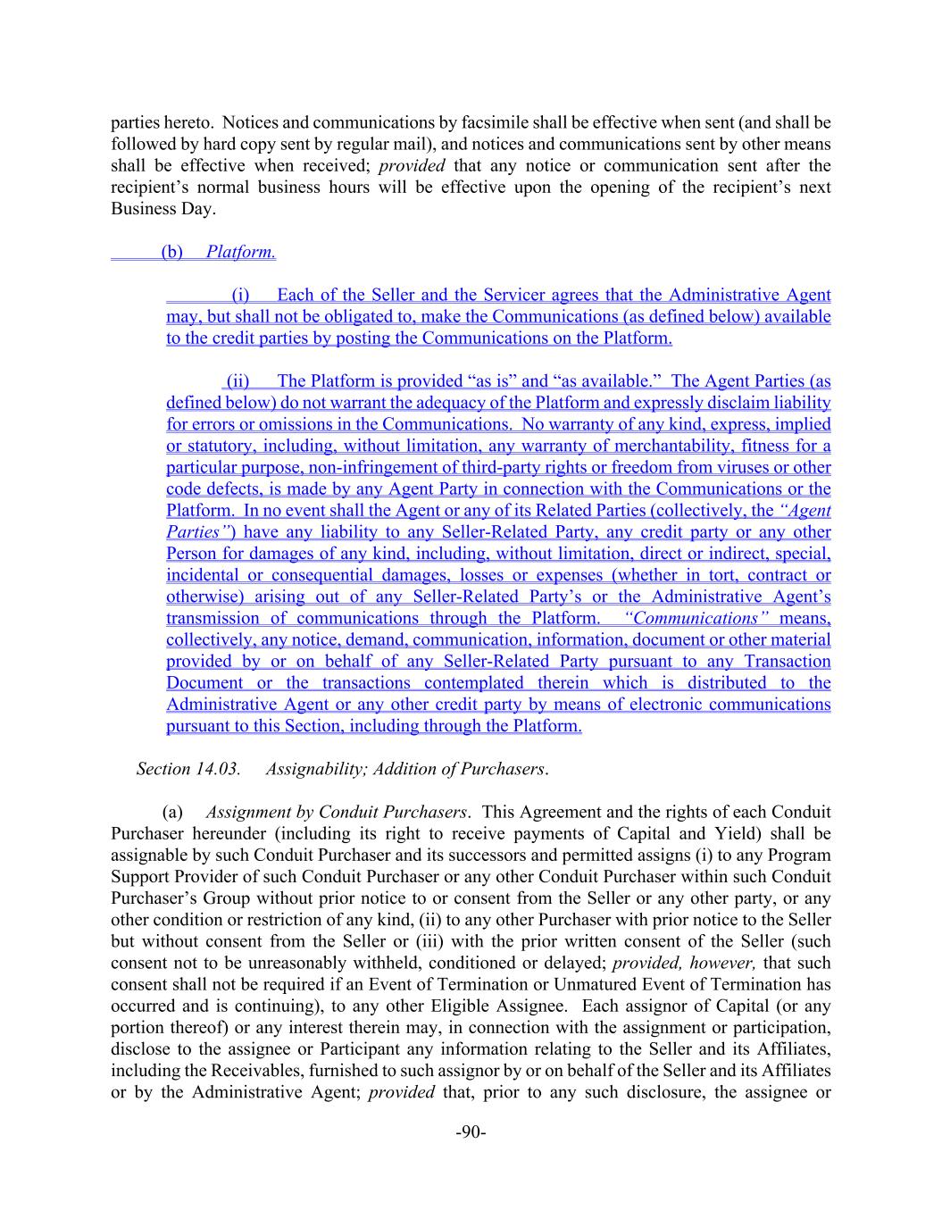 -90- parties hereto. Notices and communications by facsimile shall be effective when sent (and shall be followed by hard copy sent by regular mail), and notices and communications sent by other means shall be effective when received; provided that any notice or communication sent after the recipient’s normal business hours will be effective upon the opening of the recipient’s next Business Day. (b) Platform. (i) Each of the Seller and the Servicer agrees that the Administrative Agent may, but shall not be obligated to, make the Communications (as defined below) available to the credit parties by posting the Communications on the Platform. (ii) The Platform is provided “as is” and “as available.” The Agent Parties (as defined below) do not warrant the adequacy of the Platform and expressly disclaim liability for errors or omissions in the Communications. No warranty of any kind, express, implied or statutory, including, without limitation, any warranty of merchantability, fitness for a particular purpose, non-infringement of third-party rights or freedom from viruses or other code defects, is made by any Agent Party in connection with the Communications or the Platform. In no event shall the Agent or any of its Related Parties (collectively, the “Agent Parties”) have any liability to any Seller-Related Party, any credit party or any other Person for damages of any kind, including, without limitation, direct or indirect, special, incidental or consequential damages, losses or expenses (whether in tort, contract or otherwise) arising out of any Seller-Related Party’s or the Administrative Agent’s transmission of communications through the Platform. “Communications” means, collectively, any notice, demand, communication, information, document or other material provided by or on behalf of any Seller-Related Party pursuant to any Transaction Document or the transactions contemplated therein which is distributed to the Administrative Agent or any other credit party by means of electronic communications pursuant to this Section, including through the Platform. Section 14.03. Assignability; Addition of Purchasers. (a) Assignment by Conduit Purchasers. This Agreement and the rights of each Conduit Purchaser hereunder (including its right to receive payments of Capital and Yield) shall be assignable by such Conduit Purchaser and its successors and permitted assigns (i) to any Program Support Provider of such Conduit Purchaser or any other Conduit Purchaser within such Conduit Purchaser’s Group without prior notice to or consent from the Seller or any other party, or any other condition or restriction of any kind, (ii) to any other Purchaser with prior notice to the Seller but without consent from the Seller or (iii) with the prior written consent of the Seller (such consent not to be unreasonably withheld, conditioned or delayed; provided, however, that such consent shall not be required if an Event of Termination or Unmatured Event of Termination has occurred and is continuing), to any other Eligible Assignee. Each assignor of Capital (or any portion thereof) or any interest therein may, in connection with the assignment or participation, disclose to the assignee or Participant any information relating to the Seller and its Affiliates, including the Receivables, furnished to such assignor by or on behalf of the Seller and its Affiliates or by the Administrative Agent; provided that, prior to any such disclosure, the assignee or