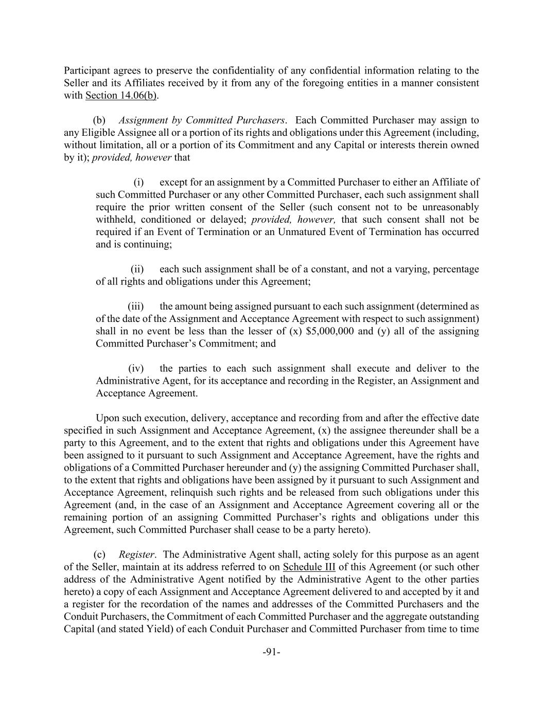 -91- Participant agrees to preserve the confidentiality of any confidential information relating to the Seller and its Affiliates received by it from any of the foregoing entities in a manner consistent with Section 14.06(b). (b) Assignment by Committed Purchasers. Each Committed Purchaser may assign to any Eligible Assignee all or a portion of its rights and obligations under this Agreement (including, without limitation, all or a portion of its Commitment and any Capital or interests therein owned by it); provided, however that (i) except for an assignment by a Committed Purchaser to either an Affiliate of such Committed Purchaser or any other Committed Purchaser, each such assignment shall require the prior written consent of the Seller (such consent not to be unreasonably withheld, conditioned or delayed; provided, however, that such consent shall not be required if an Event of Termination or an Unmatured Event of Termination has occurred and is continuing; (ii) each such assignment shall be of a constant, and not a varying, percentage of all rights and obligations under this Agreement; (iii) the amount being assigned pursuant to each such assignment (determined as of the date of the Assignment and Acceptance Agreement with respect to such assignment) shall in no event be less than the lesser of (x) $5,000,000 and (y) all of the assigning Committed Purchaser’s Commitment; and (iv) the parties to each such assignment shall execute and deliver to the Administrative Agent, for its acceptance and recording in the Register, an Assignment and Acceptance Agreement. Upon such execution, delivery, acceptance and recording from and after the effective date specified in such Assignment and Acceptance Agreement, (x) the assignee thereunder shall be a party to this Agreement, and to the extent that rights and obligations under this Agreement have been assigned to it pursuant to such Assignment and Acceptance Agreement, have the rights and obligations of a Committed Purchaser hereunder and (y) the assigning Committed Purchaser shall, to the extent that rights and obligations have been assigned by it pursuant to such Assignment and Acceptance Agreement, relinquish such rights and be released from such obligations under this Agreement (and, in the case of an Assignment and Acceptance Agreement covering all or the remaining portion of an assigning Committed Purchaser’s rights and obligations under this Agreement, such Committed Purchaser shall cease to be a party hereto). (c) Register. The Administrative Agent shall, acting solely for this purpose as an agent of the Seller, maintain at its address referred to on Schedule III of this Agreement (or such other address of the Administrative Agent notified by the Administrative Agent to the other parties hereto) a copy of each Assignment and Acceptance Agreement delivered to and accepted by it and a register for the recordation of the names and addresses of the Committed Purchasers and the Conduit Purchasers, the Commitment of each Committed Purchaser and the aggregate outstanding Capital (and stated Yield) of each Conduit Purchaser and Committed Purchaser from time to time
