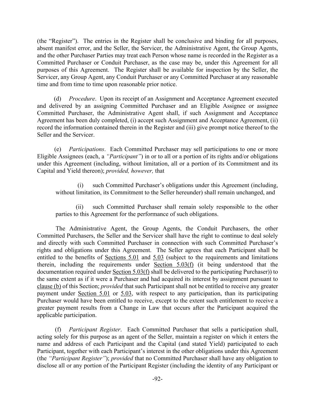 -92- (the “Register”). The entries in the Register shall be conclusive and binding for all purposes, absent manifest error, and the Seller, the Servicer, the Administrative Agent, the Group Agents, and the other Purchaser Parties may treat each Person whose name is recorded in the Register as a Committed Purchaser or Conduit Purchaser, as the case may be, under this Agreement for all purposes of this Agreement. The Register shall be available for inspection by the Seller, the Servicer, any Group Agent, any Conduit Purchaser or any Committed Purchaser at any reasonable time and from time to time upon reasonable prior notice. (d) Procedure. Upon its receipt of an Assignment and Acceptance Agreement executed and delivered by an assigning Committed Purchaser and an Eligible Assignee or assignee Committed Purchaser, the Administrative Agent shall, if such Assignment and Acceptance Agreement has been duly completed, (i) accept such Assignment and Acceptance Agreement, (ii) record the information contained therein in the Register and (iii) give prompt notice thereof to the Seller and the Servicer. (e) Participations. Each Committed Purchaser may sell participations to one or more Eligible Assignees (each, a “Participant”) in or to all or a portion of its rights and/or obligations under this Agreement (including, without limitation, all or a portion of its Commitment and its Capital and Yield thereon); provided, however, that (i) such Committed Purchaser’s obligations under this Agreement (including, without limitation, its Commitment to the Seller hereunder) shall remain unchanged, and (ii) such Committed Purchaser shall remain solely responsible to the other parties to this Agreement for the performance of such obligations. The Administrative Agent, the Group Agents, the Conduit Purchasers, the other Committed Purchasers, the Seller and the Servicer shall have the right to continue to deal solely and directly with such Committed Purchaser in connection with such Committed Purchaser’s rights and obligations under this Agreement. The Seller agrees that each Participant shall be entitled to the benefits of Sections 5.01 and 5.03 (subject to the requirements and limitations therein, including the requirements under Section 5.03(f) (it being understood that the documentation required under Section 5.03(f) shall be delivered to the participating Purchaser)) to the same extent as if it were a Purchaser and had acquired its interest by assignment pursuant to clause (b) of this Section; provided that such Participant shall not be entitled to receive any greater payment under Section 5.01 or 5.03, with respect to any participation, than its participating Purchaser would have been entitled to receive, except to the extent such entitlement to receive a greater payment results from a Change in Law that occurs after the Participant acquired the applicable participation. (f) Participant Register. Each Committed Purchaser that sells a participation shall, acting solely for this purpose as an agent of the Seller, maintain a register on which it enters the name and address of each Participant and the Capital (and stated Yield) participated to each Participant, together with each Participant’s interest in the other obligations under this Agreement (the “Participant Register”); provided that no Committed Purchaser shall have any obligation to disclose all or any portion of the Participant Register (including the identity of any Participant or