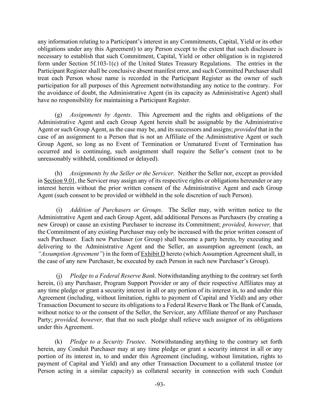 -93- any information relating to a Participant’s interest in any Commitments, Capital, Yield or its other obligations under any this Agreement) to any Person except to the extent that such disclosure is necessary to establish that such Commitment, Capital, Yield or other obligation is in registered form under Section 5f.103-1(c) of the United States Treasury Regulations. The entries in the Participant Register shall be conclusive absent manifest error, and such Committed Purchaser shall treat each Person whose name is recorded in the Participant Register as the owner of such participation for all purposes of this Agreement notwithstanding any notice to the contrary. For the avoidance of doubt, the Administrative Agent (in its capacity as Administrative Agent) shall have no responsibility for maintaining a Participant Register. (g) Assignments by Agents. This Agreement and the rights and obligations of the Administrative Agent and each Group Agent herein shall be assignable by the Administrative Agent or such Group Agent, as the case may be, and its successors and assigns; provided that in the case of an assignment to a Person that is not an Affiliate of the Administrative Agent or such Group Agent, so long as no Event of Termination or Unmatured Event of Termination has occurred and is continuing, such assignment shall require the Seller’s consent (not to be unreasonably withheld, conditioned or delayed). (h) Assignments by the Seller or the Servicer. Neither the Seller nor, except as provided in Section 9.01, the Servicer may assign any of its respective rights or obligations hereunder or any interest herein without the prior written consent of the Administrative Agent and each Group Agent (such consent to be provided or withheld in the sole discretion of such Person). (i) Addition of Purchasers or Groups. The Seller may, with written notice to the Administrative Agent and each Group Agent, add additional Persons as Purchasers (by creating a new Group) or cause an existing Purchaser to increase its Commitment; provided, however, that the Commitment of any existing Purchaser may only be increased with the prior written consent of such Purchaser. Each new Purchaser (or Group) shall become a party hereto, by executing and delivering to the Administrative Agent and the Seller, an assumption agreement (each, an “Assumption Agreement”) in the form of Exhibit D hereto (which Assumption Agreement shall, in the case of any new Purchaser, be executed by each Person in such new Purchaser’s Group). (j) Pledge to a Federal Reserve Bank. Notwithstanding anything to the contrary set forth herein, (i) any Purchaser, Program Support Provider or any of their respective Affiliates may at any time pledge or grant a security interest in all or any portion of its interest in, to and under this Agreement (including, without limitation, rights to payment of Capital and Yield) and any other Transaction Document to secure its obligations to a Federal Reserve Bank or The Bank of Canada, without notice to or the consent of the Seller, the Servicer, any Affiliate thereof or any Purchaser Party; provided, however, that that no such pledge shall relieve such assignor of its obligations under this Agreement. (k) Pledge to a Security Trustee. Notwithstanding anything to the contrary set forth herein, any Conduit Purchaser may at any time pledge or grant a security interest in all or any portion of its interest in, to and under this Agreement (including, without limitation, rights to payment of Capital and Yield) and any other Transaction Document to a collateral trustee (or Person acting in a similar capacity) as collateral security in connection with such Conduit