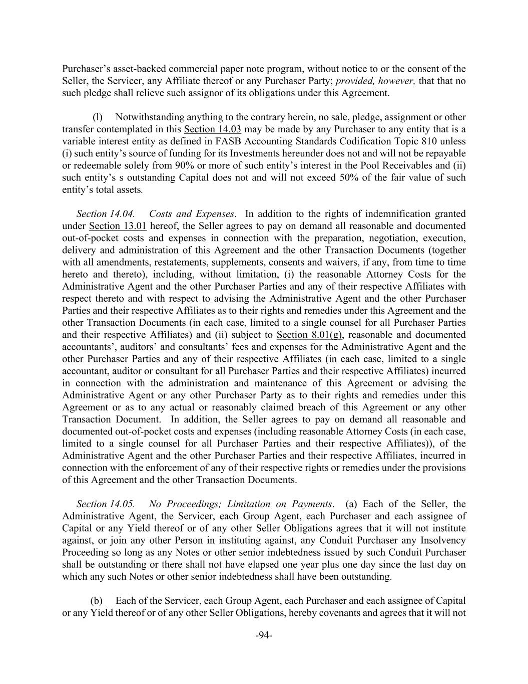 -94- Purchaser’s asset-backed commercial paper note program, without notice to or the consent of the Seller, the Servicer, any Affiliate thereof or any Purchaser Party; provided, however, that that no such pledge shall relieve such assignor of its obligations under this Agreement. (l) Notwithstanding anything to the contrary herein, no sale, pledge, assignment or other transfer contemplated in this Section 14.03 may be made by any Purchaser to any entity that is a variable interest entity as defined in FASB Accounting Standards Codification Topic 810 unless (i) such entity’s source of funding for its Investments hereunder does not and will not be repayable or redeemable solely from 90% or more of such entity’s interest in the Pool Receivables and (ii) such entity’s s outstanding Capital does not and will not exceed 50% of the fair value of such entity’s total assets. Section 14.04. Costs and Expenses. In addition to the rights of indemnification granted under Section 13.01 hereof, the Seller agrees to pay on demand all reasonable and documented out-of-pocket costs and expenses in connection with the preparation, negotiation, execution, delivery and administration of this Agreement and the other Transaction Documents (together with all amendments, restatements, supplements, consents and waivers, if any, from time to time hereto and thereto), including, without limitation, (i) the reasonable Attorney Costs for the Administrative Agent and the other Purchaser Parties and any of their respective Affiliates with respect thereto and with respect to advising the Administrative Agent and the other Purchaser Parties and their respective Affiliates as to their rights and remedies under this Agreement and the other Transaction Documents (in each case, limited to a single counsel for all Purchaser Parties and their respective Affiliates) and (ii) subject to Section 8.01(g), reasonable and documented accountants’, auditors’ and consultants’ fees and expenses for the Administrative Agent and the other Purchaser Parties and any of their respective Affiliates (in each case, limited to a single accountant, auditor or consultant for all Purchaser Parties and their respective Affiliates) incurred in connection with the administration and maintenance of this Agreement or advising the Administrative Agent or any other Purchaser Party as to their rights and remedies under this Agreement or as to any actual or reasonably claimed breach of this Agreement or any other Transaction Document. In addition, the Seller agrees to pay on demand all reasonable and documented out-of-pocket costs and expenses (including reasonable Attorney Costs (in each case, limited to a single counsel for all Purchaser Parties and their respective Affiliates)), of the Administrative Agent and the other Purchaser Parties and their respective Affiliates, incurred in connection with the enforcement of any of their respective rights or remedies under the provisions of this Agreement and the other Transaction Documents. Section 14.05. No Proceedings; Limitation on Payments. (a) Each of the Seller, the Administrative Agent, the Servicer, each Group Agent, each Purchaser and each assignee of Capital or any Yield thereof or of any other Seller Obligations agrees that it will not institute against, or join any other Person in instituting against, any Conduit Purchaser any Insolvency Proceeding so long as any Notes or other senior indebtedness issued by such Conduit Purchaser shall be outstanding or there shall not have elapsed one year plus one day since the last day on which any such Notes or other senior indebtedness shall have been outstanding. (b) Each of the Servicer, each Group Agent, each Purchaser and each assignee of Capital or any Yield thereof or of any other Seller Obligations, hereby covenants and agrees that it will not