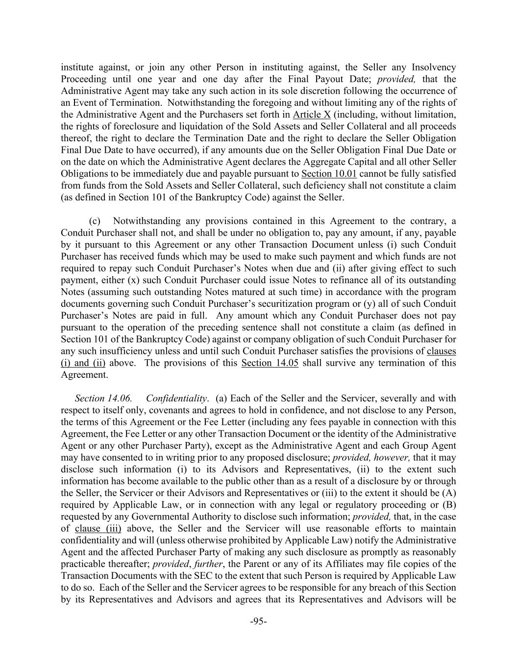 -95- institute against, or join any other Person in instituting against, the Seller any Insolvency Proceeding until one year and one day after the Final Payout Date; provided, that the Administrative Agent may take any such action in its sole discretion following the occurrence of an Event of Termination. Notwithstanding the foregoing and without limiting any of the rights of the Administrative Agent and the Purchasers set forth in Article X (including, without limitation, the rights of foreclosure and liquidation of the Sold Assets and Seller Collateral and all proceeds thereof, the right to declare the Termination Date and the right to declare the Seller Obligation Final Due Date to have occurred), if any amounts due on the Seller Obligation Final Due Date or on the date on which the Administrative Agent declares the Aggregate Capital and all other Seller Obligations to be immediately due and payable pursuant to Section 10.01 cannot be fully satisfied from funds from the Sold Assets and Seller Collateral, such deficiency shall not constitute a claim (as defined in Section 101 of the Bankruptcy Code) against the Seller. (c) Notwithstanding any provisions contained in this Agreement to the contrary, a Conduit Purchaser shall not, and shall be under no obligation to, pay any amount, if any, payable by it pursuant to this Agreement or any other Transaction Document unless (i) such Conduit Purchaser has received funds which may be used to make such payment and which funds are not required to repay such Conduit Purchaser’s Notes when due and (ii) after giving effect to such payment, either (x) such Conduit Purchaser could issue Notes to refinance all of its outstanding Notes (assuming such outstanding Notes matured at such time) in accordance with the program documents governing such Conduit Purchaser’s securitization program or (y) all of such Conduit Purchaser’s Notes are paid in full. Any amount which any Conduit Purchaser does not pay pursuant to the operation of the preceding sentence shall not constitute a claim (as defined in Section 101 of the Bankruptcy Code) against or company obligation of such Conduit Purchaser for any such insufficiency unless and until such Conduit Purchaser satisfies the provisions of clauses (i) and (ii) above. The provisions of this Section 14.05 shall survive any termination of this Agreement. Section 14.06. Confidentiality. (a) Each of the Seller and the Servicer, severally and with respect to itself only, covenants and agrees to hold in confidence, and not disclose to any Person, the terms of this Agreement or the Fee Letter (including any fees payable in connection with this Agreement, the Fee Letter or any other Transaction Document or the identity of the Administrative Agent or any other Purchaser Party), except as the Administrative Agent and each Group Agent may have consented to in writing prior to any proposed disclosure; provided, however, that it may disclose such information (i) to its Advisors and Representatives, (ii) to the extent such information has become available to the public other than as a result of a disclosure by or through the Seller, the Servicer or their Advisors and Representatives or (iii) to the extent it should be (A) required by Applicable Law, or in connection with any legal or regulatory proceeding or (B) requested by any Governmental Authority to disclose such information; provided, that, in the case of clause (iii) above, the Seller and the Servicer will use reasonable efforts to maintain confidentiality and will (unless otherwise prohibited by Applicable Law) notify the Administrative Agent and the affected Purchaser Party of making any such disclosure as promptly as reasonably practicable thereafter; provided, further, the Parent or any of its Affiliates may file copies of the Transaction Documents with the SEC to the extent that such Person is required by Applicable Law to do so. Each of the Seller and the Servicer agrees to be responsible for any breach of this Section by its Representatives and Advisors and agrees that its Representatives and Advisors will be