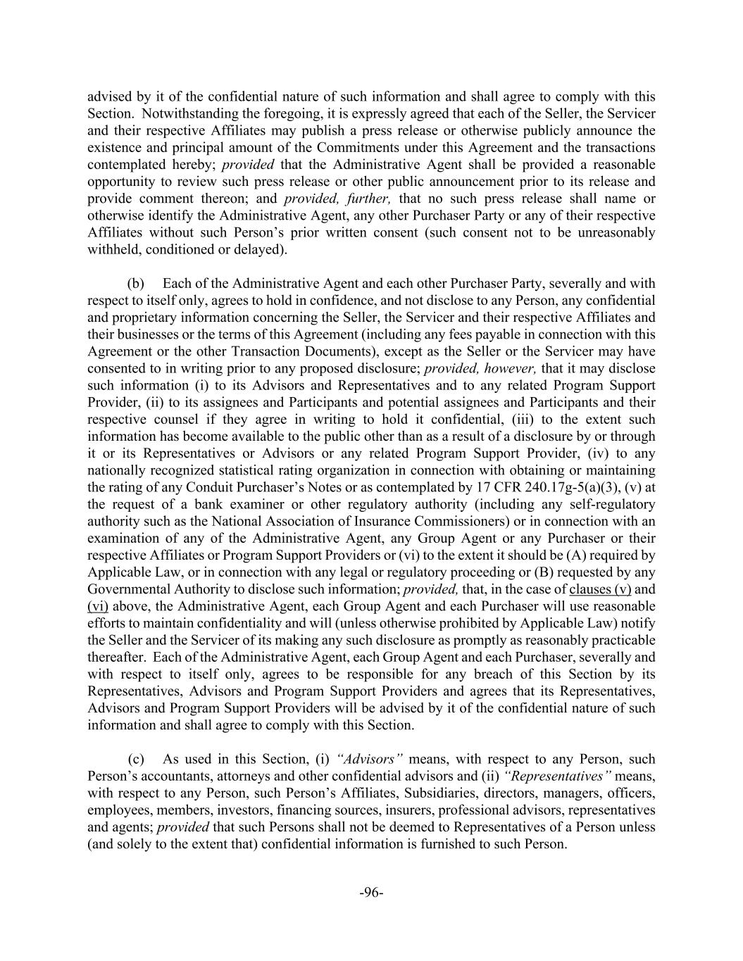 -96- advised by it of the confidential nature of such information and shall agree to comply with this Section. Notwithstanding the foregoing, it is expressly agreed that each of the Seller, the Servicer and their respective Affiliates may publish a press release or otherwise publicly announce the existence and principal amount of the Commitments under this Agreement and the transactions contemplated hereby; provided that the Administrative Agent shall be provided a reasonable opportunity to review such press release or other public announcement prior to its release and provide comment thereon; and provided, further, that no such press release shall name or otherwise identify the Administrative Agent, any other Purchaser Party or any of their respective Affiliates without such Person’s prior written consent (such consent not to be unreasonably withheld, conditioned or delayed). (b) Each of the Administrative Agent and each other Purchaser Party, severally and with respect to itself only, agrees to hold in confidence, and not disclose to any Person, any confidential and proprietary information concerning the Seller, the Servicer and their respective Affiliates and their businesses or the terms of this Agreement (including any fees payable in connection with this Agreement or the other Transaction Documents), except as the Seller or the Servicer may have consented to in writing prior to any proposed disclosure; provided, however, that it may disclose such information (i) to its Advisors and Representatives and to any related Program Support Provider, (ii) to its assignees and Participants and potential assignees and Participants and their respective counsel if they agree in writing to hold it confidential, (iii) to the extent such information has become available to the public other than as a result of a disclosure by or through it or its Representatives or Advisors or any related Program Support Provider, (iv) to any nationally recognized statistical rating organization in connection with obtaining or maintaining the rating of any Conduit Purchaser’s Notes or as contemplated by 17 CFR 240.17g-5(a)(3), (v) at the request of a bank examiner or other regulatory authority (including any self-regulatory authority such as the National Association of Insurance Commissioners) or in connection with an examination of any of the Administrative Agent, any Group Agent or any Purchaser or their respective Affiliates or Program Support Providers or (vi) to the extent it should be (A) required by Applicable Law, or in connection with any legal or regulatory proceeding or (B) requested by any Governmental Authority to disclose such information; provided, that, in the case of clauses (v) and (vi) above, the Administrative Agent, each Group Agent and each Purchaser will use reasonable efforts to maintain confidentiality and will (unless otherwise prohibited by Applicable Law) notify the Seller and the Servicer of its making any such disclosure as promptly as reasonably practicable thereafter. Each of the Administrative Agent, each Group Agent and each Purchaser, severally and with respect to itself only, agrees to be responsible for any breach of this Section by its Representatives, Advisors and Program Support Providers and agrees that its Representatives, Advisors and Program Support Providers will be advised by it of the confidential nature of such information and shall agree to comply with this Section. (c) As used in this Section, (i) “Advisors” means, with respect to any Person, such Person’s accountants, attorneys and other confidential advisors and (ii) “Representatives” means, with respect to any Person, such Person’s Affiliates, Subsidiaries, directors, managers, officers, employees, members, investors, financing sources, insurers, professional advisors, representatives and agents; provided that such Persons shall not be deemed to Representatives of a Person unless (and solely to the extent that) confidential information is furnished to such Person.