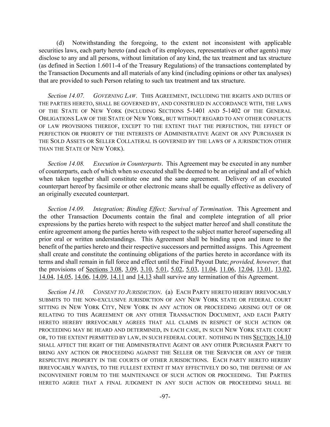 -97- (d) Notwithstanding the foregoing, to the extent not inconsistent with applicable securities laws, each party hereto (and each of its employees, representatives or other agents) may disclose to any and all persons, without limitation of any kind, the tax treatment and tax structure (as defined in Section 1.6011-4 of the Treasury Regulations) of the transactions contemplated by the Transaction Documents and all materials of any kind (including opinions or other tax analyses) that are provided to such Person relating to such tax treatment and tax structure. Section 14.07. GOVERNING LAW. THIS AGREEMENT, INCLUDING THE RIGHTS AND DUTIES OF THE PARTIES HERETO, SHALL BE GOVERNED BY, AND CONSTRUED IN ACCORDANCE WITH, THE LAWS OF THE STATE OF NEW YORK (INCLUDING SECTIONS 5-1401 AND 5-1402 OF THE GENERAL OBLIGATIONS LAW OF THE STATE OF NEW YORK, BUT WITHOUT REGARD TO ANY OTHER CONFLICTS OF LAW PROVISIONS THEREOF, EXCEPT TO THE EXTENT THAT THE PERFECTION, THE EFFECT OF PERFECTION OR PRIORITY OF THE INTERESTS OF ADMINISTRATIVE AGENT OR ANY PURCHASER IN THE SOLD ASSETS OR SELLER COLLATERAL IS GOVERNED BY THE LAWS OF A JURISDICTION OTHER THAN THE STATE OF NEW YORK). Section 14.08. Execution in Counterparts. This Agreement may be executed in any number of counterparts, each of which when so executed shall be deemed to be an original and all of which when taken together shall constitute one and the same agreement. Delivery of an executed counterpart hereof by facsimile or other electronic means shall be equally effective as delivery of an originally executed counterpart. Section 14.09. Integration; Binding Effect; Survival of Termination. This Agreement and the other Transaction Documents contain the final and complete integration of all prior expressions by the parties hereto with respect to the subject matter hereof and shall constitute the entire agreement among the parties hereto with respect to the subject matter hereof superseding all prior oral or written understandings. This Agreement shall be binding upon and inure to the benefit of the parties hereto and their respective successors and permitted assigns. This Agreement shall create and constitute the continuing obligations of the parties hereto in accordance with its terms and shall remain in full force and effect until the Final Payout Date; provided, however, that the provisions of Sections 3.08, 3.09, 3.10, 5.01, 5.02, 5.03, 11.04, 11.06, 12.04, 13.01, 13.02, 14.04, 14.05, 14.06, 14.09, 14.11 and 14.13 shall survive any termination of this Agreement. Section 14.10. CONSENT TO JURISDICTION. (a) EACH PARTY HERETO HEREBY IRREVOCABLY SUBMITS TO THE NON-EXCLUSIVE JURISDICTION OF ANY NEW YORK STATE OR FEDERAL COURT SITTING IN NEW YORK CITY, NEW YORK IN ANY ACTION OR PROCEEDING ARISING OUT OF OR RELATING TO THIS AGREEMENT OR ANY OTHER TRANSACTION DOCUMENT, AND EACH PARTY HERETO HEREBY IRREVOCABLY AGREES THAT ALL CLAIMS IN RESPECT OF SUCH ACTION OR PROCEEDING MAY BE HEARD AND DETERMINED, IN EACH CASE, IN SUCH NEW YORK STATE COURT OR, TO THE EXTENT PERMITTED BY LAW, IN SUCH FEDERAL COURT. NOTHING IN THIS SECTION 14.10 SHALL AFFECT THE RIGHT OF THE ADMINISTRATIVE AGENT OR ANY OTHER PURCHASER PARTY TO BRING ANY ACTION OR PROCEEDING AGAINST THE SELLER OR THE SERVICER OR ANY OF THEIR RESPECTIVE PROPERTY IN THE COURTS OF OTHER JURISDICTIONS. EACH PARTY HERETO HEREBY IRREVOCABLY WAIVES, TO THE FULLEST EXTENT IT MAY EFFECTIVELY DO SO, THE DEFENSE OF AN INCONVENIENT FORUM TO THE MAINTENANCE OF SUCH ACTION OR PROCEEDING. THE PARTIES HERETO AGREE THAT A FINAL JUDGMENT IN ANY SUCH ACTION OR PROCEEDING SHALL BE