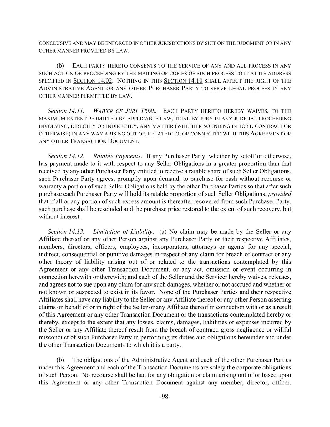 -98- CONCLUSIVE AND MAY BE ENFORCED IN OTHER JURISDICTIONS BY SUIT ON THE JUDGMENT OR IN ANY OTHER MANNER PROVIDED BY LAW. (b) EACH PARTY HERETO CONSENTS TO THE SERVICE OF ANY AND ALL PROCESS IN ANY SUCH ACTION OR PROCEEDING BY THE MAILING OF COPIES OF SUCH PROCESS TO IT AT ITS ADDRESS SPECIFIED IN SECTION 14.02. NOTHING IN THIS SECTION 14.10 SHALL AFFECT THE RIGHT OF THE ADMINISTRATIVE AGENT OR ANY OTHER PURCHASER PARTY TO SERVE LEGAL PROCESS IN ANY OTHER MANNER PERMITTED BY LAW. Section 14.11. WAIVER OF JURY TRIAL. EACH PARTY HERETO HEREBY WAIVES, TO THE MAXIMUM EXTENT PERMITTED BY APPLICABLE LAW, TRIAL BY JURY IN ANY JUDICIAL PROCEEDING INVOLVING, DIRECTLY OR INDIRECTLY, ANY MATTER (WHETHER SOUNDING IN TORT, CONTRACT OR OTHERWISE) IN ANY WAY ARISING OUT OF, RELATED TO, OR CONNECTED WITH THIS AGREEMENT OR ANY OTHER TRANSACTION DOCUMENT. Section 14.12. Ratable Payments. If any Purchaser Party, whether by setoff or otherwise, has payment made to it with respect to any Seller Obligations in a greater proportion than that received by any other Purchaser Party entitled to receive a ratable share of such Seller Obligations, such Purchaser Party agrees, promptly upon demand, to purchase for cash without recourse or warranty a portion of such Seller Obligations held by the other Purchaser Parties so that after such purchase each Purchaser Party will hold its ratable proportion of such Seller Obligations; provided that if all or any portion of such excess amount is thereafter recovered from such Purchaser Party, such purchase shall be rescinded and the purchase price restored to the extent of such recovery, but without interest. Section 14.13. Limitation of Liability. (a) No claim may be made by the Seller or any Affiliate thereof or any other Person against any Purchaser Party or their respective Affiliates, members, directors, officers, employees, incorporators, attorneys or agents for any special, indirect, consequential or punitive damages in respect of any claim for breach of contract or any other theory of liability arising out of or related to the transactions contemplated by this Agreement or any other Transaction Document, or any act, omission or event occurring in connection herewith or therewith; and each of the Seller and the Servicer hereby waives, releases, and agrees not to sue upon any claim for any such damages, whether or not accrued and whether or not known or suspected to exist in its favor. None of the Purchaser Parties and their respective Affiliates shall have any liability to the Seller or any Affiliate thereof or any other Person asserting claims on behalf of or in right of the Seller or any Affiliate thereof in connection with or as a result of this Agreement or any other Transaction Document or the transactions contemplated hereby or thereby, except to the extent that any losses, claims, damages, liabilities or expenses incurred by the Seller or any Affiliate thereof result from the breach of contract, gross negligence or willful misconduct of such Purchaser Party in performing its duties and obligations hereunder and under the other Transaction Documents to which it is a party. (b) The obligations of the Administrative Agent and each of the other Purchaser Parties under this Agreement and each of the Transaction Documents are solely the corporate obligations of such Person. No recourse shall be had for any obligation or claim arising out of or based upon this Agreement or any other Transaction Document against any member, director, officer,